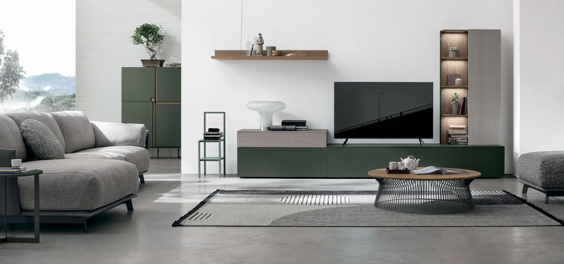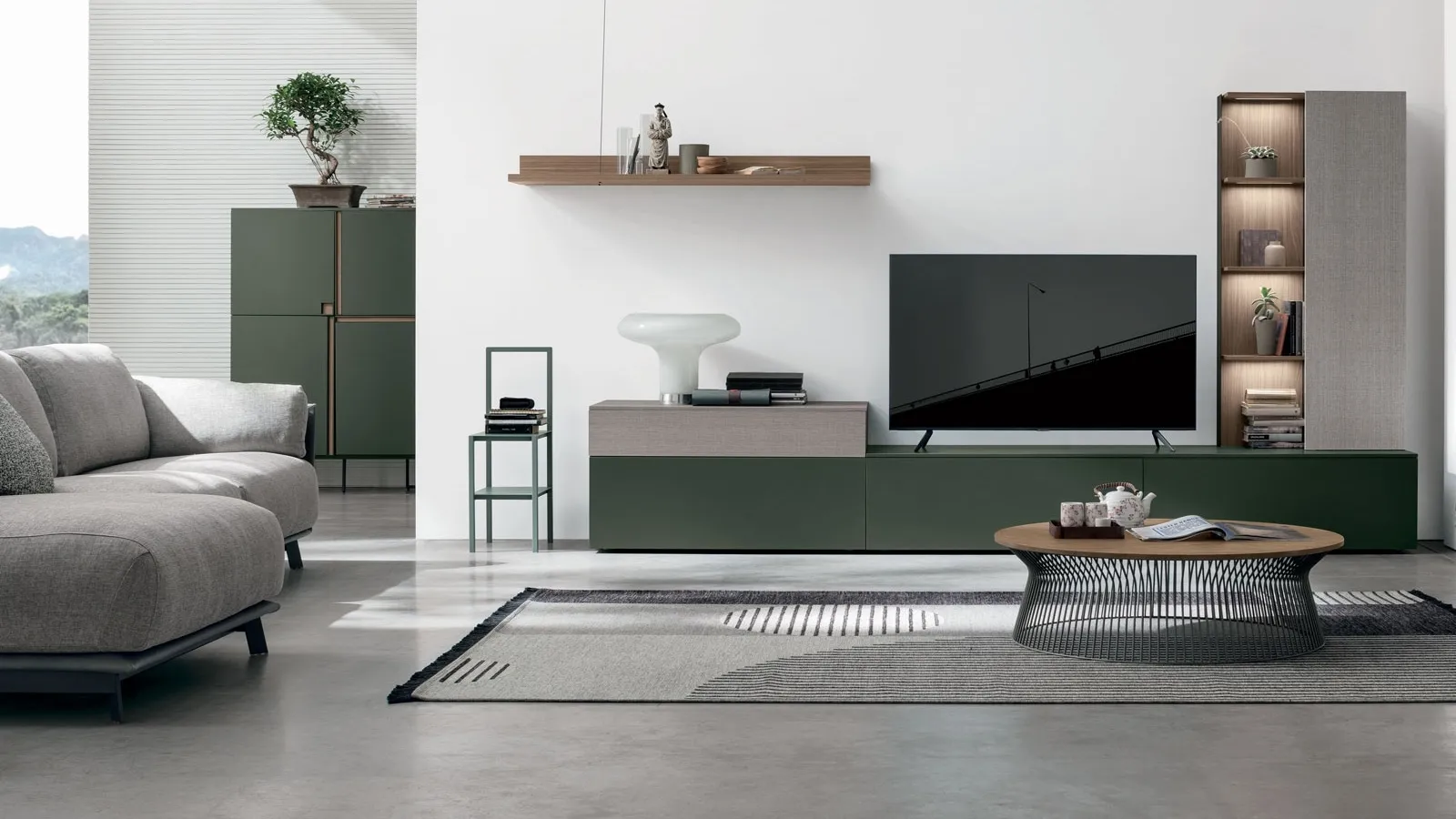 La parete attrezzata Atlante UNIT AT116 di Tomasella rappresenta una soluzione d'arredo evoluta e modulare, concepita per integrare funzionalità e estetica nel living contemporaneo. Si distingue per la sua composizione, che armonizza la tattilità delle finiture materiche, quali il noce ambra e l'alpaca, con l'eleganza del laccato opaco bosco 168. Dettagli strutturali in metallo antracite 160 completano il design, enfatizzando la robustezza e la raffinatezza. Questa sinergia di elementi materici e cromatici è studiata per valorizzare la naturalità delle venature, offrendo una composizione dal carattere distintivo e un'elevata capacità di adattamento agli spazi moderni. La flessibilità progettuale e l'ampia gamma di personalizzazioni disponibili consentono di configurare la parete attrezzata in base alle specifiche esigenze di spazio e stile, garantendo un'integrazione ottimale in qualsiasi contesto abitativo.