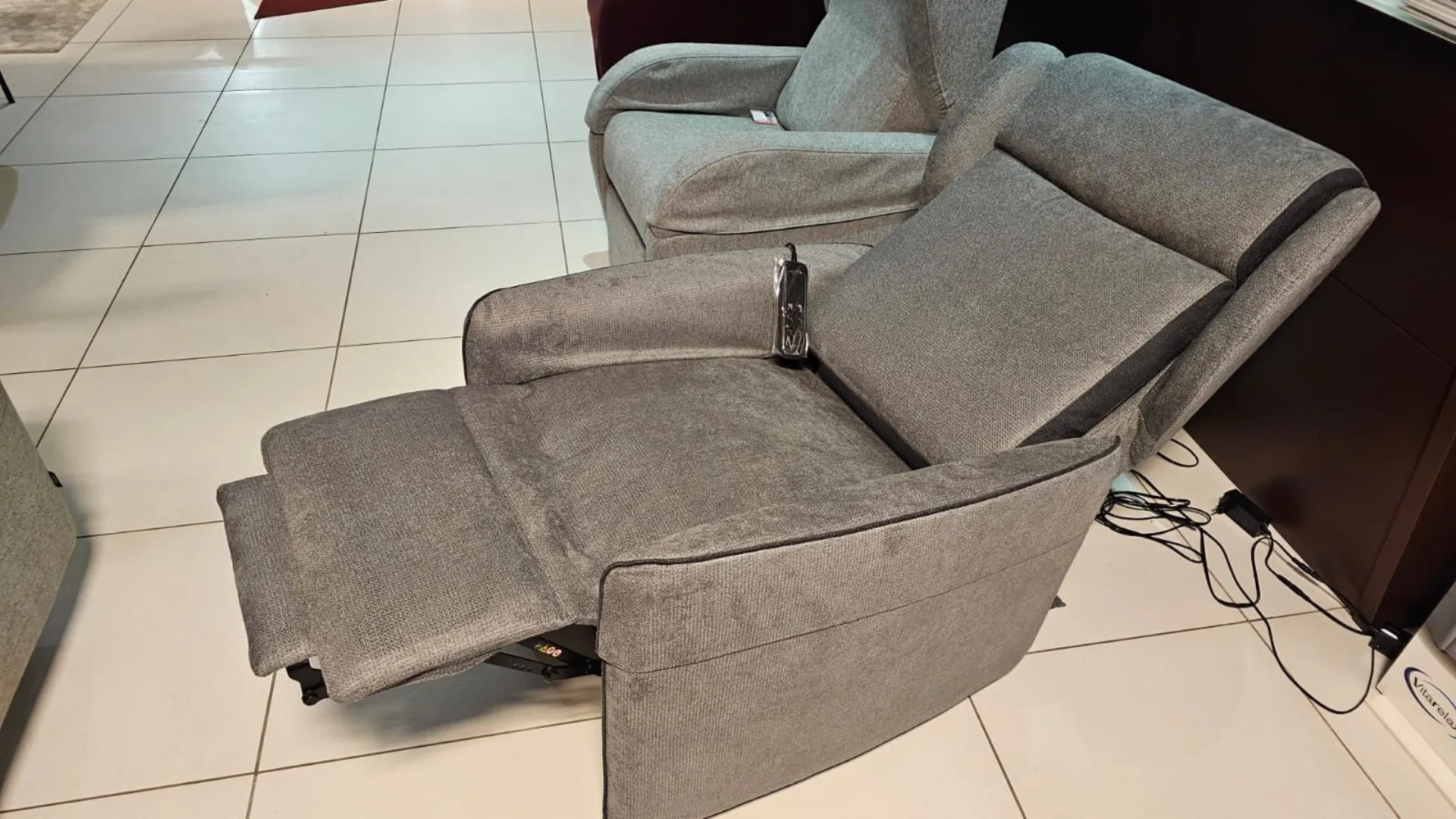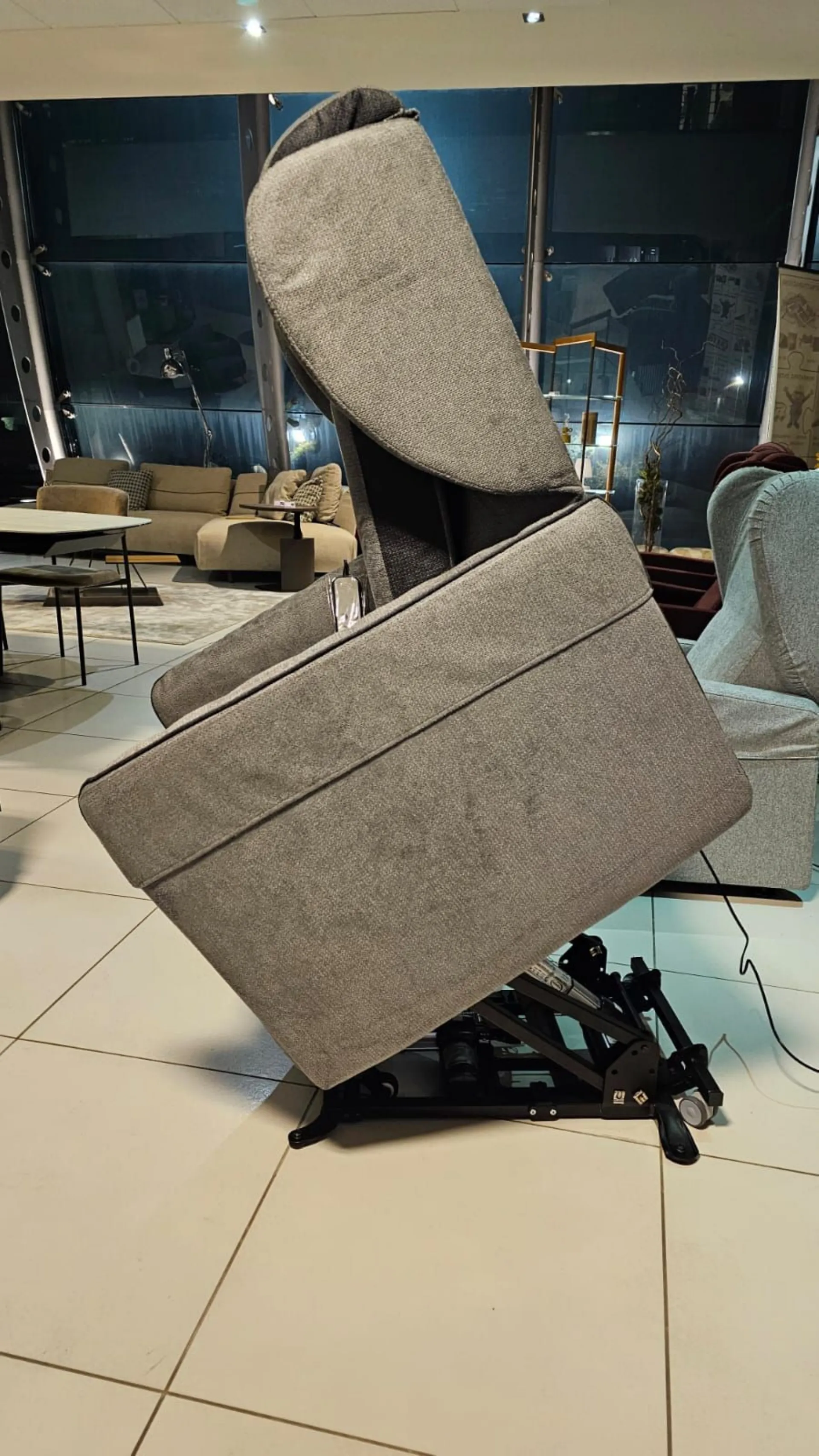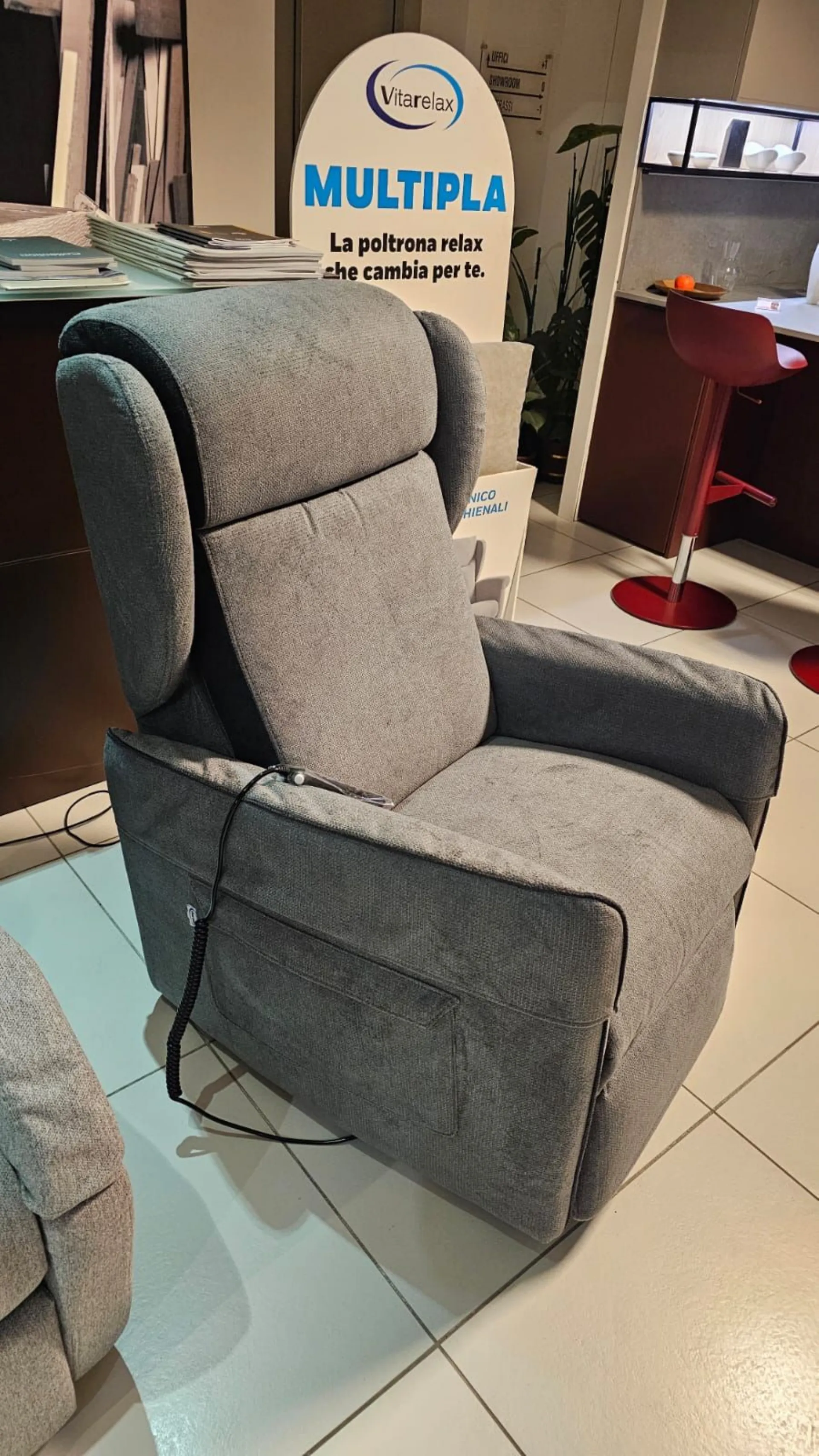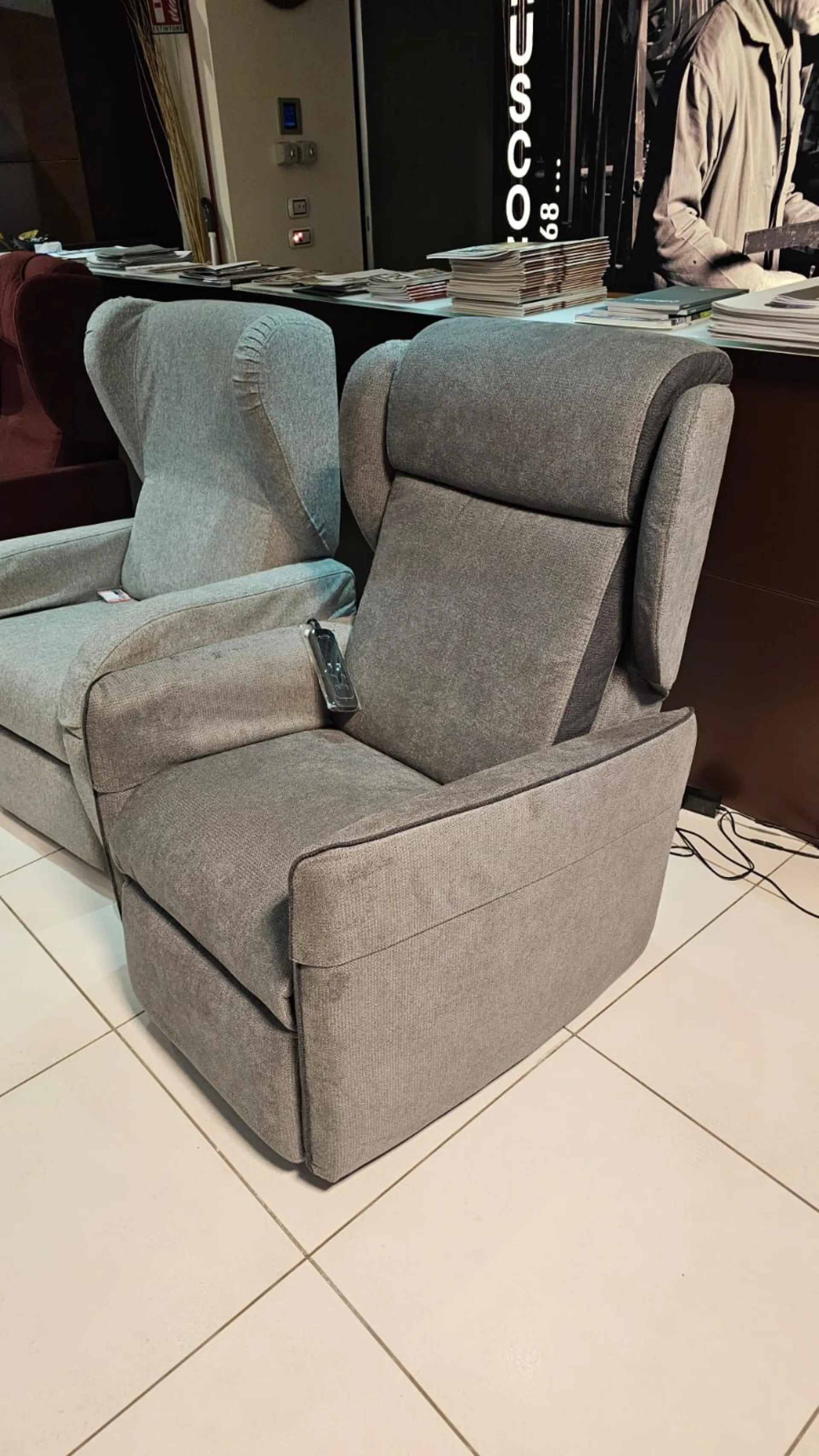 Relax armchair model ANDROMEDA, removable fabric upholstery except for the backrest, equipped with motorized roller Click&Roll, predisposition for battery, double footrest, kit of armrest cover covers, possibility of managing the contrast stitching, deductible medical device class 1, TV position, dimensions cm. 75x93depth.x113h. (at maximum extension the overall depth measurement becomes 168 cm)