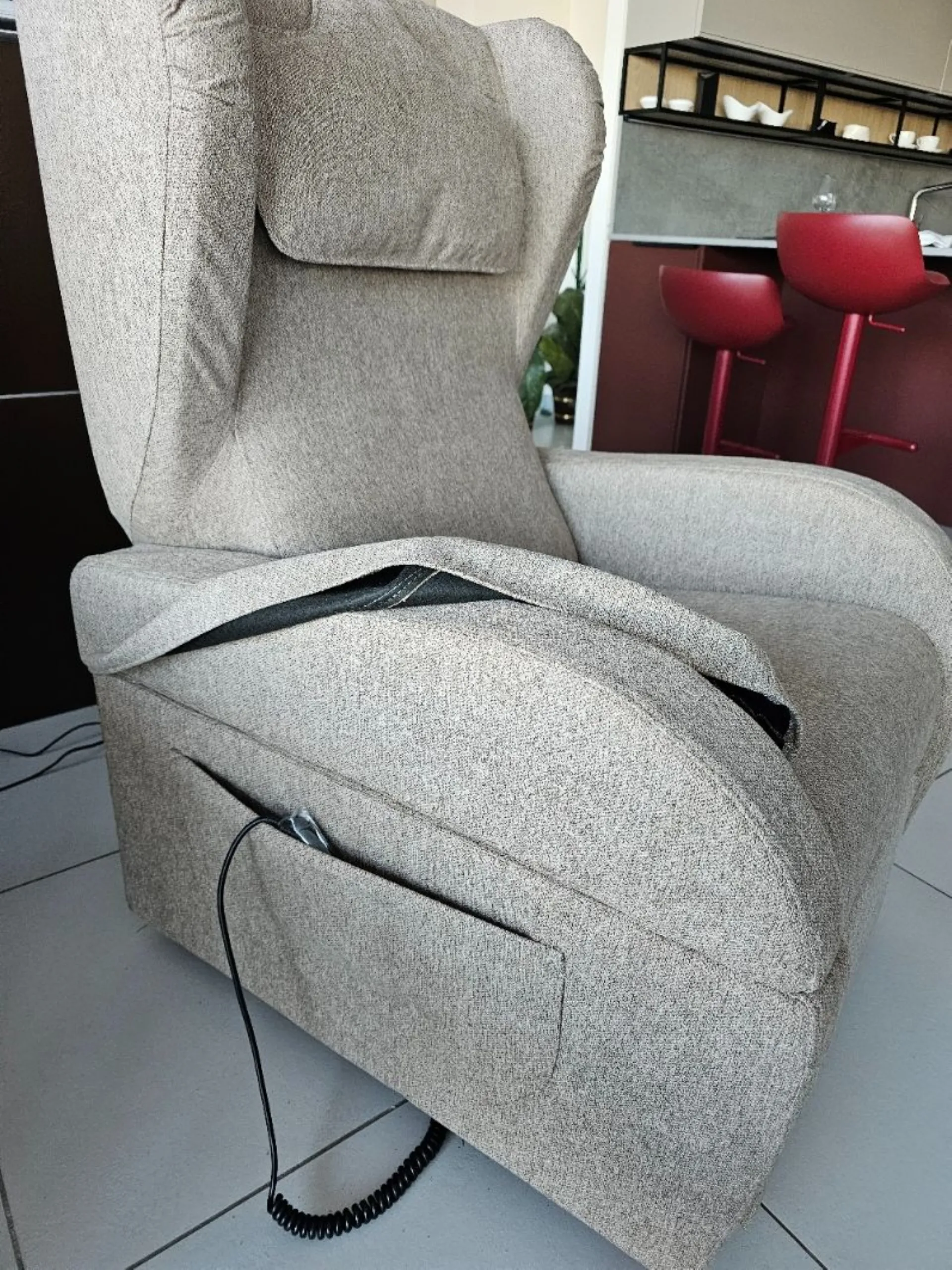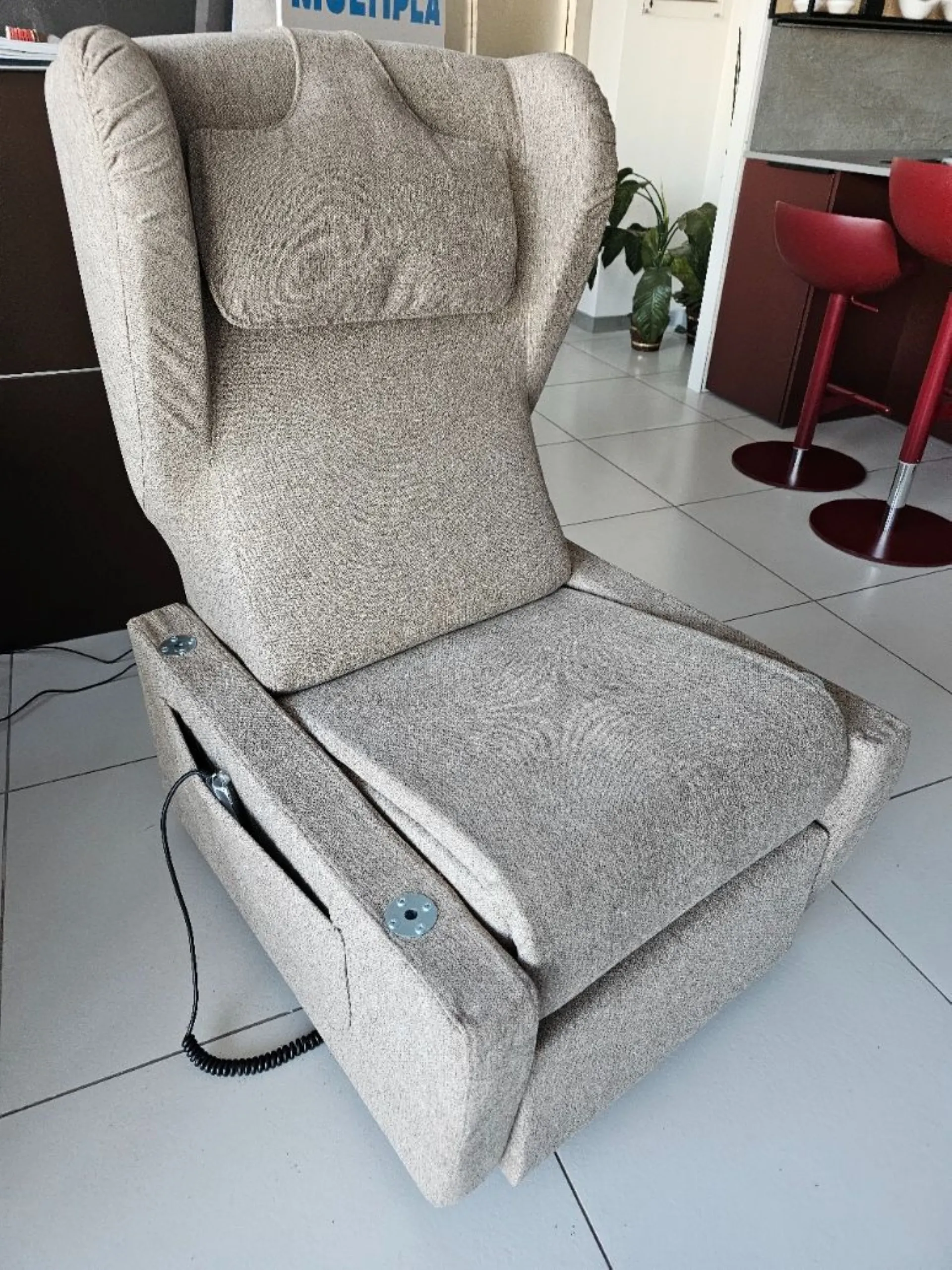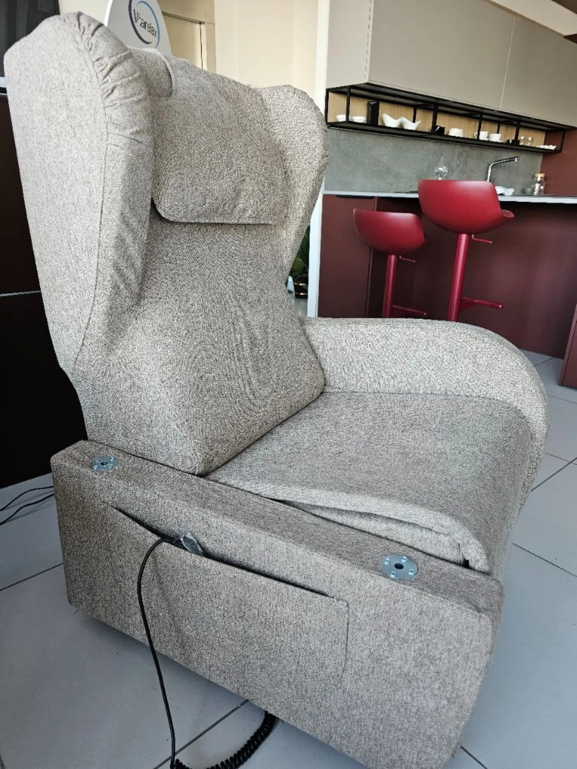 Translation: Relax armchair model ANNA PLUS measuring cm L.69xW.82xH.111 with removable fabric upholstery in art.BULL col.3. This model comes with removable armrests, double footrest, armrest covers, and roller kit. It is a medical device eligible for a 19% tax deduction and can be purchased with a reduced VAT of 4% for individuals with disabilities exceeding 80%. Product ready for immediate delivery. Contact us for further information.