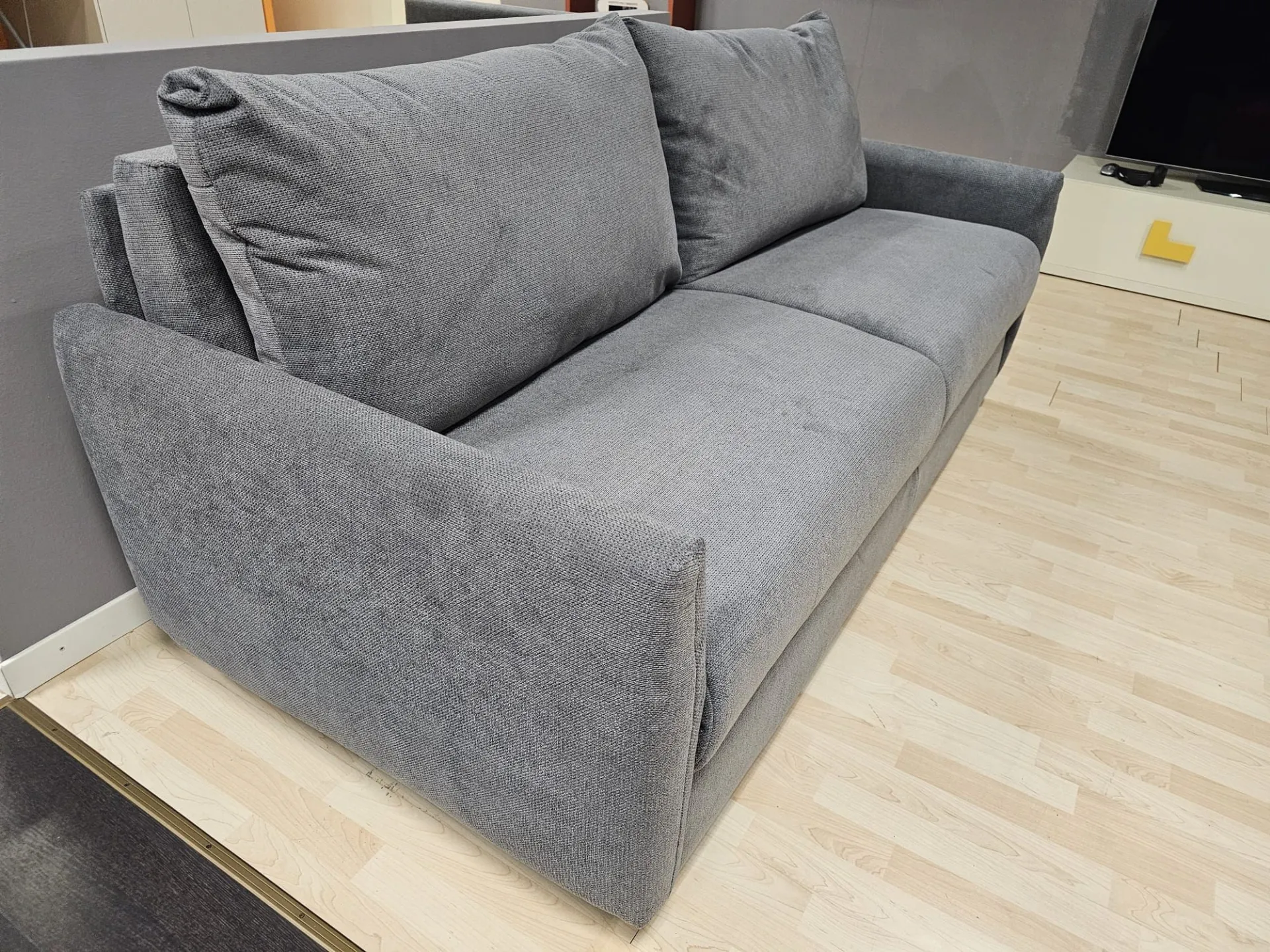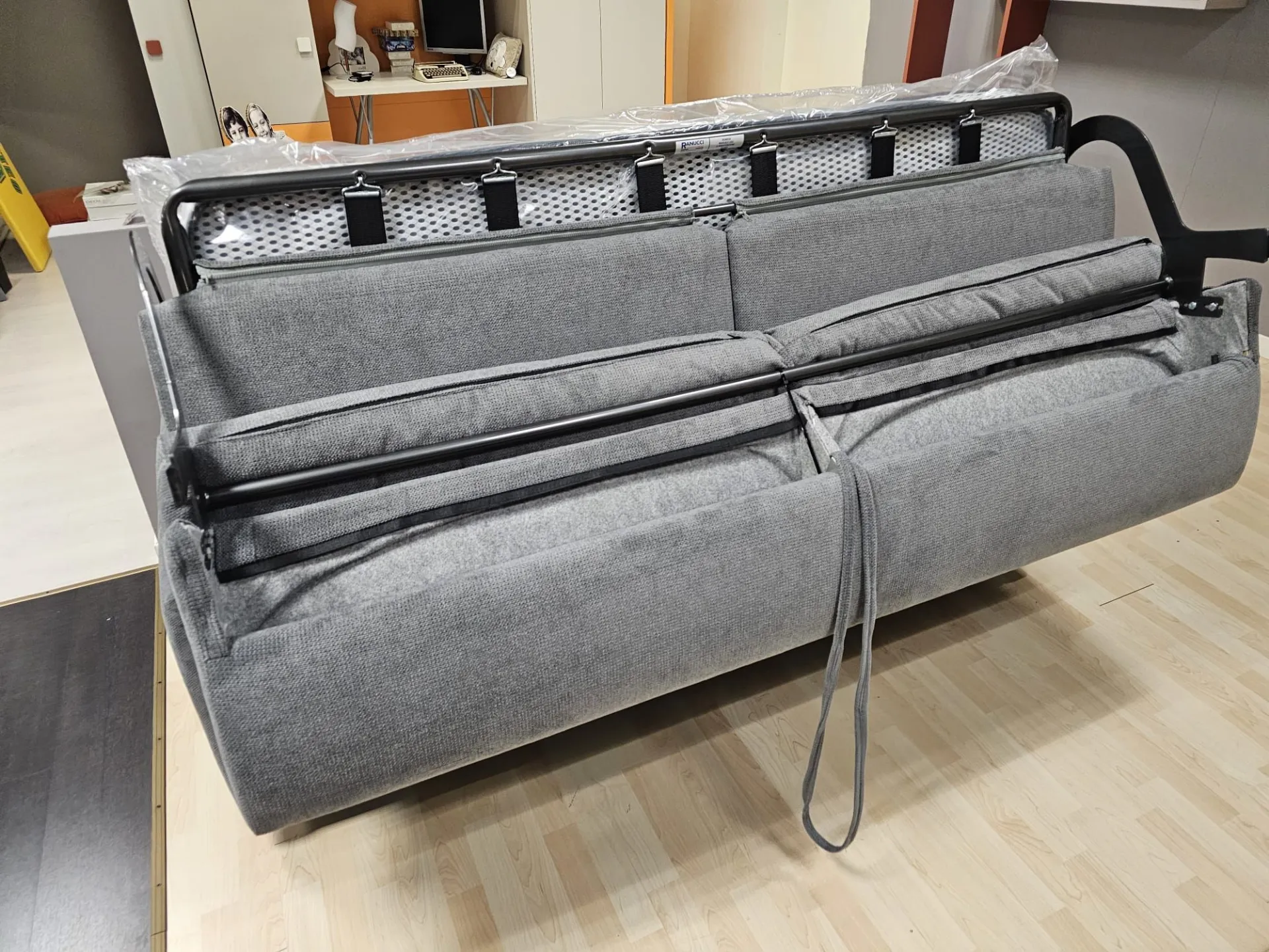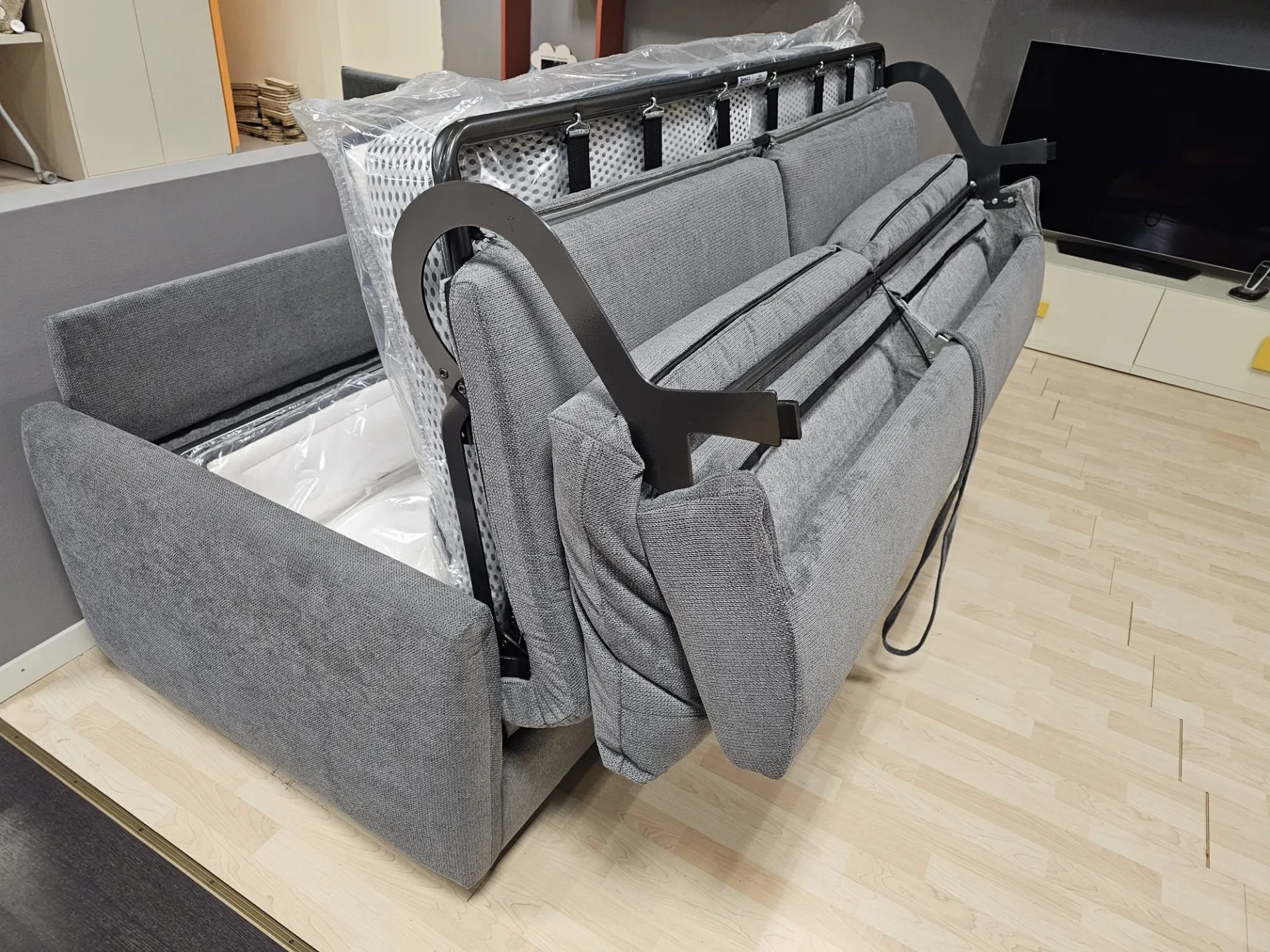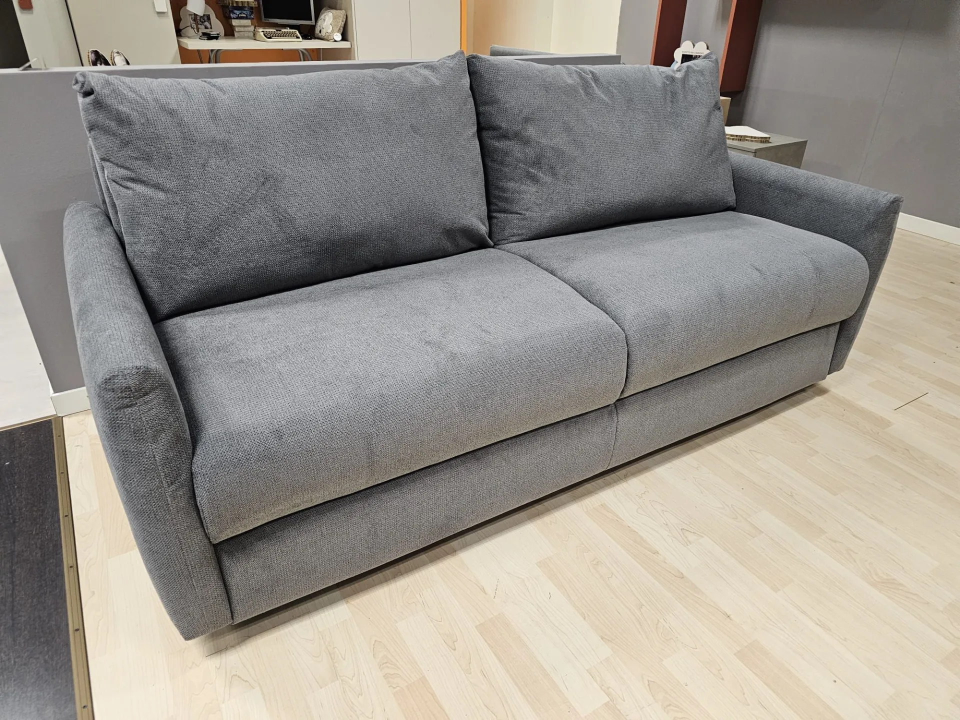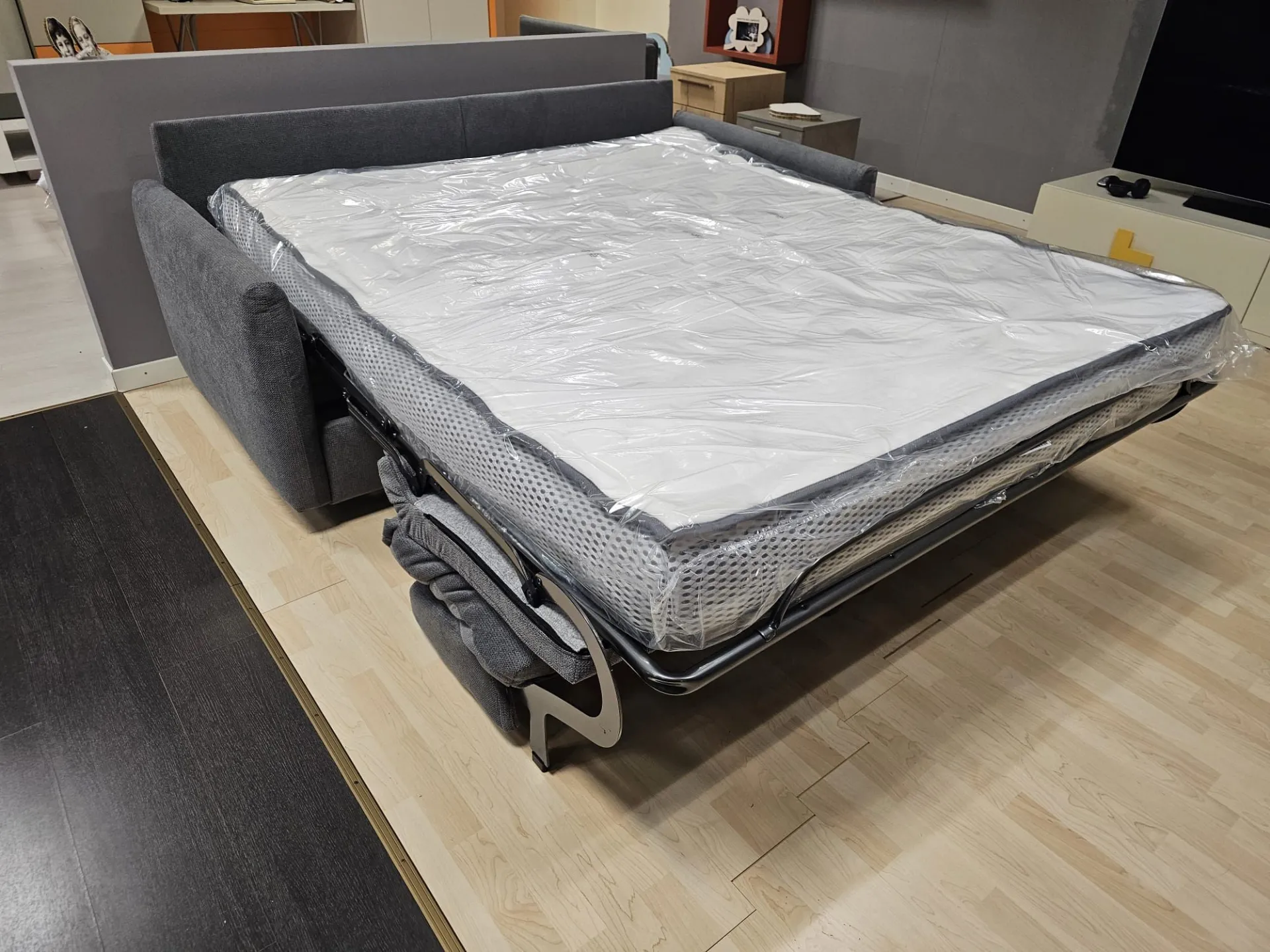 Sofa Bed model JERRY measuring cm L.196xW.96xH.93 with internal double mattress measuring cm 160x196 H complete with removable Topper made with 2 cm Memory and dry washable. ELECTROWELDED MECHANISM OTELLO BIG and chrome metal feet Upholstery in removable grey fabric.