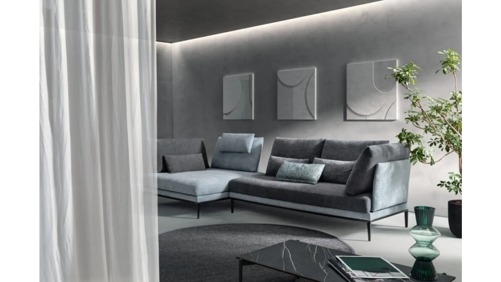 Sofa with peninsula Isla of Samoa: let yourself be fascinated by our proposals of design upholstered furniture that can ensure comfort, functionality, and design in your living room. Discover a wide variety of upholstered furniture with a peninsula from the best brands and enhance the living area you have always wanted. The living rooms represent a truly essential area of the living room, to be furnished with care by positioning sofas, armchairs, and ottomans. The living room is the protagonist of every home's living area, and upholstered furniture modules are the elements around which to spend moments of relaxation and socialization. Samoa, a leader in the production of sofas, has realized an elegant and refined fabric covering for the model in the image.