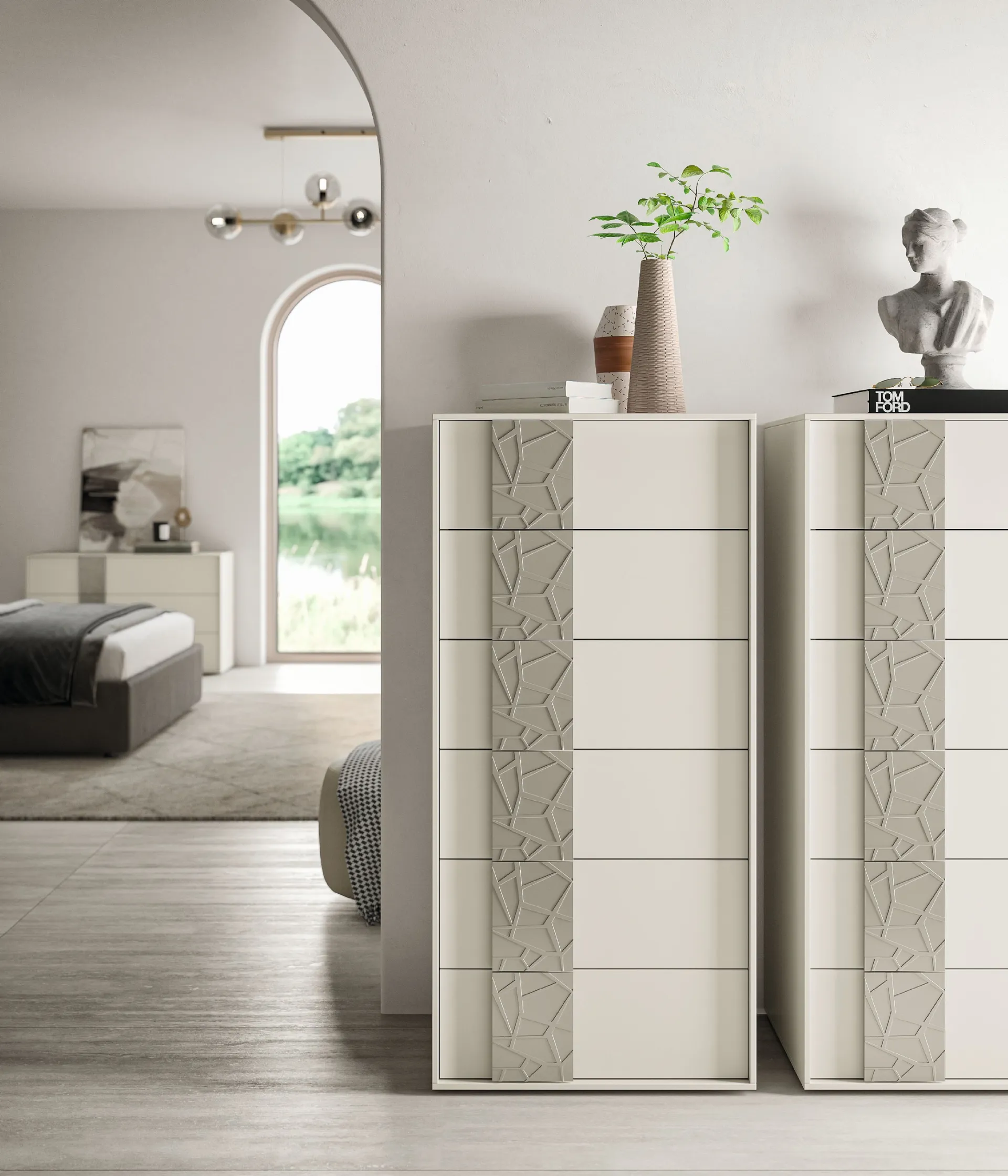 Discover more about our collection of night groups from the best brands to equip the space with a unique design. The proposals in matte lacquered finish from the brand Spagnol Mobili, specialized in the production of wardrobes and bedside tables, allow to recreate customized combinations or have features in clear and deliberate contrast with the rest of the furnishings. Thanks to these furniture pieces, it is possible to arrange small necessary items or display accessories. Spagnol Mobili's Metrolis New chest of drawers: it is a versatile type of element for storage, capable of ensuring functionality and excellent aesthetic effect in designer spaces.