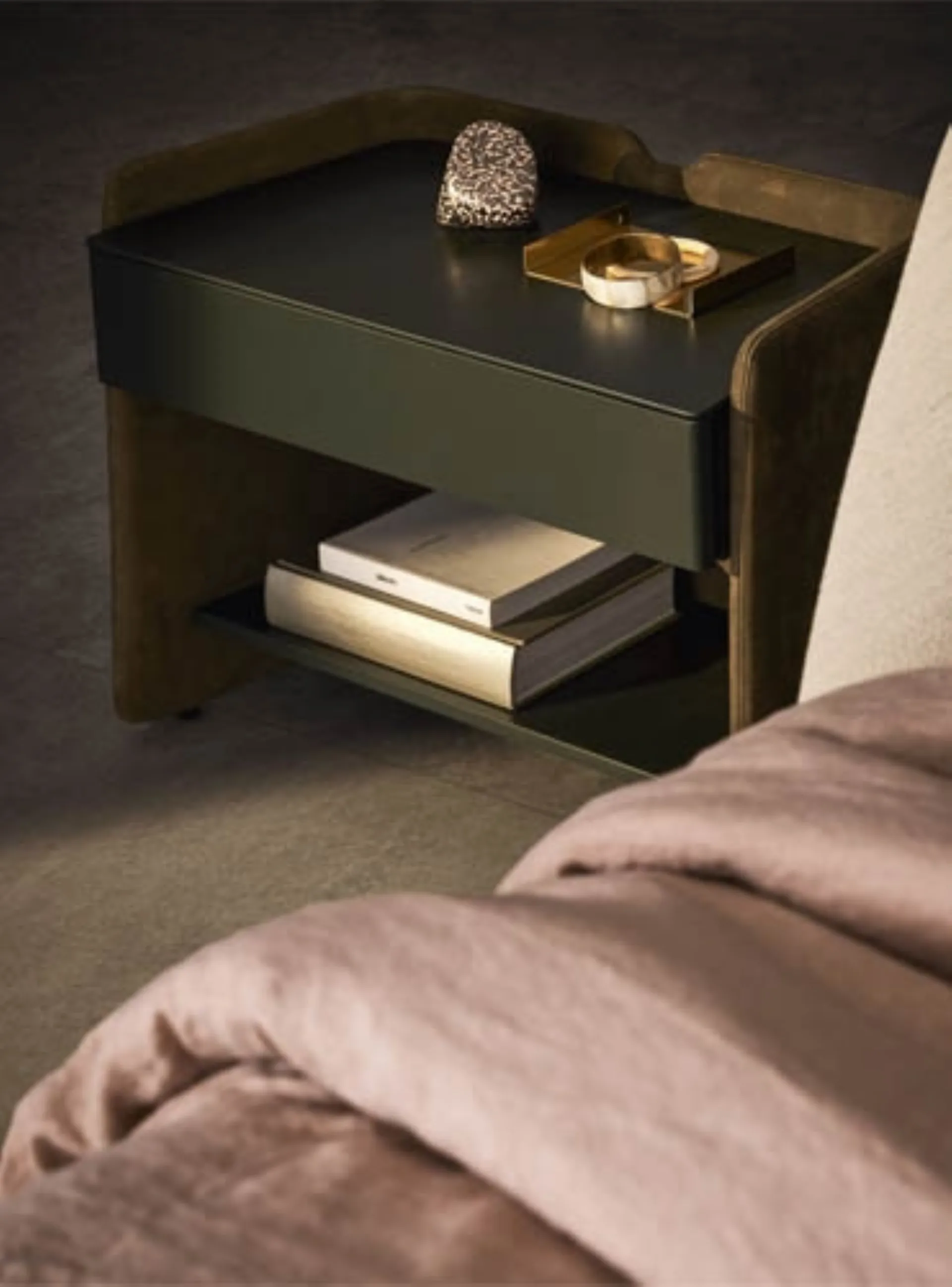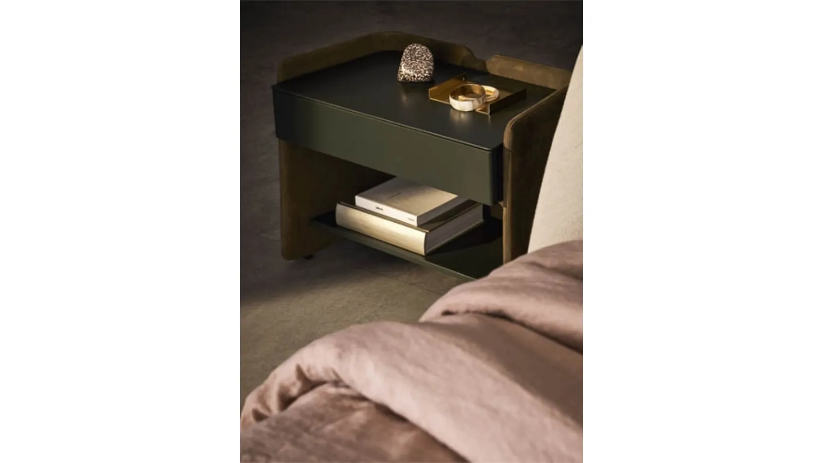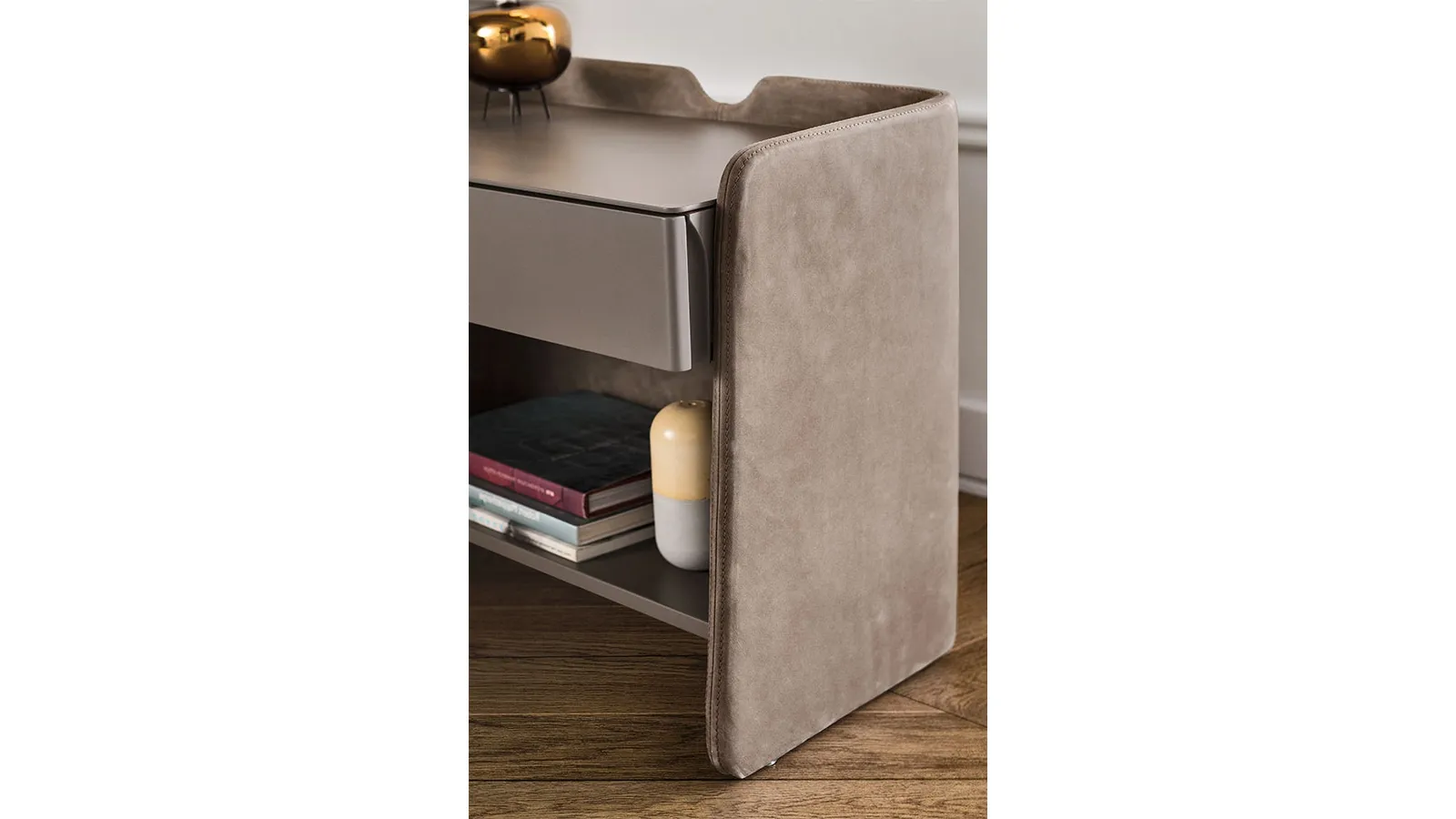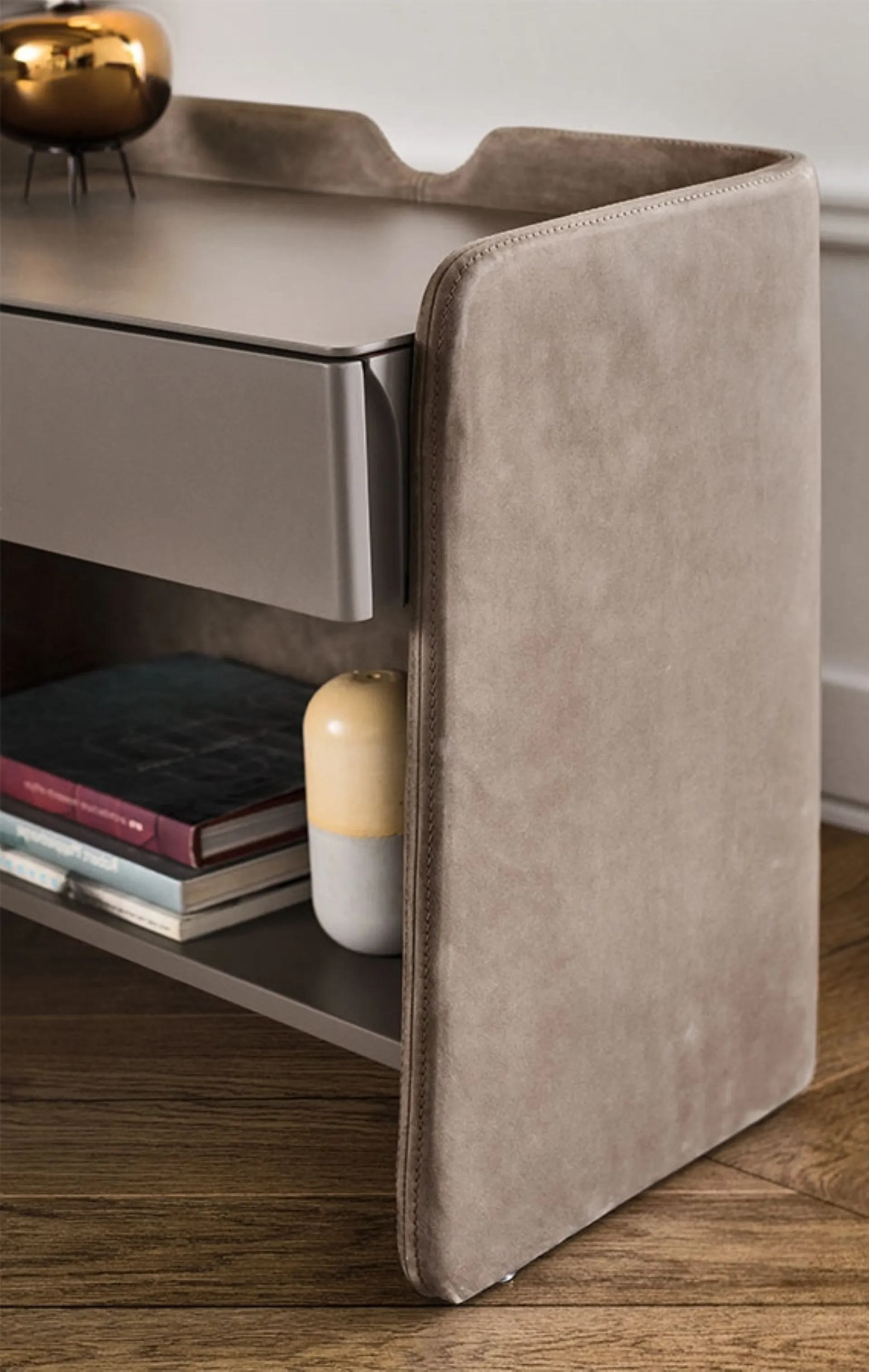 Il comodino Chlo di Pianca, creazione di Emmanuel Gallina, incarna un'estetica raffinata e funzionale, con linee morbide e volumi accoglienti. La sua struttura definita da una scocca a C curvata e imbottita, pensata per un supporto ergonomico e visivamente leggero all'interno dell'ambiente notte. Le finiture disponibili, che spaziano dal tessuto alla pelle, permettono una personalizzazione materica che esalta la qualit artigianale. La continuit formale delle superfici e l'integrazione discreta dei sistemi di apertura, tramite una gola laterale sui cassetti in legno, evidenziano una progettazione orientata alla purezza estetica e all'efficienza d'uso. Questo arredo rappresenta un investimento nella durabilit strutturale e nell'estetica senza tempo, garantendo un'integrazione stilistica impeccabile in contesti abitativi moderni.