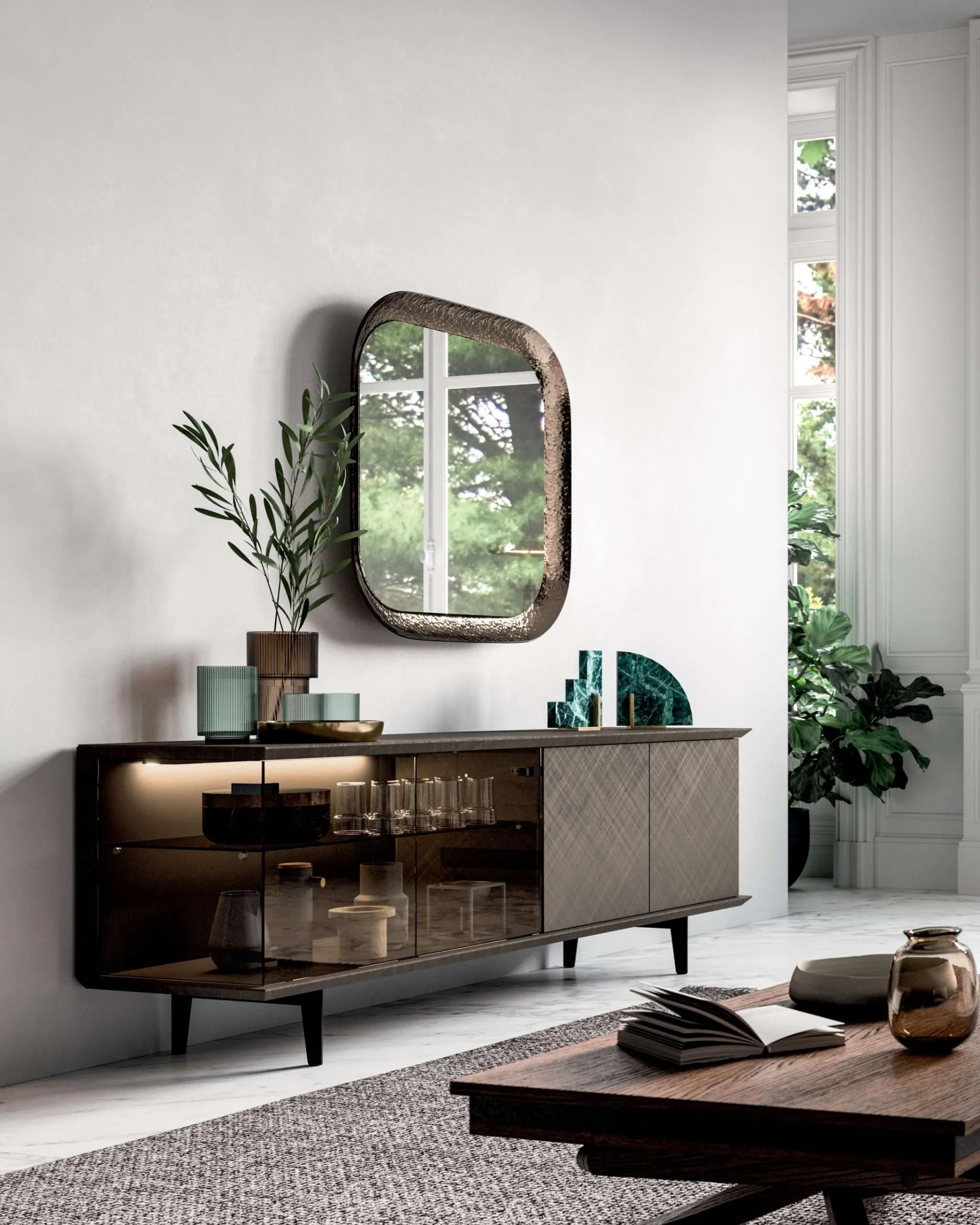 Thanks to the Brera Glass sideboard by Ozzio you can embellish your spaces by enhancing every corner of the living room and ensuring a unique design. If you want to personalize your living room with a new sideboard, a rich catalog of glass home furnishings from the best brands awaits you on our website. Contact us for more information on furniture and accessories for the living area: a wide range of modern chests of drawers awaits you! With the living room furniture visible here you can create a unique atmosphere. To avoid making mistakes, carefully evaluate which pieces of furniture are suitable for your living room, among various offers of equipped walls, bookcases and chests of drawers.