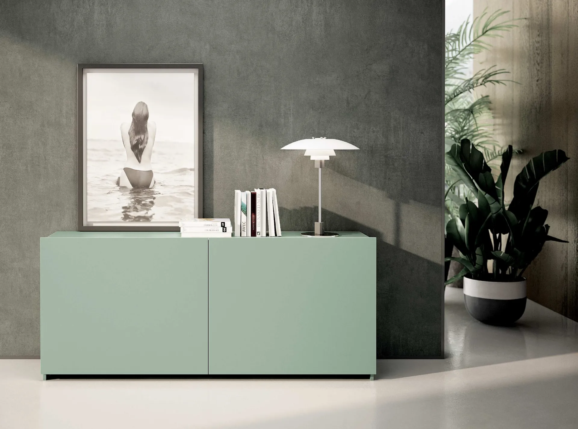 Simple-shaped media unit in matte lacquered finish, ideal for customizing and optimizing modern rooms.