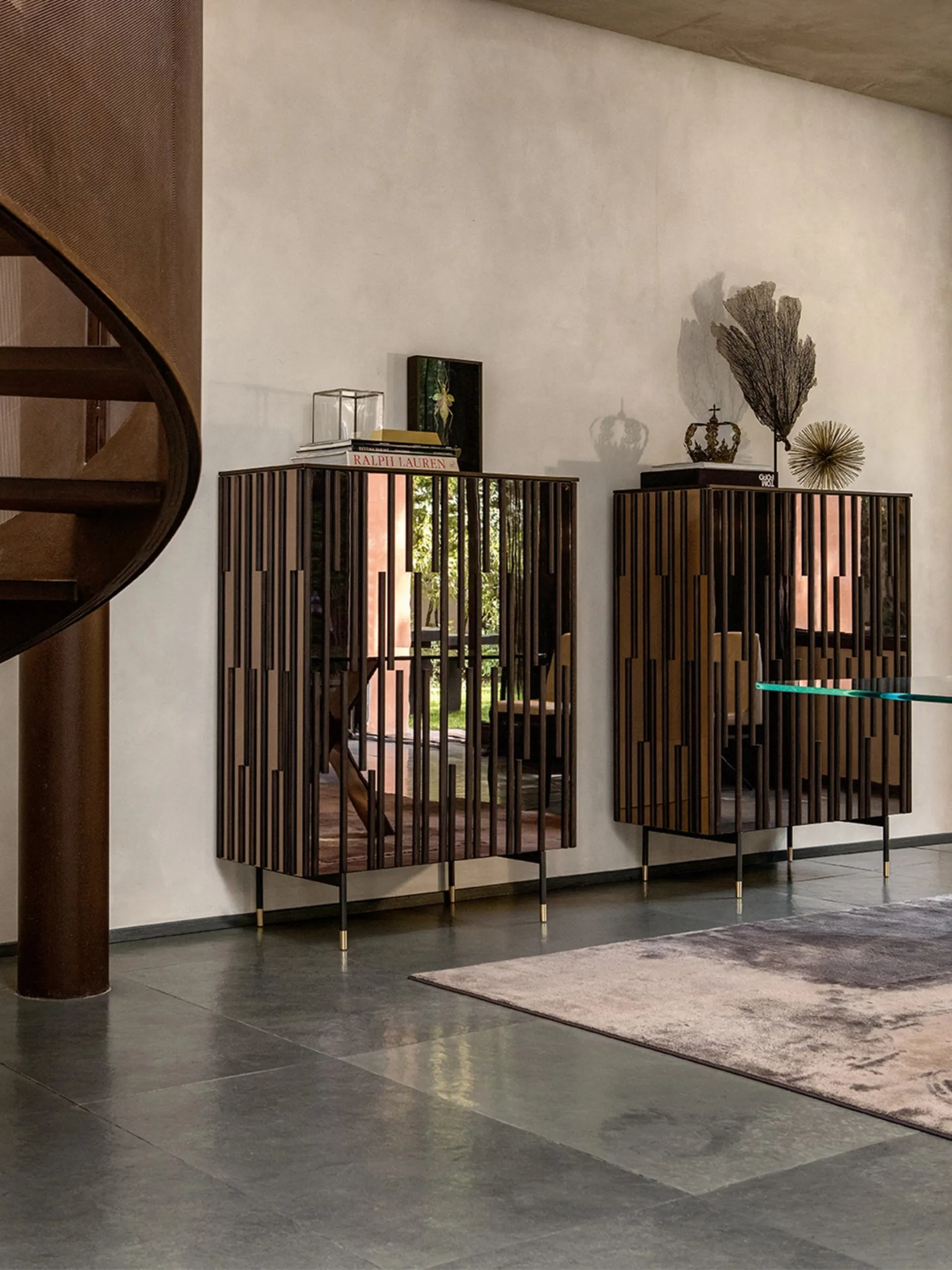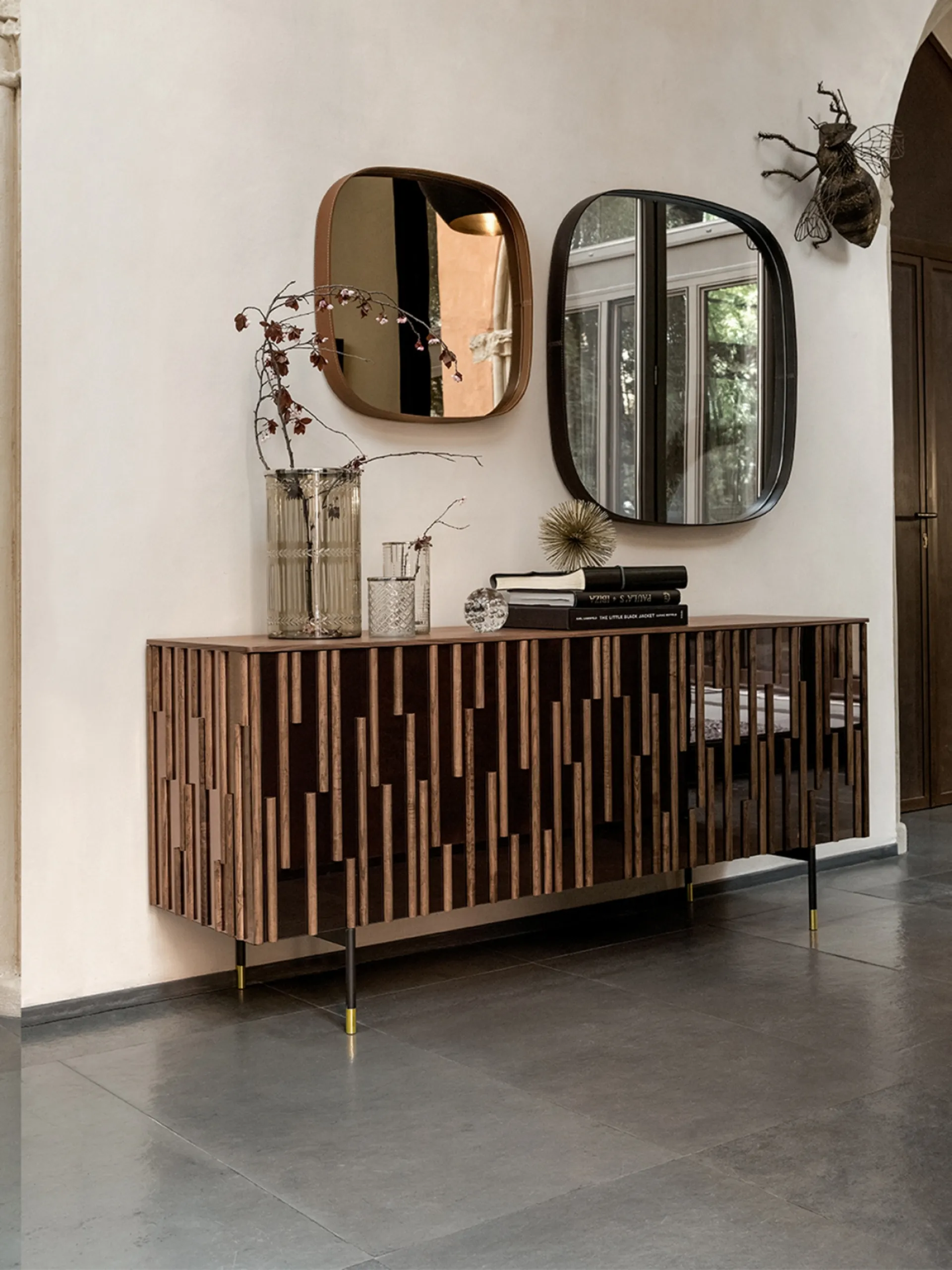 La Madia Drops di Tonin Casa si configura come un pezzo distintivo per ambienti living e zona notte. Il suo un design sofisticato è arricchito da gocce in legno massello applicate con cura su ante effetto specchio, che conferiscono un tocco visivo unico. La robusta struttura in metallo con inserti in finitura oro, completata da un top sagomato e stondato è supportata da una base in metallo grigio carbone con piedini in ottone. Le finiture per la struttura includono struttura in Noce Canaletto, Rovere Scuro o Frassino nero, mentre ante e fianchi sono personalizzabili con ante e i fianchi sono disponibili con effetto specchio argentato, grigio o bronzato. La gamma offre diverse configurazioni dimensionali offrono soluzioni adatte a ogni esigenza spaziale. La meticolosa selezione dei materiali e l'ingegneria del design assicurano un prodotto che risponde ai più alti standard qualitativi e funzionali.