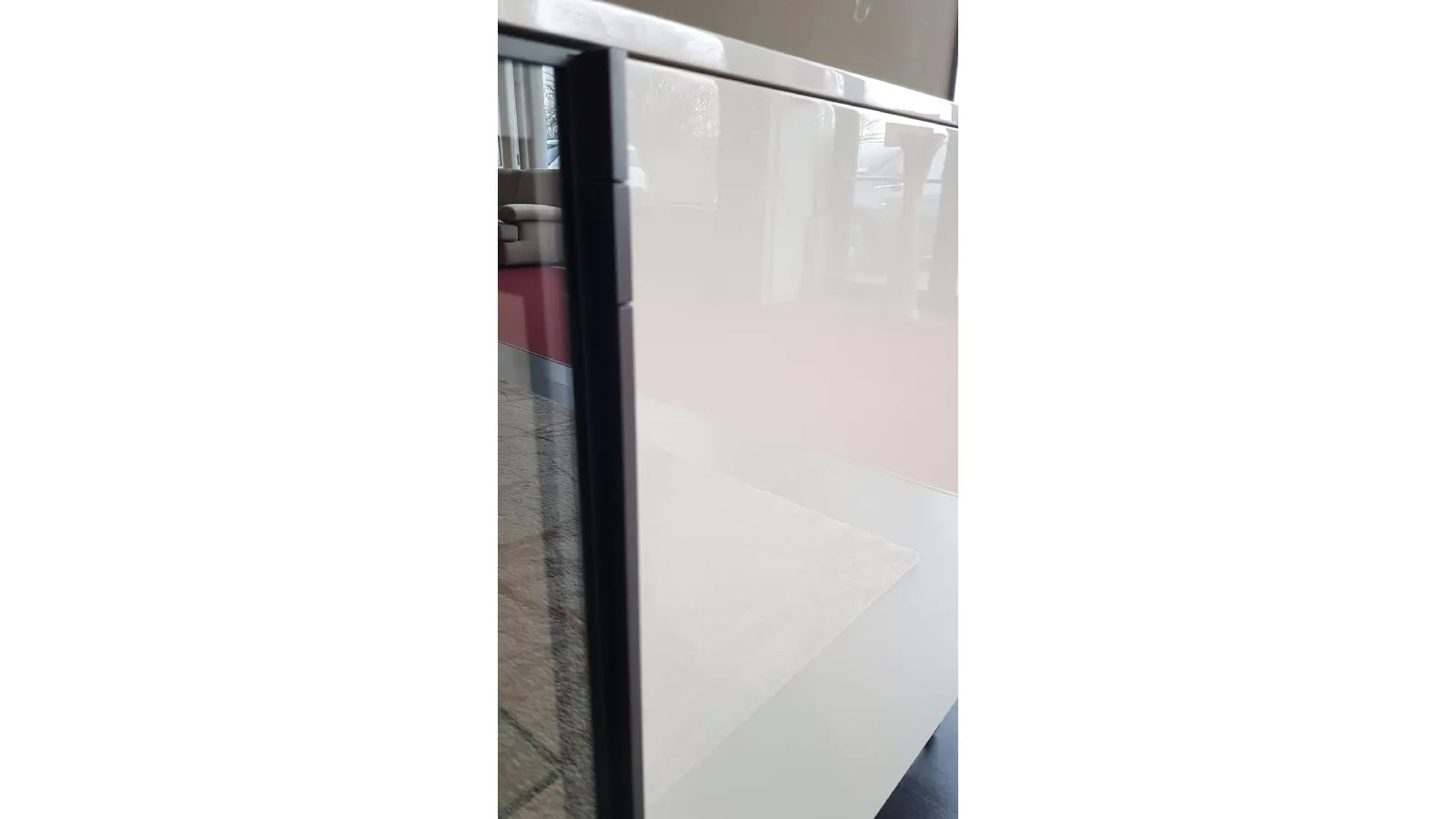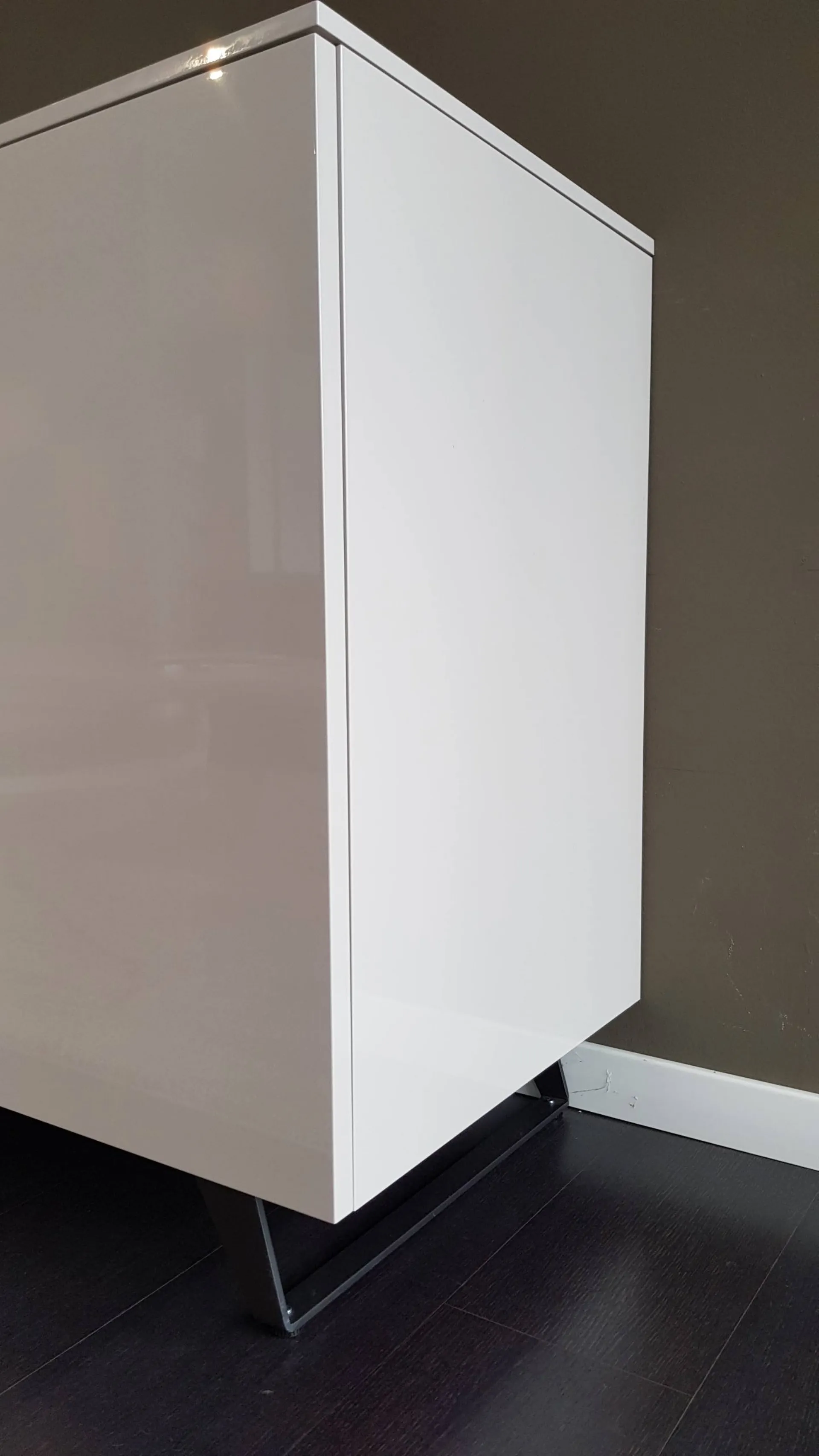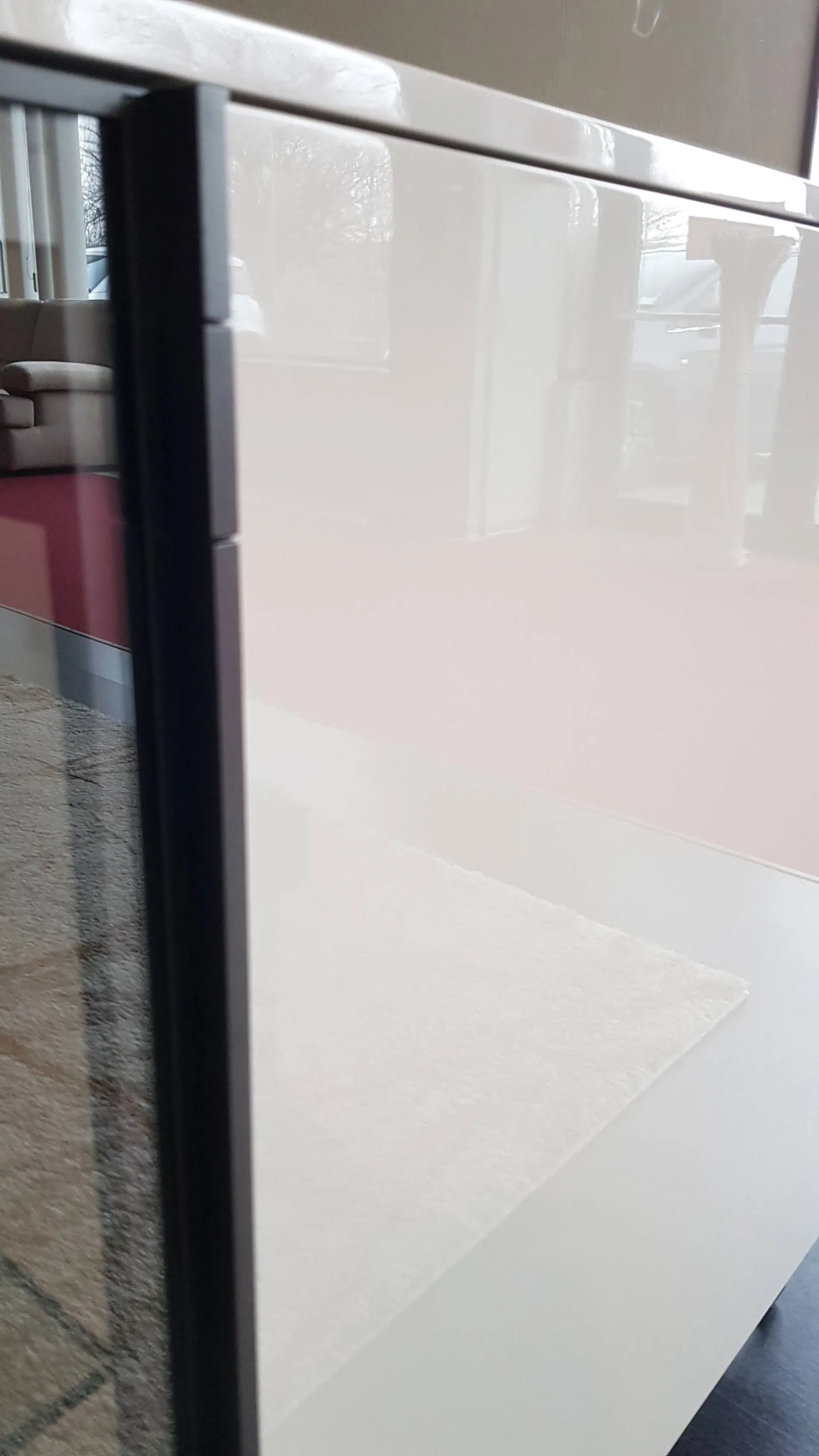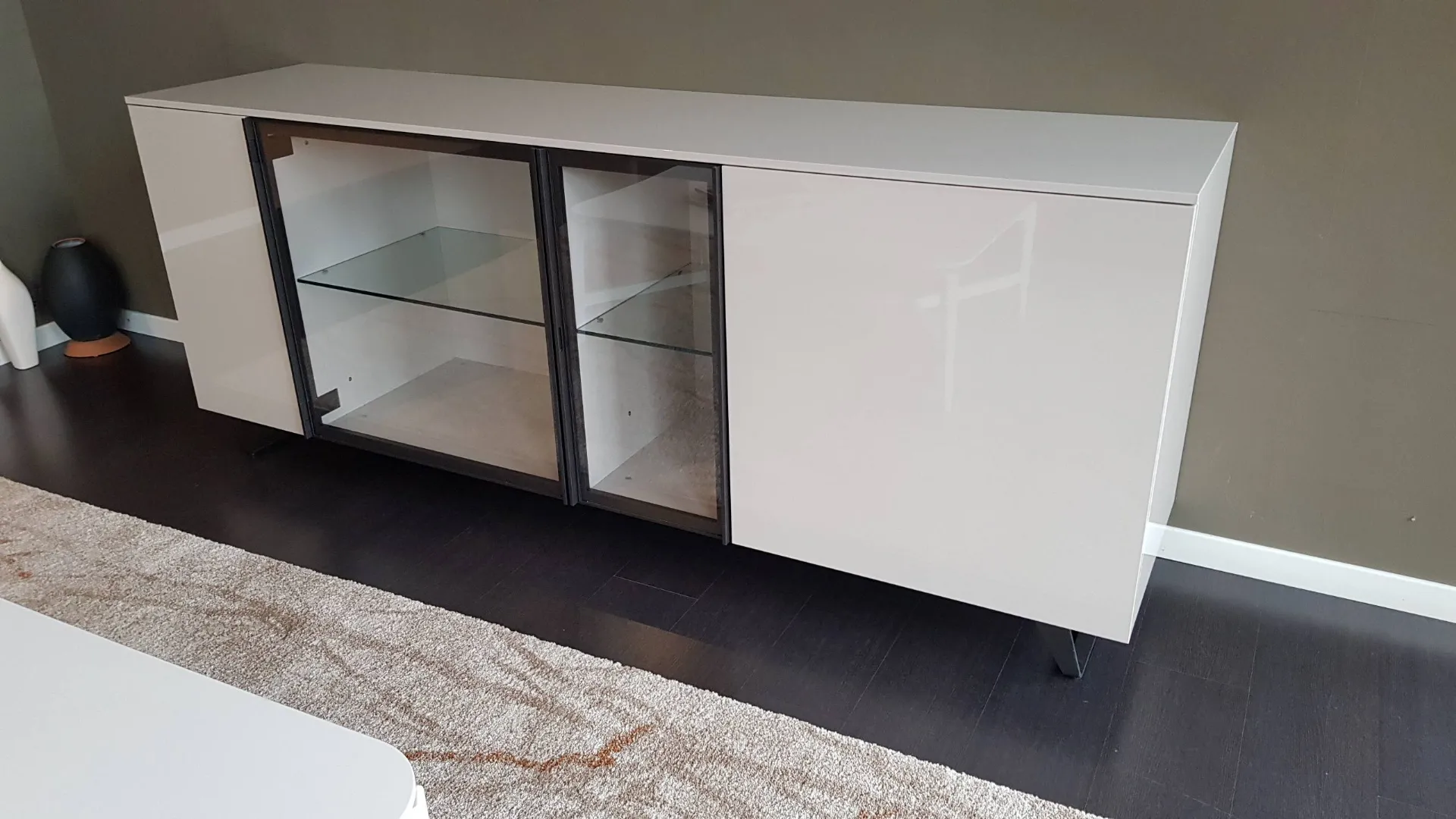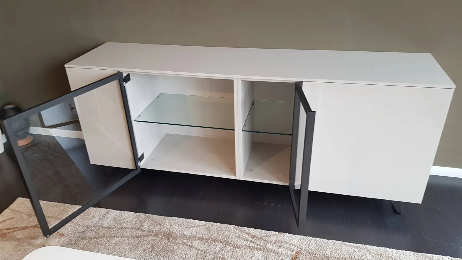Original sideboard with an elegant design, capacious but light, with glossy lacquered structure in mother of pearl color, left and right side doors in glossy lacquered finish in mother of pearl color, push& pull opening, 2 central doors mod. METROPOLIS SX and DX opening at 180° with anthracite-colored frame and transparent glass, anthracite-colored metal base, internal shelves in transparent glass, elegant opening mechanisms, not very visible and adjustable along the three axes, total dimensions 216.2 xp 51.5 xh 85.5 cm