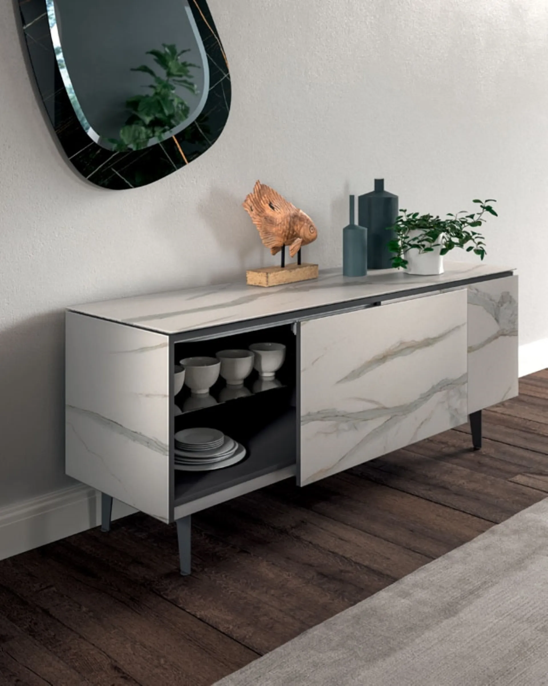 La Madia Plana di Ozzio Italia incarna un'estetica moderna e una funzionalità avanzata. Questo mobile è caratterizzato da due ante complanari che si integrano armoniosamente, mettendo in risalto le raffinate finiture in Marble Glass. Queste superfici, disponibili in varianti come Calacatta gold lucido o Sahara Noir Lucido, conferiscono un tocco di lusso e resistenza. Internamente, la madia offre vani contenitivi ottimizzati con mensole in cristallo, ideali per un'organizzazione impeccabile. La struttura poggia su discreti piedini in metallo verniciato, che ne sottolineano la leggerezza visiva e la stabilità. Progettata per una perfetta integrazione, la Madia Plana si abbina idealmente con altri elementi distintivi della collezione Ozzio Italia, come i tavoli della serie 4x4, Fil8 o Random, creando un ambiente coerente e di alto design. L'impegno nella selezione dei materiali e nella cura dei dettagli assicura un'elevata qualità costruttiva e un valore duraturo.