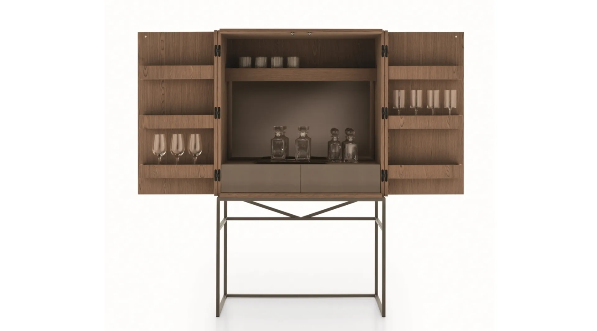 | Materiale: | Metallo light brown (base), Noce Chocolate (struttura), Vetro bronzato (dettagli), Pelle (frontale cassetti) |