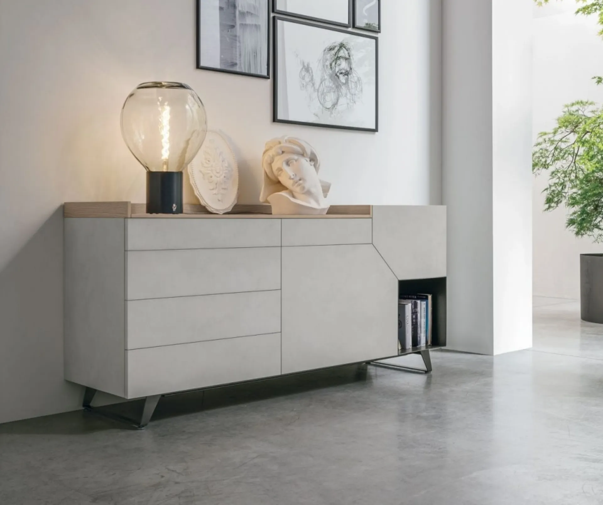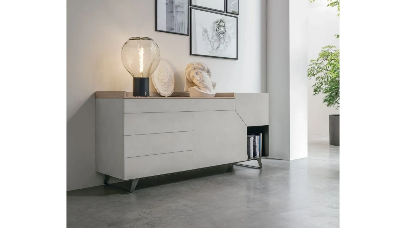 Per i prodotti Tomasella, il nostro showroom Rusconi Arredamenti s.r.l. a Cirimido è il punto di riferimento esclusivo per tutta la zona. La madia Madia Remix X05 di Tomasella è un complemento d'arredo moderno ed essenziale, facente parte della rinomata collezione Remix. Caratterizzata da un design distintivo con un angolo tagliato e un'anta asimmetrica, aggiunge un tocco di originalità e personalità a qualsiasi ambiente. È splendidamente attrezzata con 2 ante, 5 cassetti e 1 vano a giorno, offrendo ampio spazio contenitivo. Il raffinato basamento in metallo Metropolis (H 12 cm), con il suo taglio inclinato, ne enfatizza i volumi e facilita notevolmente la pulizia. La madia può essere completamente personalizzata nelle finiture della struttura e dei frontali, con opzioni che spaziano dai materici ai laccati (opachi, lucidi, metallizzati, a poro aperto) e alle essenze legnose, permettendovi di creare il pezzo perfetto per la vostra casa. Vi invitiamo a scoprire tutte le possibilità direttamente nel nostro punto vendita.