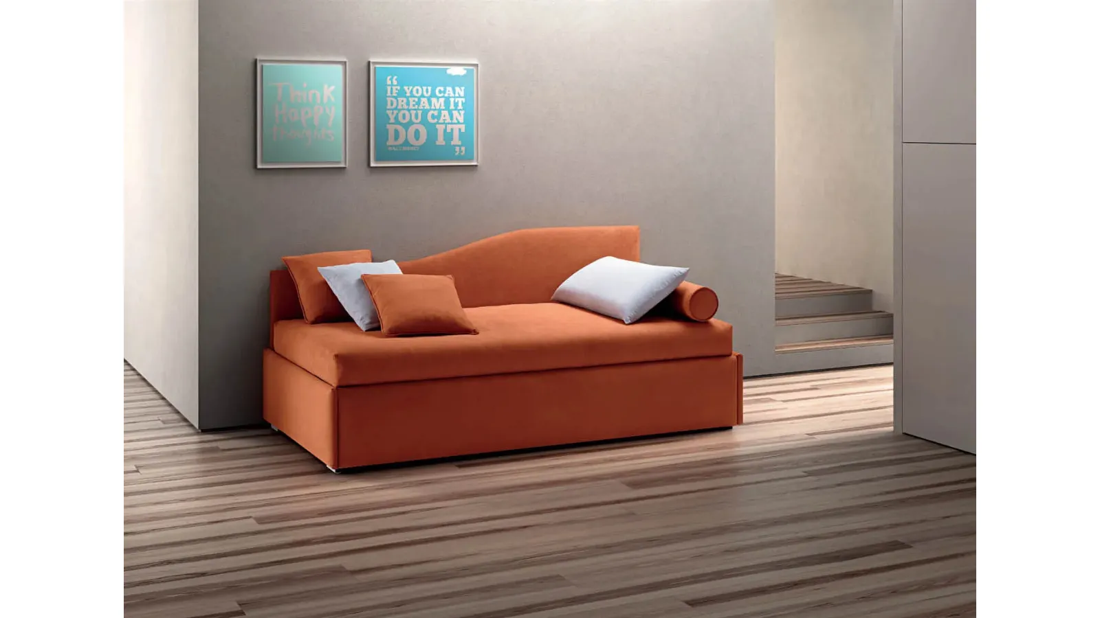 Find out more about Bside's Twice Central Shaped Modern Bed in the photograph: it is perfectly suited to create a welcoming, beautiful and well-organized environment, ideal for your children. The sommier single beds for the children's room available in our showroom solve any problem of space and practicality, while ensuring a unique style. A rich catalog of modern fabric beds is waiting for you: the Bside brand offers various bed versions, which always meet the needs of children. Durable materials and non-toxic paints characterize the company's proposals: if the room has small dimensions, there are many solutions available, always able to combine ergonomics and safety.