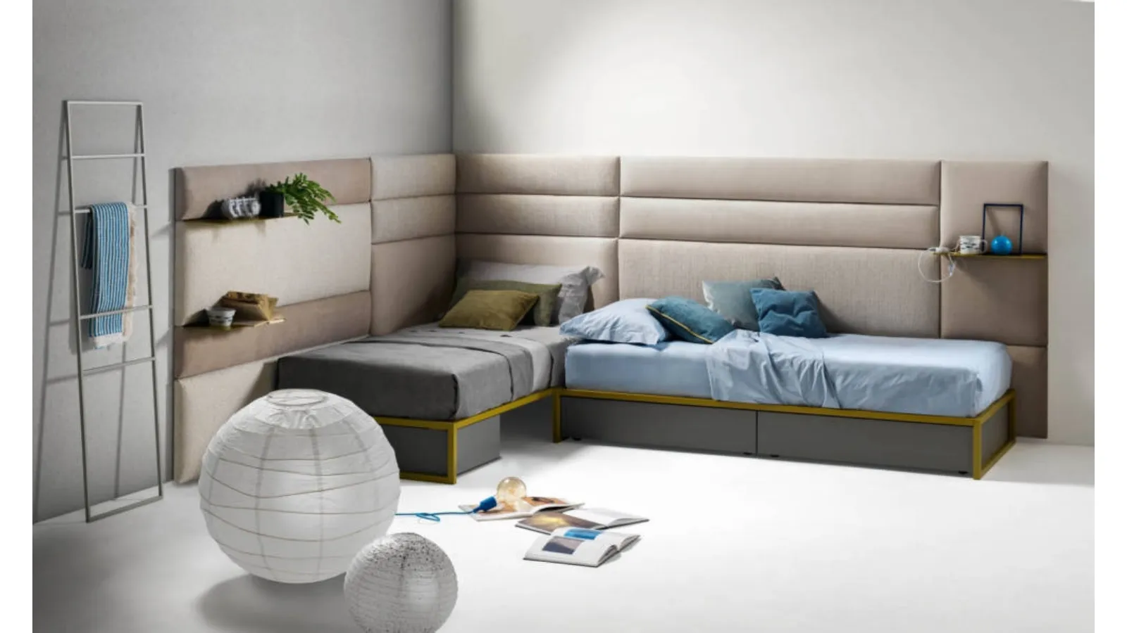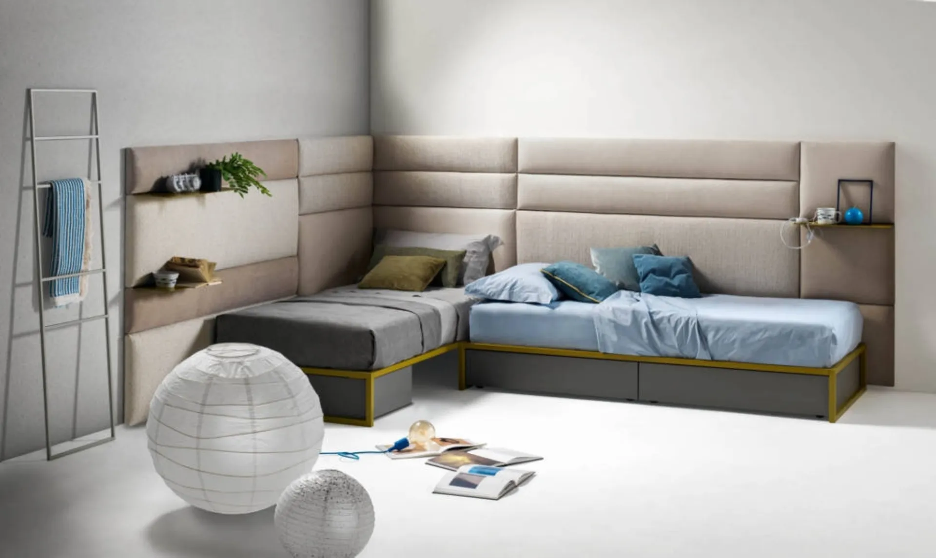 A rich catalog of modern fabric beds awaits you: the Bside brand offers various bed versions, which always meet the needs of children. Get information on the Pannelli Wall single bed by Bside in the image: it is ideal for perfectly creating a comfortable, beautiful and well-organized environment, ideal for your children. Precious materials and non-toxic paints characterize the brand's proposals: if the room is small in size, the solutions available are diversified, always capable of combining ergonomics and safety. The sommier single beds for the bedroom available in the shop solve any space and functionality problems, while ensuring a unique design at the same time.