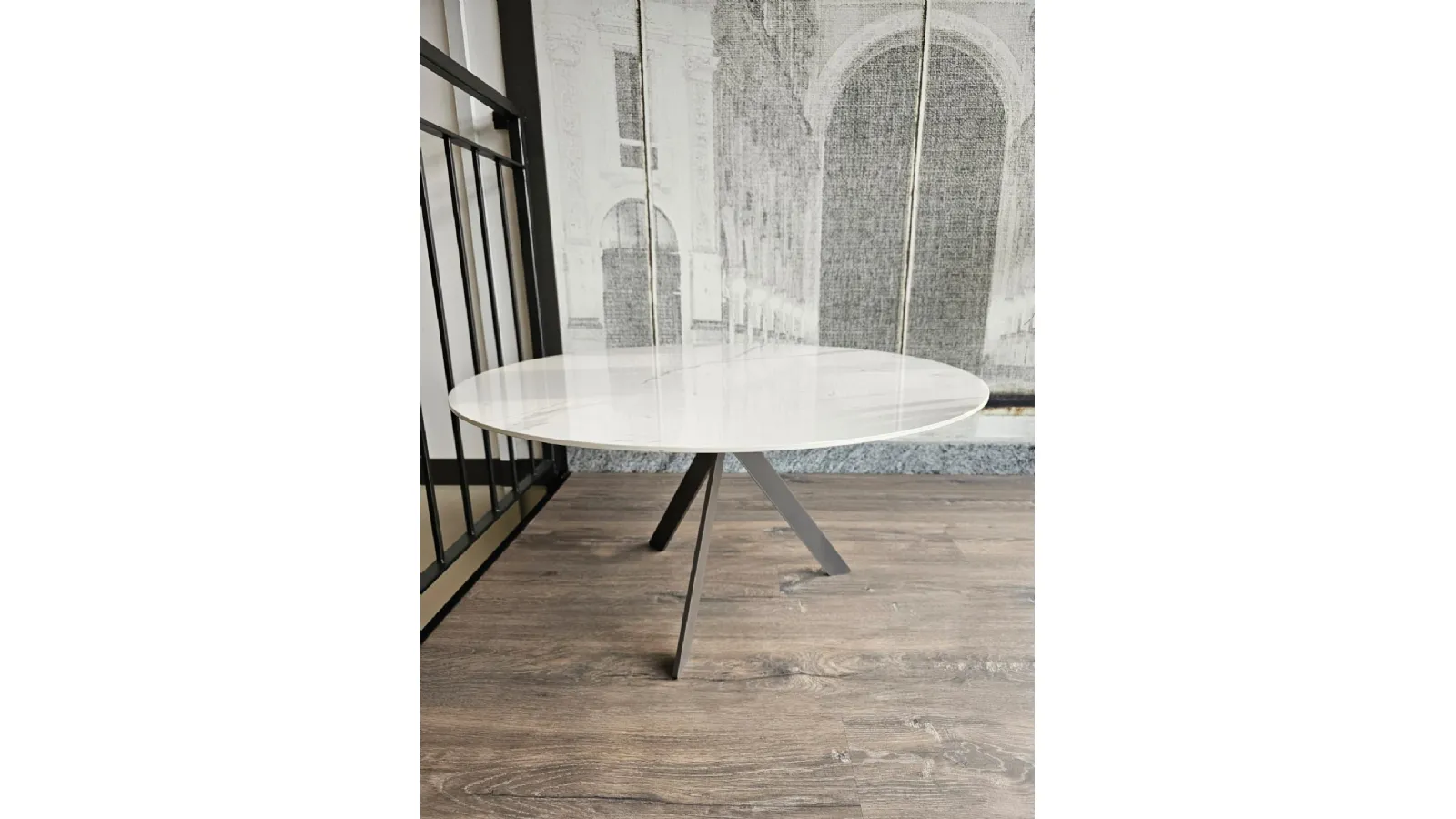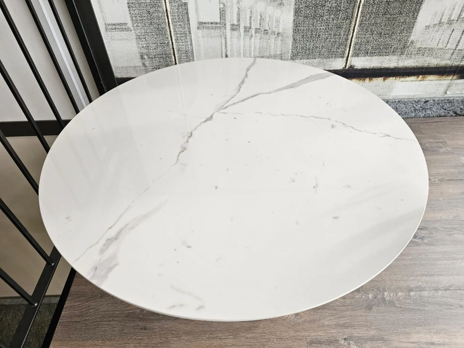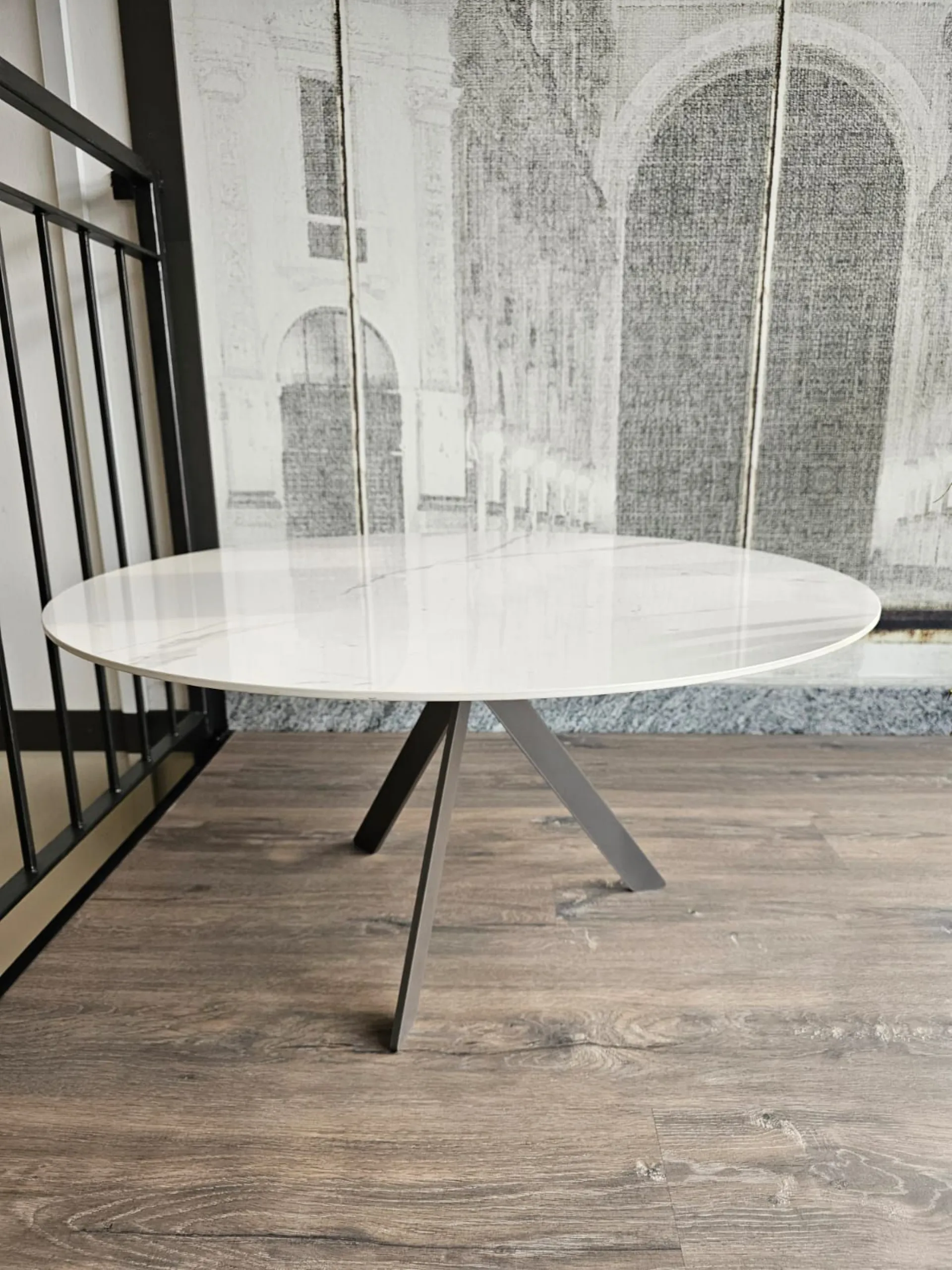Round coffee table with a diameter of 80 cm, in calacatta CC07. Graphite MT98 colored structure. Product available for immediate delivery.