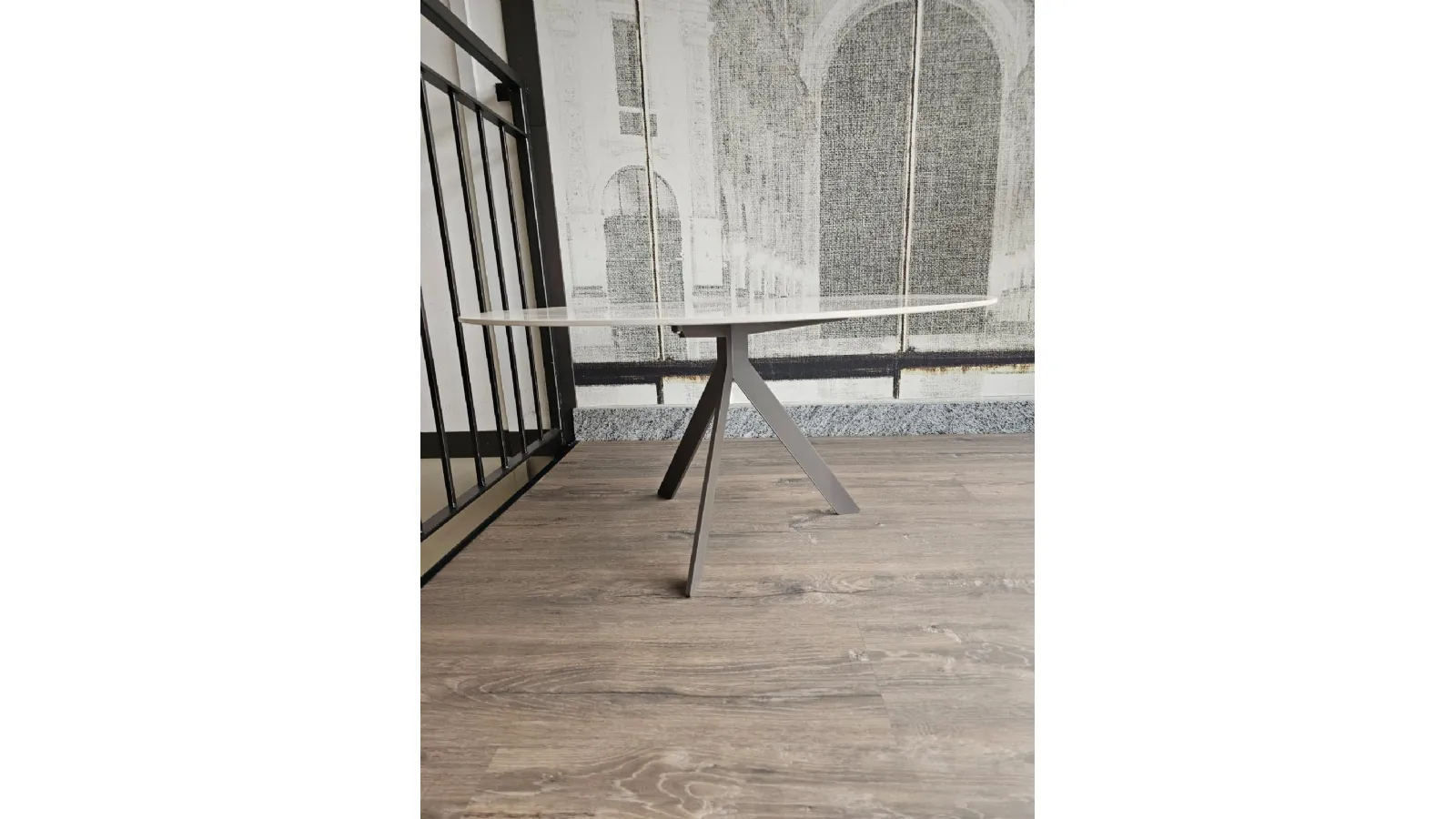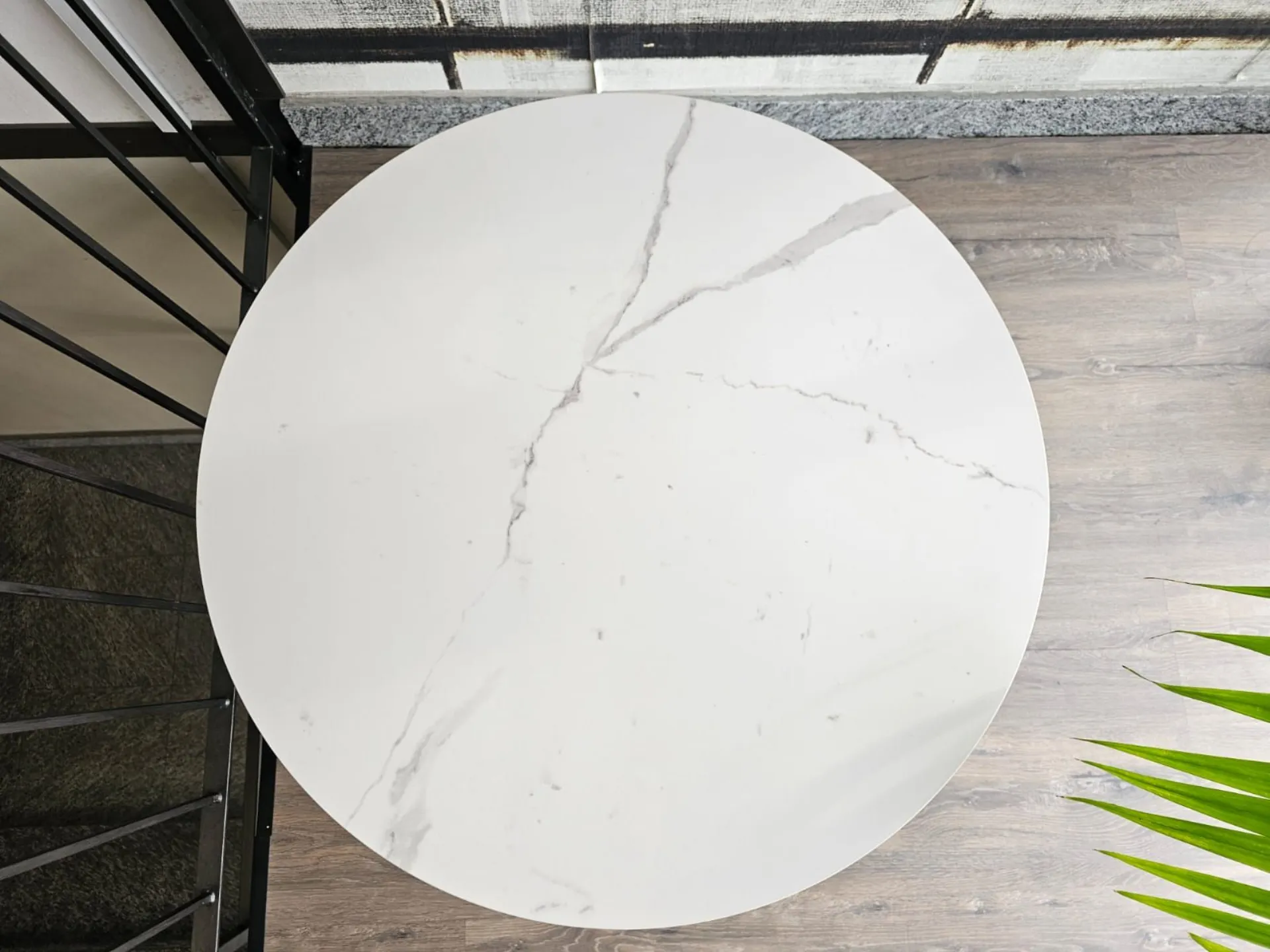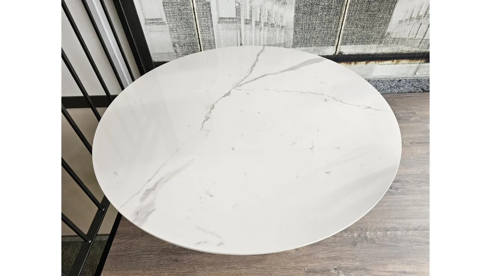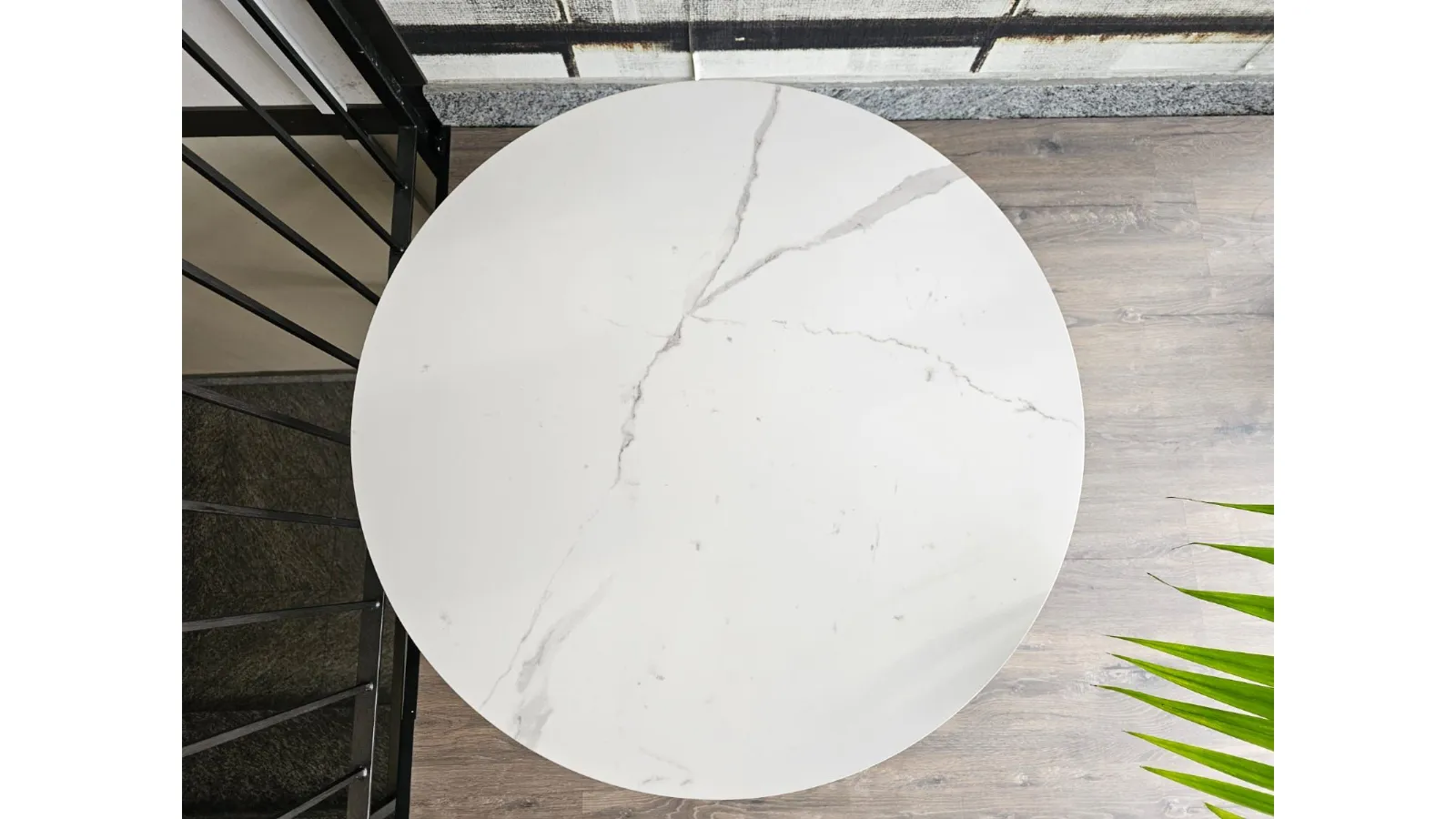 Round coffee table with a diameter of 80 cm, in calacatta CC07. Graphite MT98 colored structure. Product available for immediate delivery.