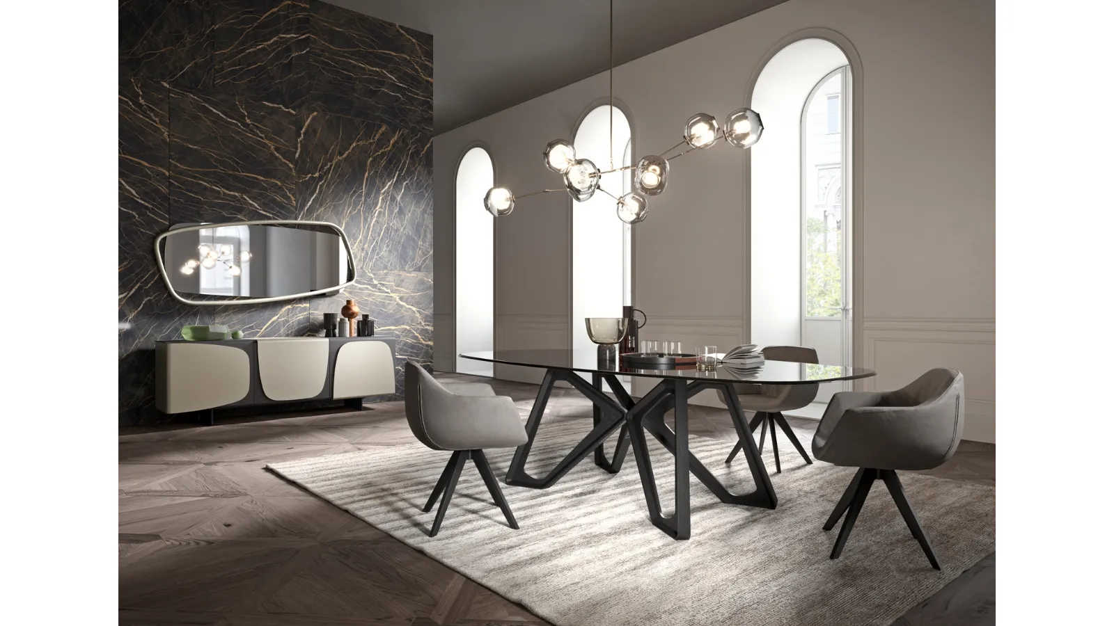 Tables are essential pieces of furniture in every home: complete your furnishing concept and bring to life the house you have always dreamed of. Fill out the form and contact us to discover the best furniture for your home from top manufacturers, including Ozzio brand tables and chairs. Tables are furnishing components that can complete the living room, kitchen, or other domestic areas, thanks to durable materials and imaginative color combinations. Fixed glass models like the one visible in the photo adapt to various living contexts, being truly versatile and resistant. Ozzio Papillon crystal table: discover a wide range of dining furniture and accessories to complete your spaces, with various design possibilities.