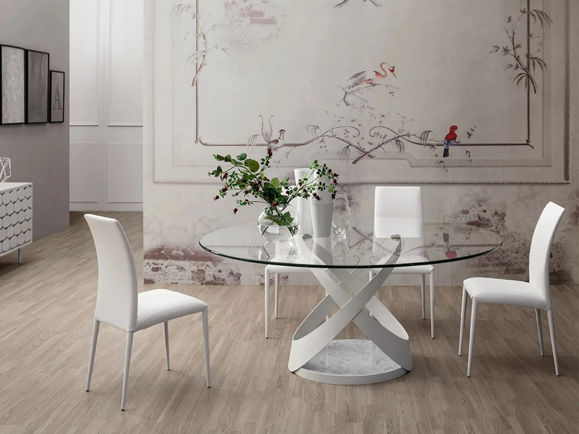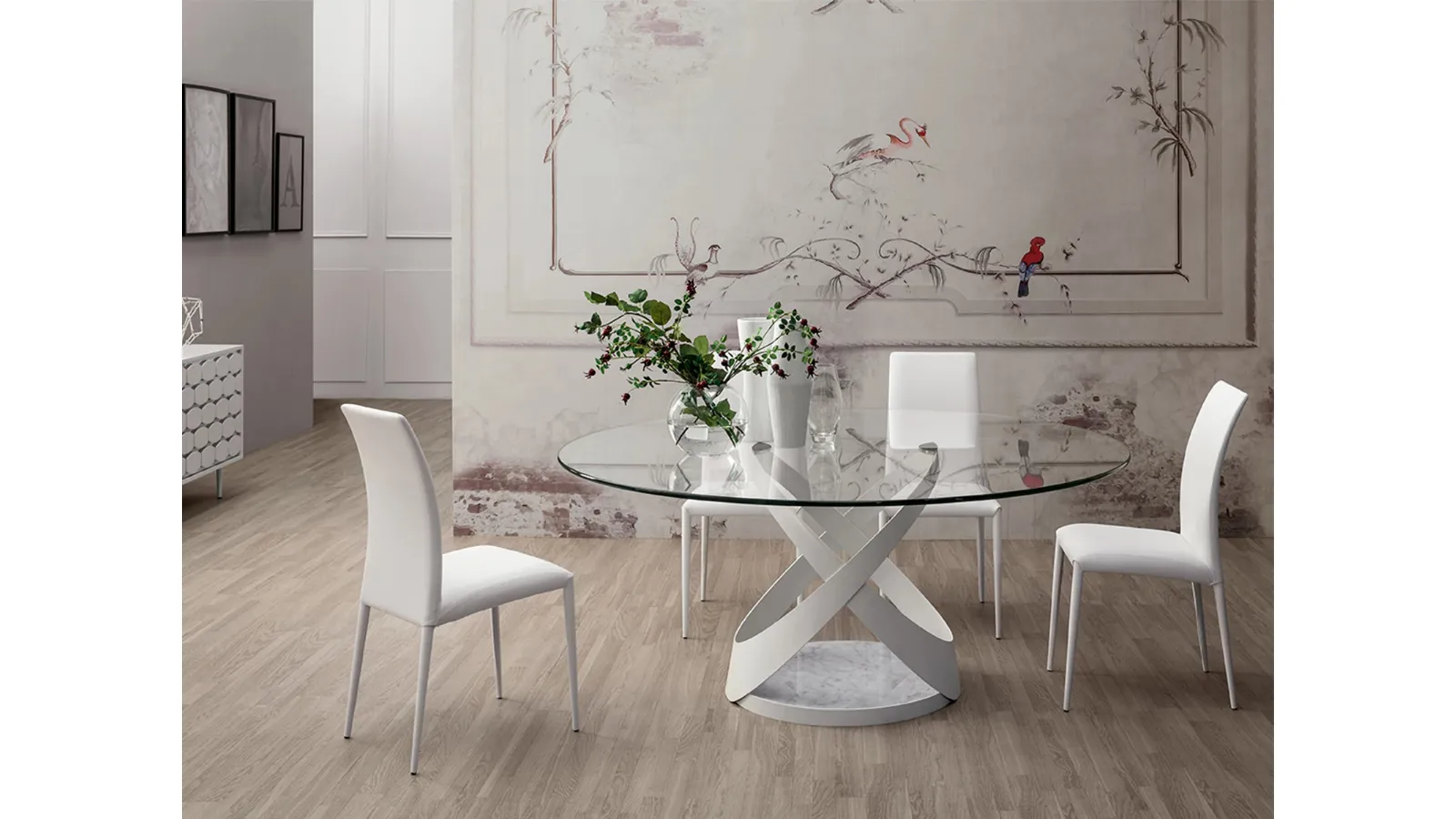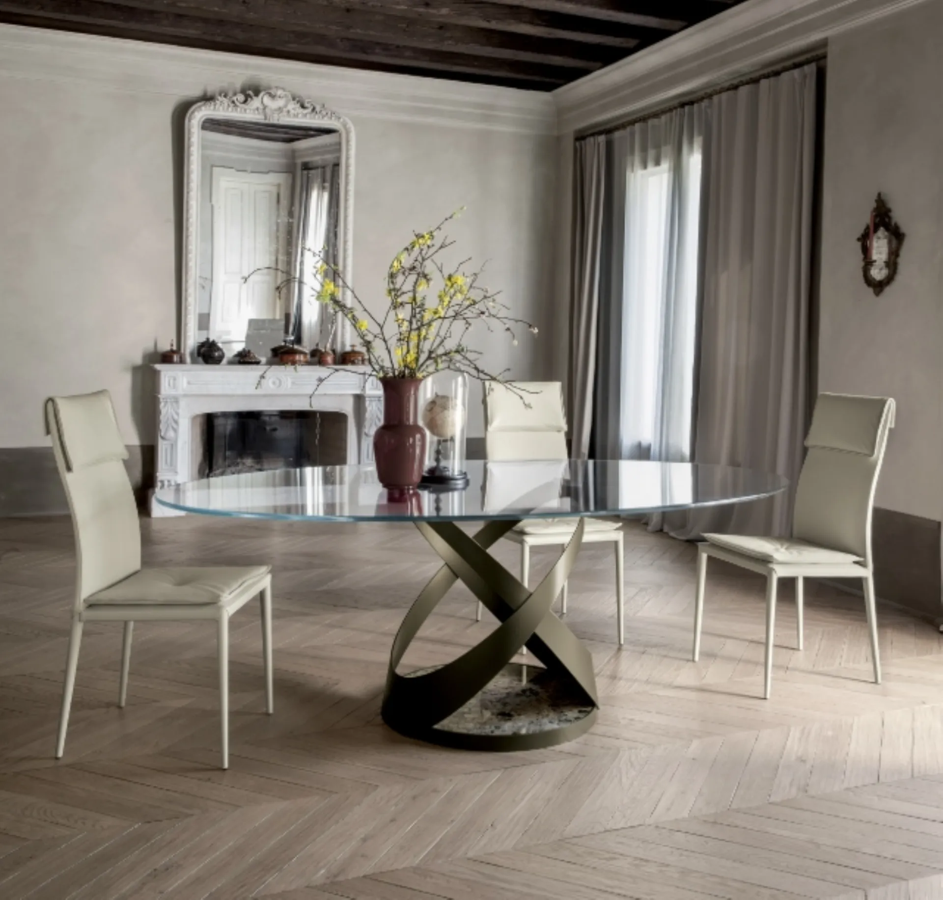 The Capri table with metal base and glass top by Tonin Casa awaits you to complete a kitchen or dining room with design references