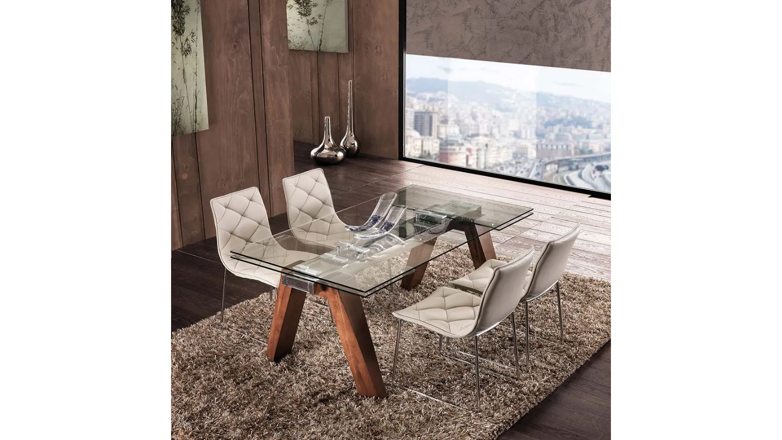 | Materiali: | Piano in vetro temperato 10mm, struttura in acciaio inox lucido, gambe in legno massello (faggio o noce americano) |