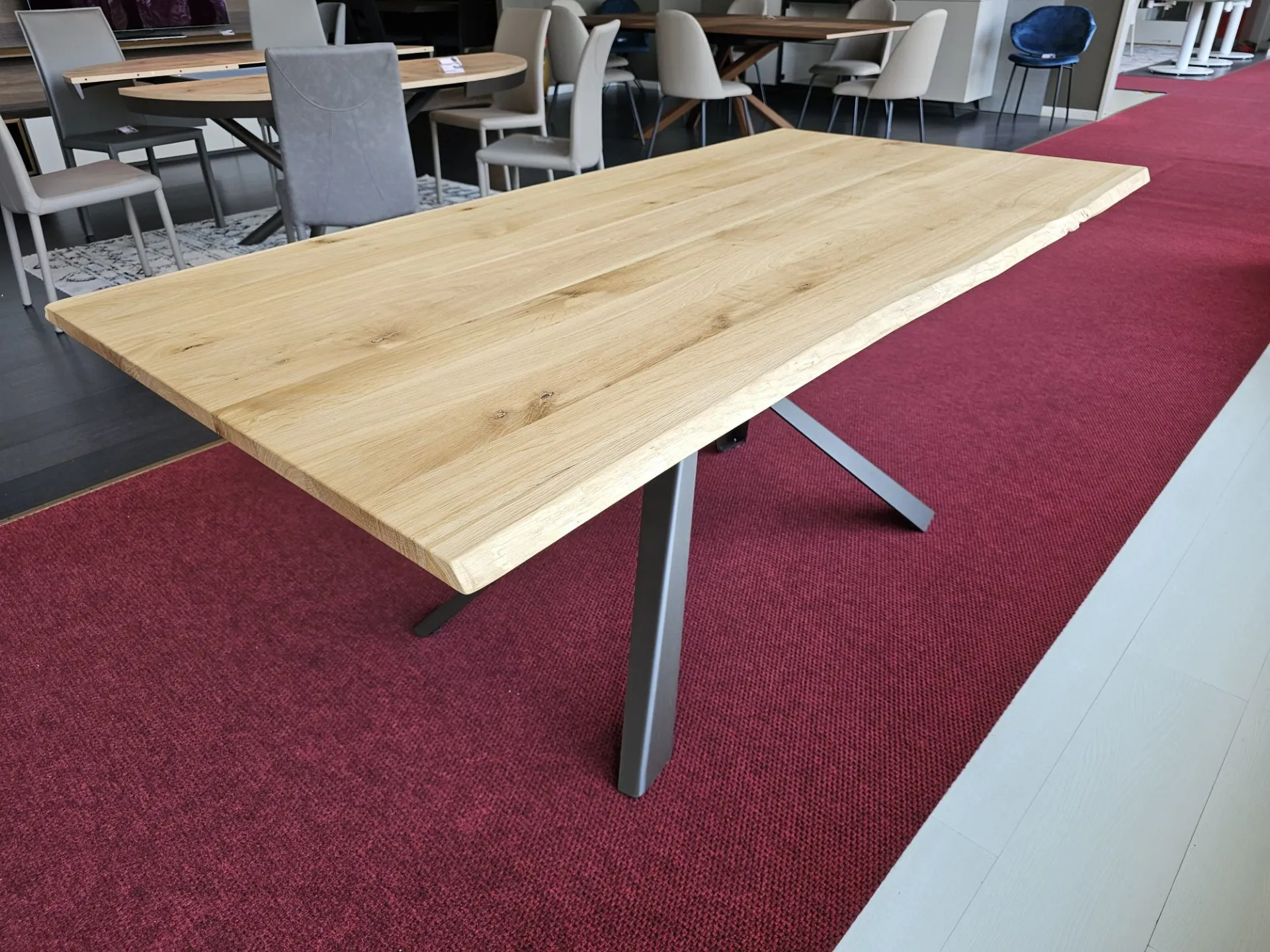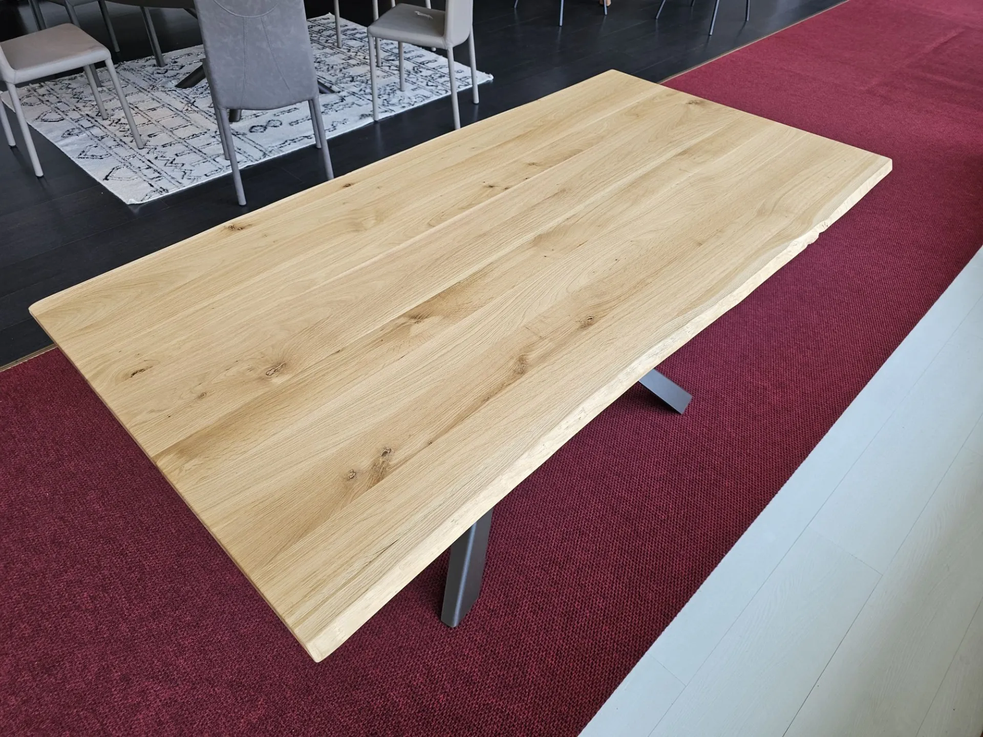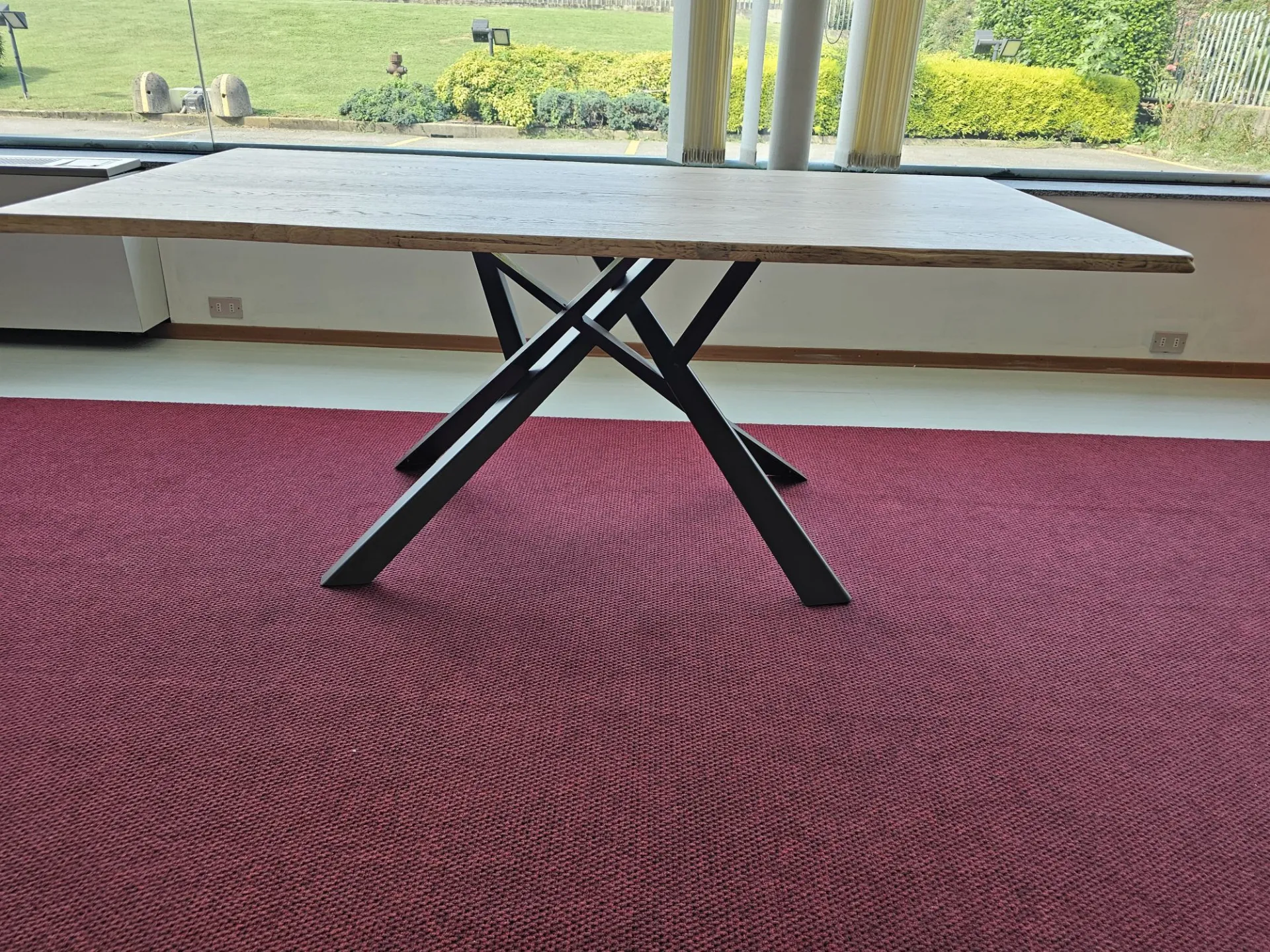 Fixed table model DIAGO, top in solid oak wood with debarked edge, base in bronze painted MT97 metal. MEASUREMENTS: 180x90x74h cm. Contact us for more information!