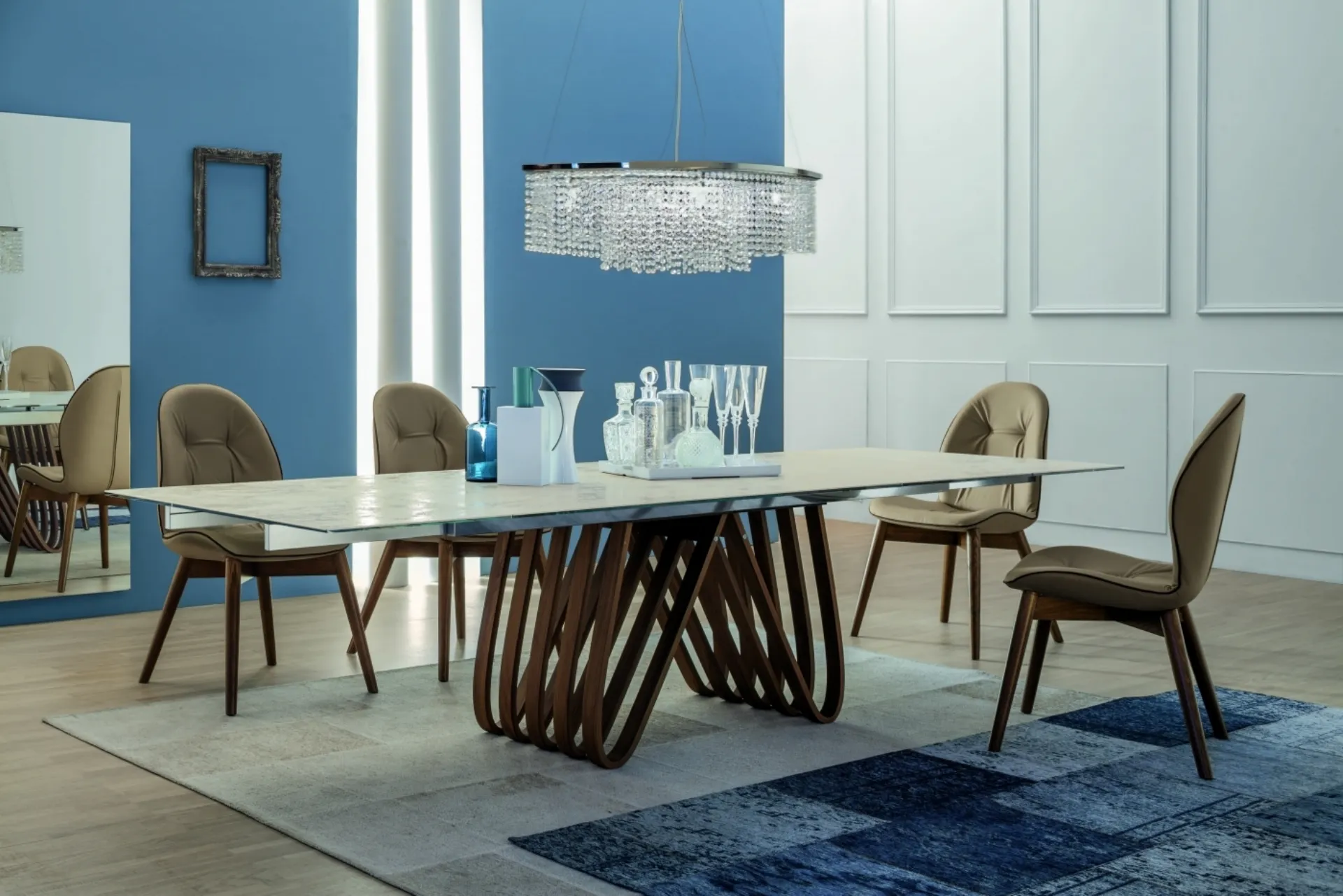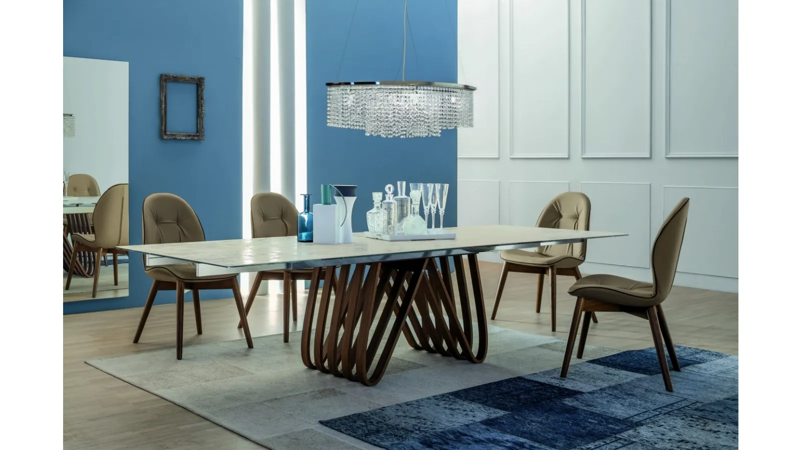 The dining area and the living room are domestic rooms par excellence dedicated to conviviality, where you are in company around the table with family and friends. Quality and attention to detail characterize the offer of compositions of the brand, which always ensures the complete satisfaction of customers once the project has been completed. The Arpa table with wooden structure with glass top by Tonin Casa in glass allows you to complete a pleasant and easy dining area with practicality and design. In the showroom you will be able to discover the most beautiful dining proposals signed by the renowned brand, always made of precious materials resistant over time. If you want to renovate the pieces of furniture you have at home or buy them for the first time, with us you can touch the different Tonin Casa extendable dining tables. Extendable tables of high aesthetic content for current homes, including those we present in the store, can also be inserted with a good aesthetic result in design spaces.