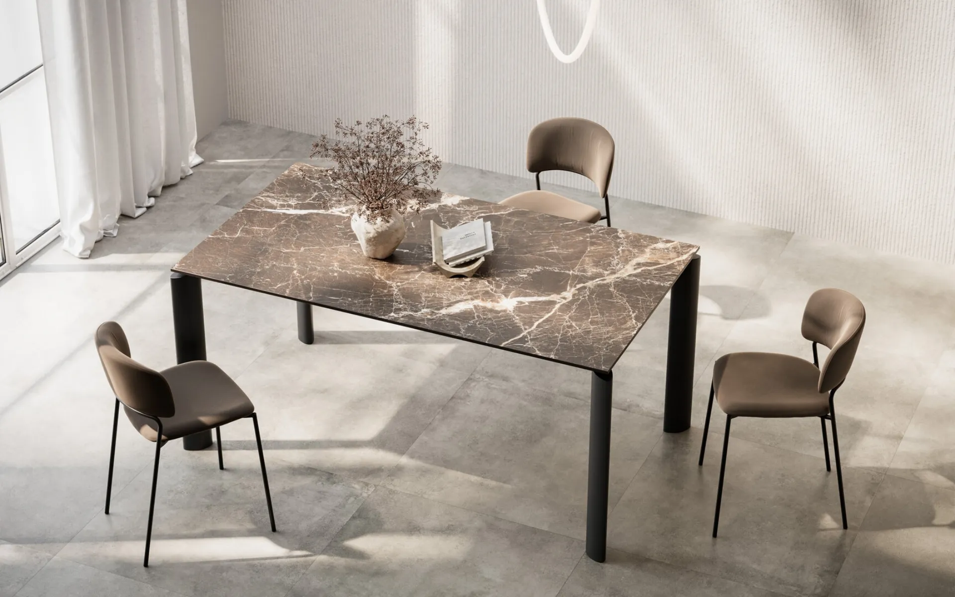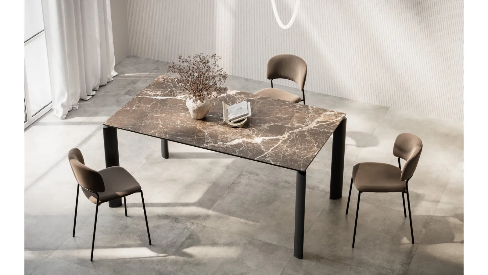 Ideal for creating unique combinations with modern chairs and accessories, the extendable tables from the brand are among the most original solutions on the market, perfect for the living room and kitchen. A model like the one in the photograph, paired with the right chairs, will enhance the atmosphere of the rooms dedicated to hospitality in the home. The extendable Icaro gres table by Arredo3, made of quality materials, features a bold top and a refined and elegant base. The well-known and renowned brand Arredo3, a leader in gres furniture, offers a wide range of finishes, shapes, and tones for its line. If you are looking for a dining table with great design, contact us to receive information and quotes on the model featured in the photo.