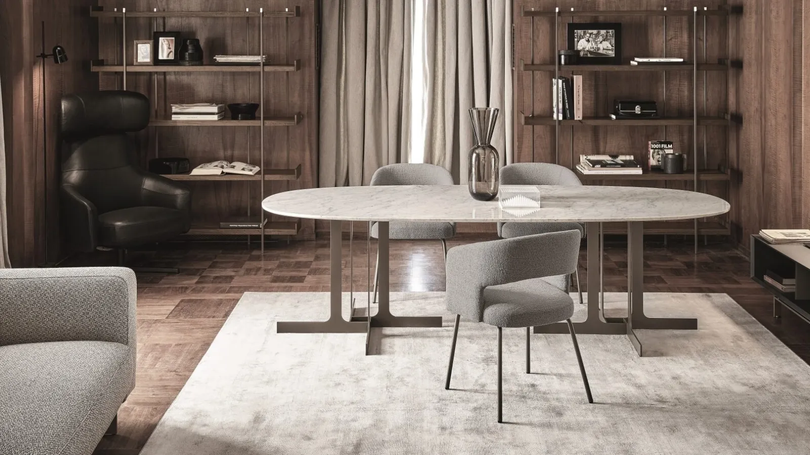 I tavoli della serie Nell di Ditre Italia si distinguono per un'estetica raffinata, evidenziata dal piano superiore disponibile in diverse finiture materiche come legno, marmo o vetro, che crea un interessante contrasto visivo. La base, realizzata con una struttura metallica di estrema leggerezza, presenta un design a lame sottili. Questa configurazione ingegneristica ne permette un impiego versatile, sia come elemento d'arredo singolo che in composizioni accoppiate. La gamma offre inoltre una varietà di geometrie, includendo varianti rotonde, ovali e rettangolari, per adattarsi a diverse esigenze progettuali. Un sistema costruttivo che assicura solidità e durata, offrendo soluzioni di arredo all'avanguardia.