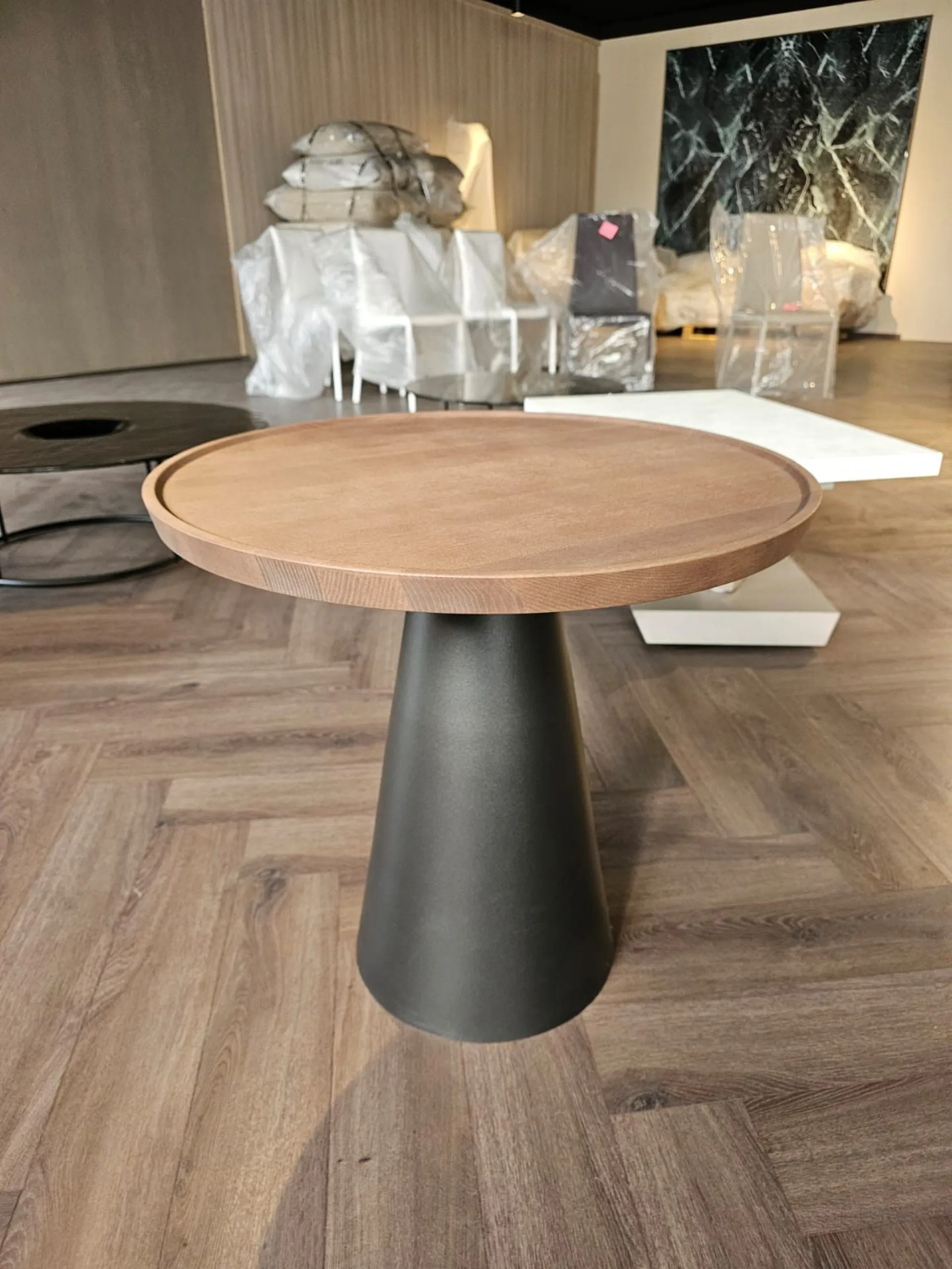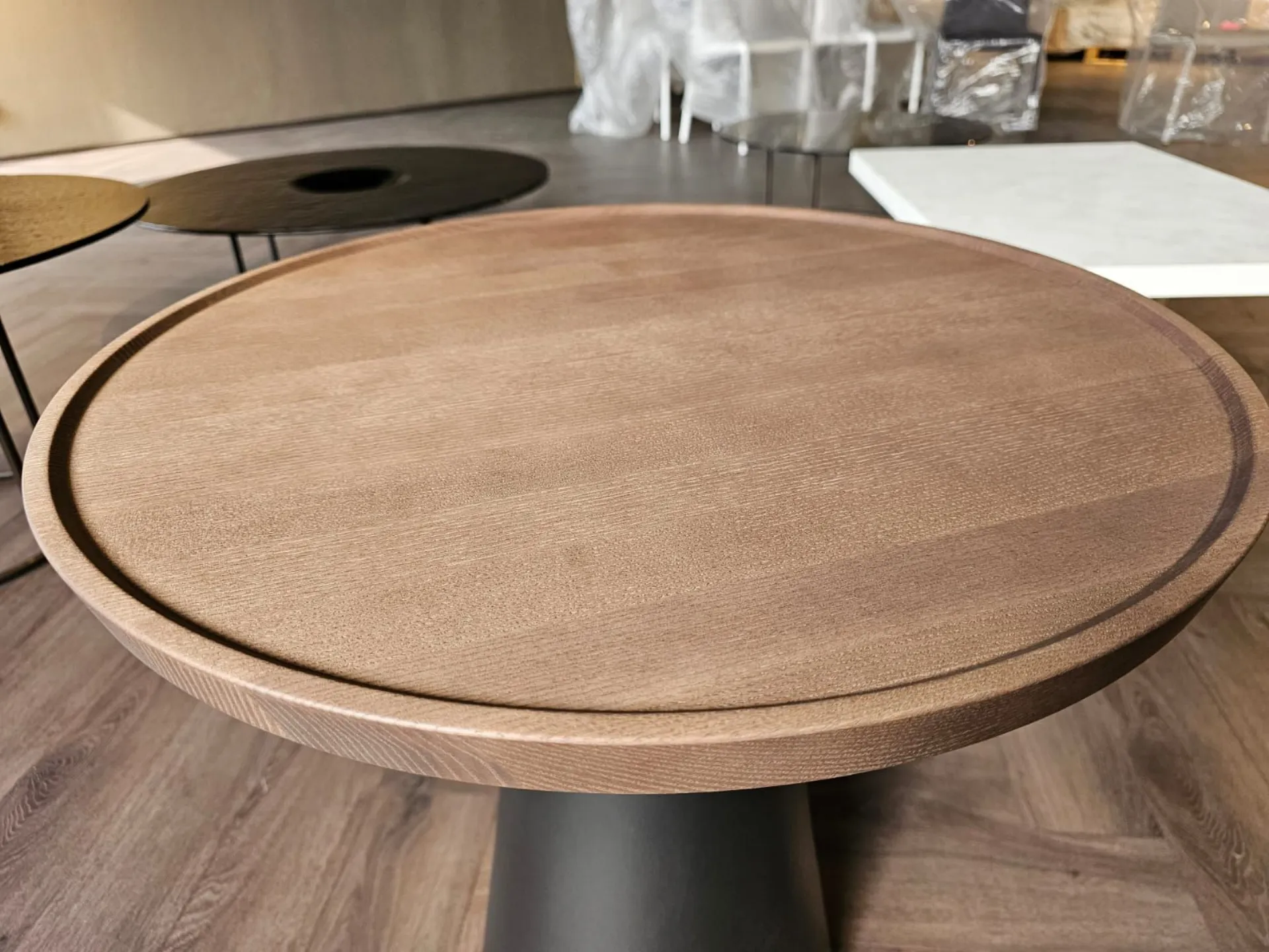 Round oak coffee table in wild tobacco finish PW97, with a diameter of 60cm. Graphite color base MT98. Product available for immediate delivery.