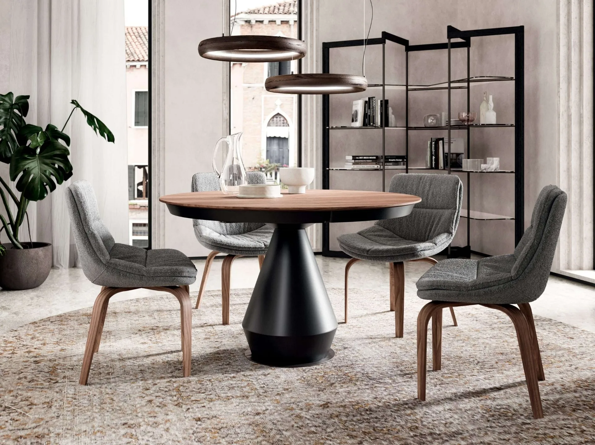 Tables are furnishing accessories thanks to which the living room, the kitchen or even other rooms in the house can be embellished, thanks to durable materials and imaginative color combinations. Tables are essential furnishings in every home: complete your furnishing concept and give life to the home you've always wanted. The extendable wooden models like the one shown in the photo adapt to the most diverse living spaces and environments, being truly multipurpose and robust. Fill out the form and contact us to discover the Home Furnishings of the best brands, Ozzio branded tables and chairs. Lycos Legno extendable round table by Ozzio : discover a rich range of furniture and dining accessories to complete your premises by counting on different design possibilities.