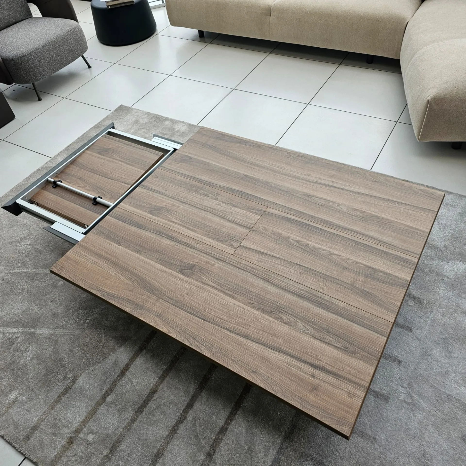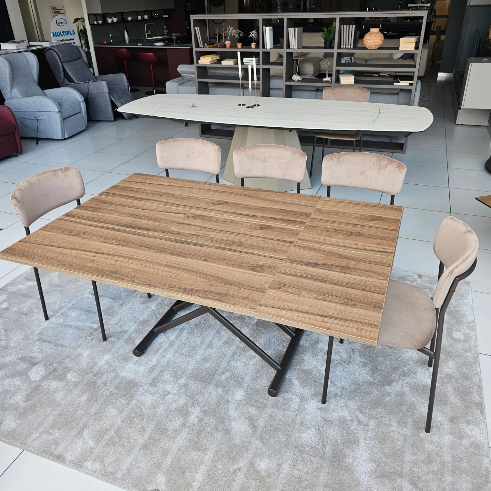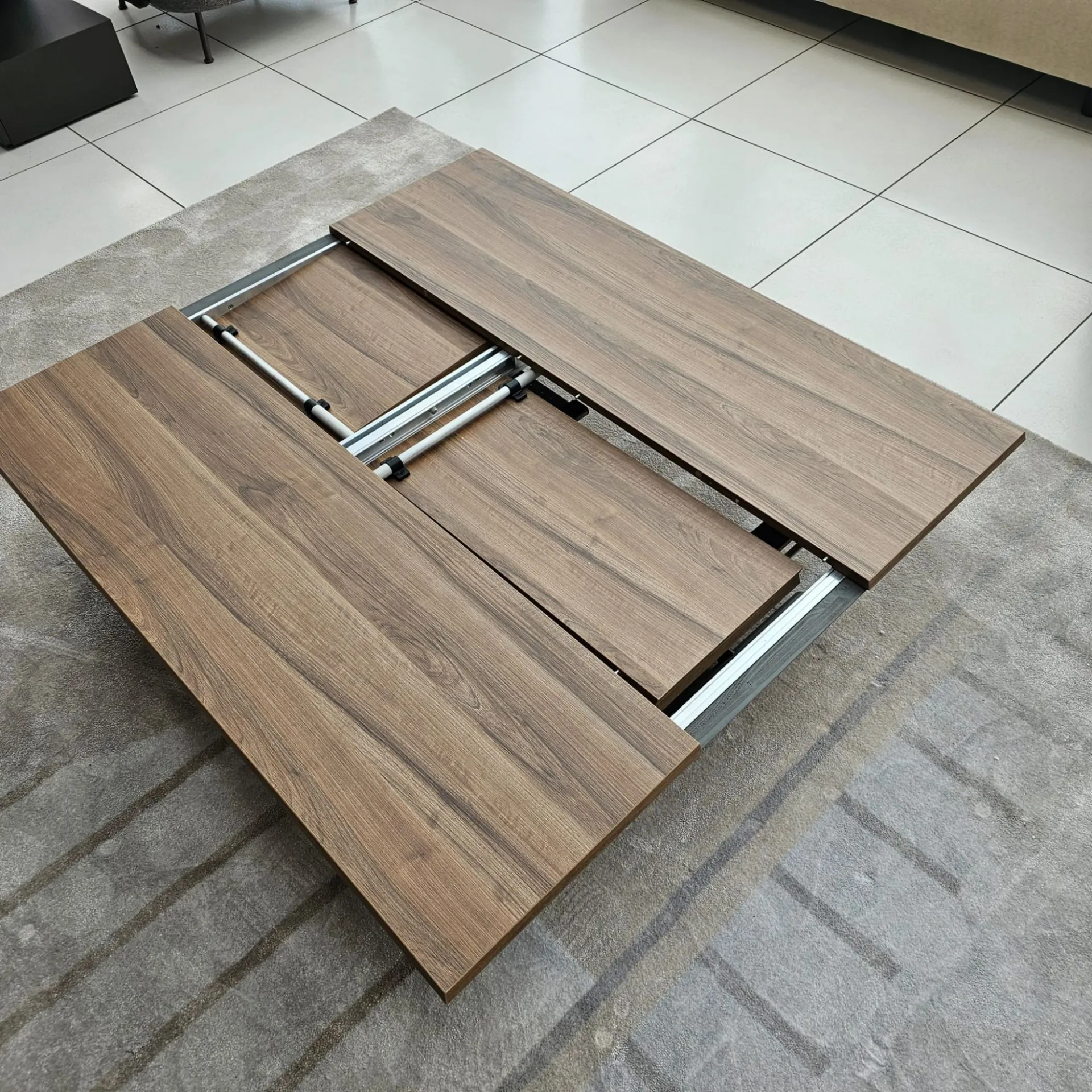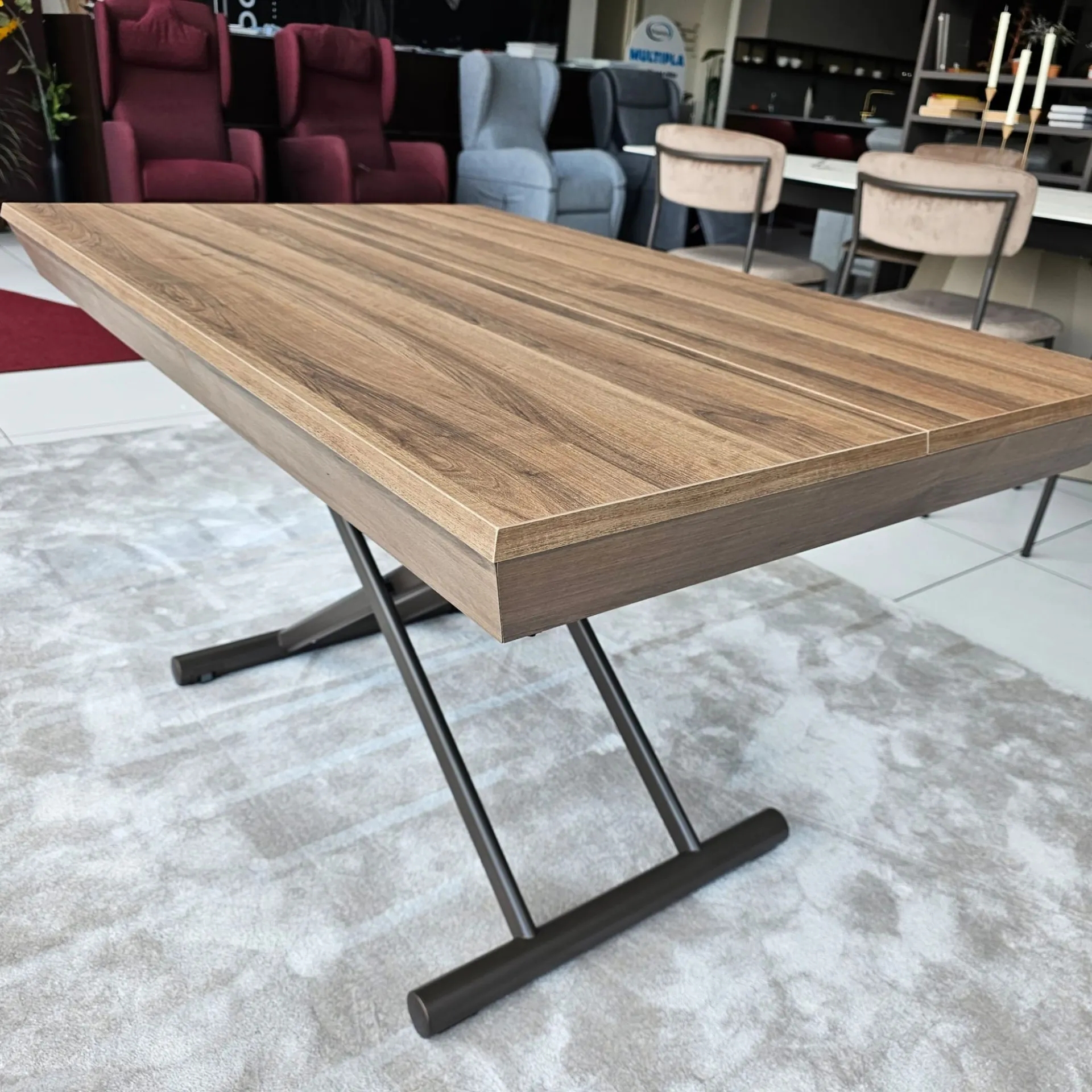 Transformable MORE & MORE extendable and expandable table, lifting with gas piston and wheels, aluminum extension mechanism, eco-wood canaletto top, bronze metal base.