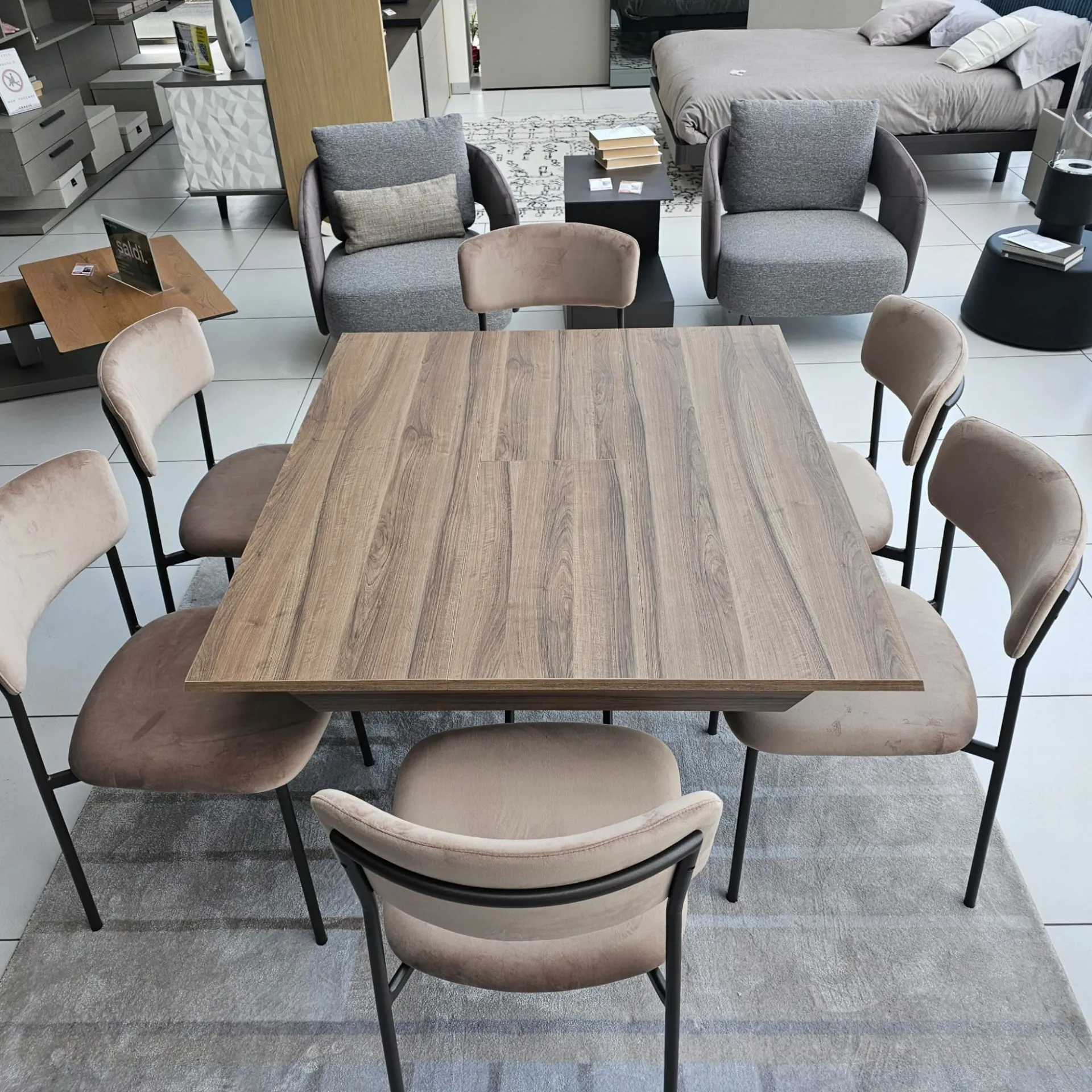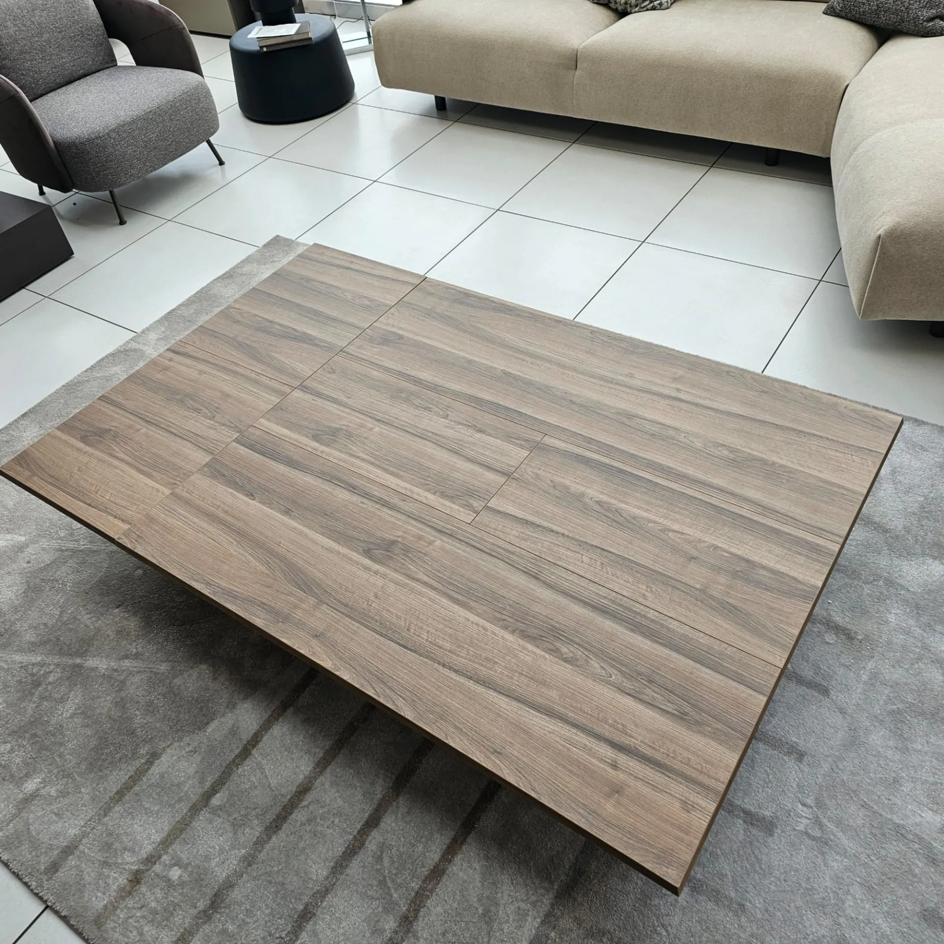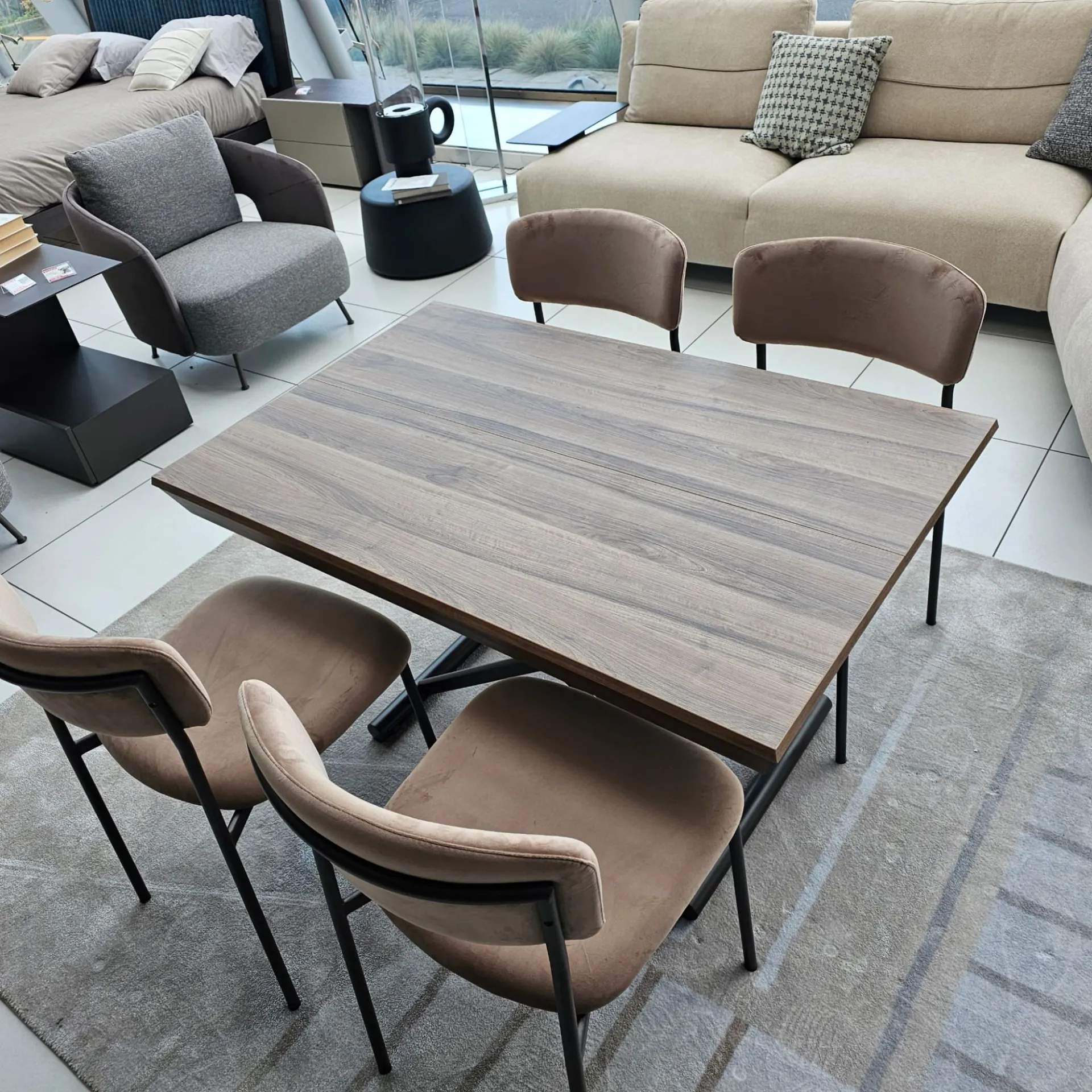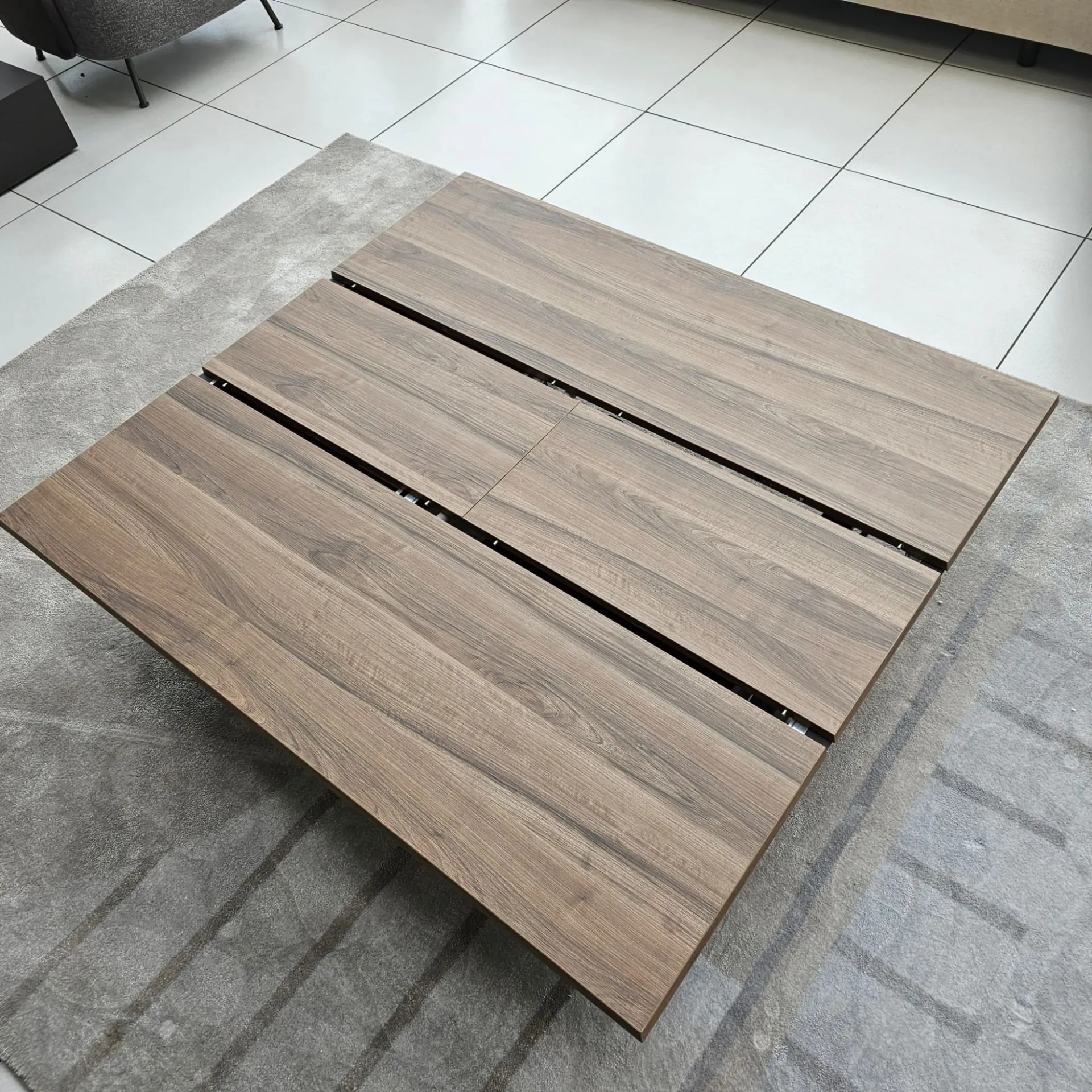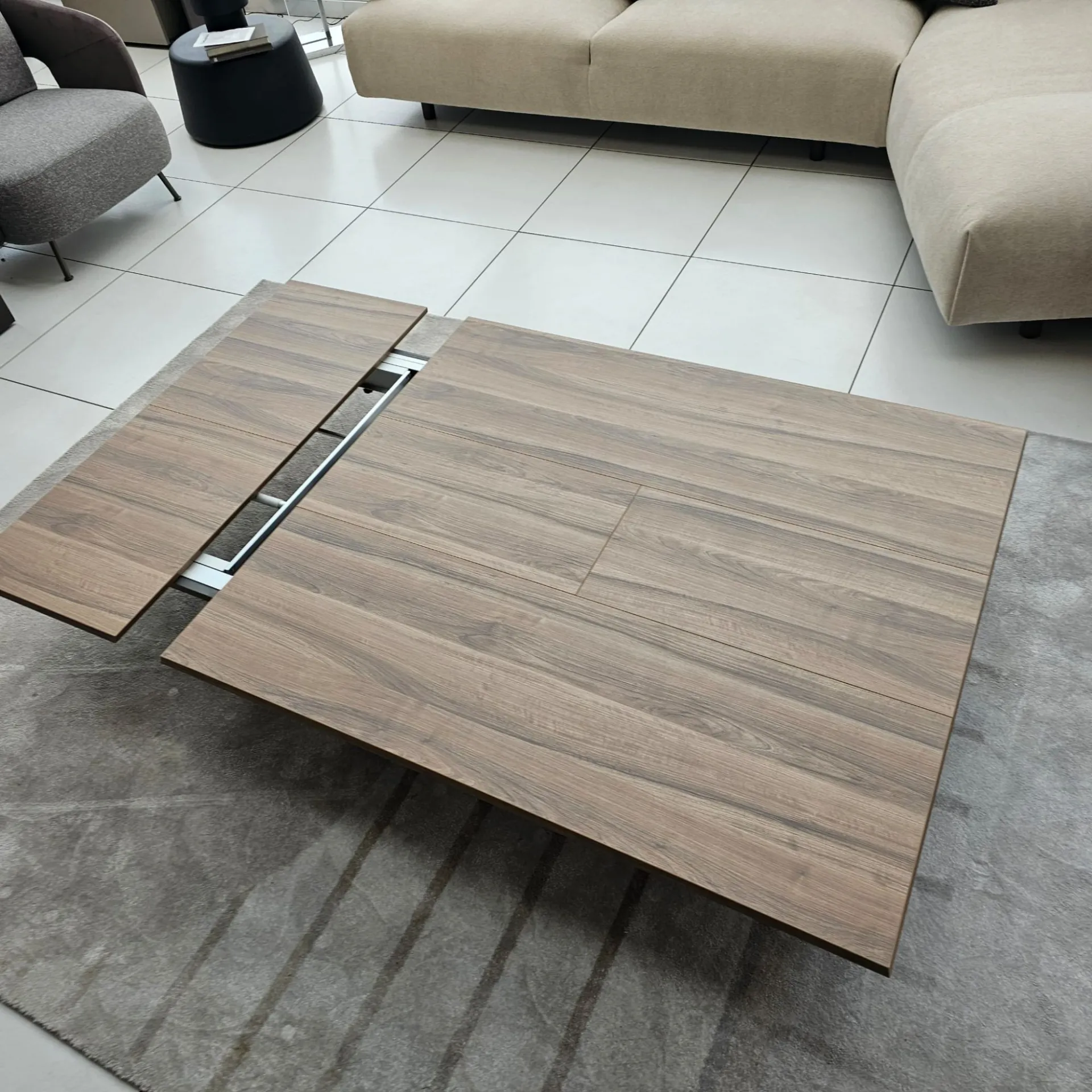 Transformable MORE & MORE extendable and expandable table, lifting with gas piston and wheels, aluminum extension mechanism, eco-wood canaletto top, bronze metal base.
