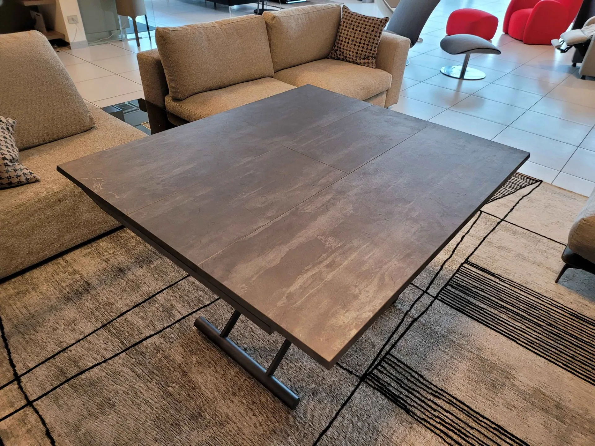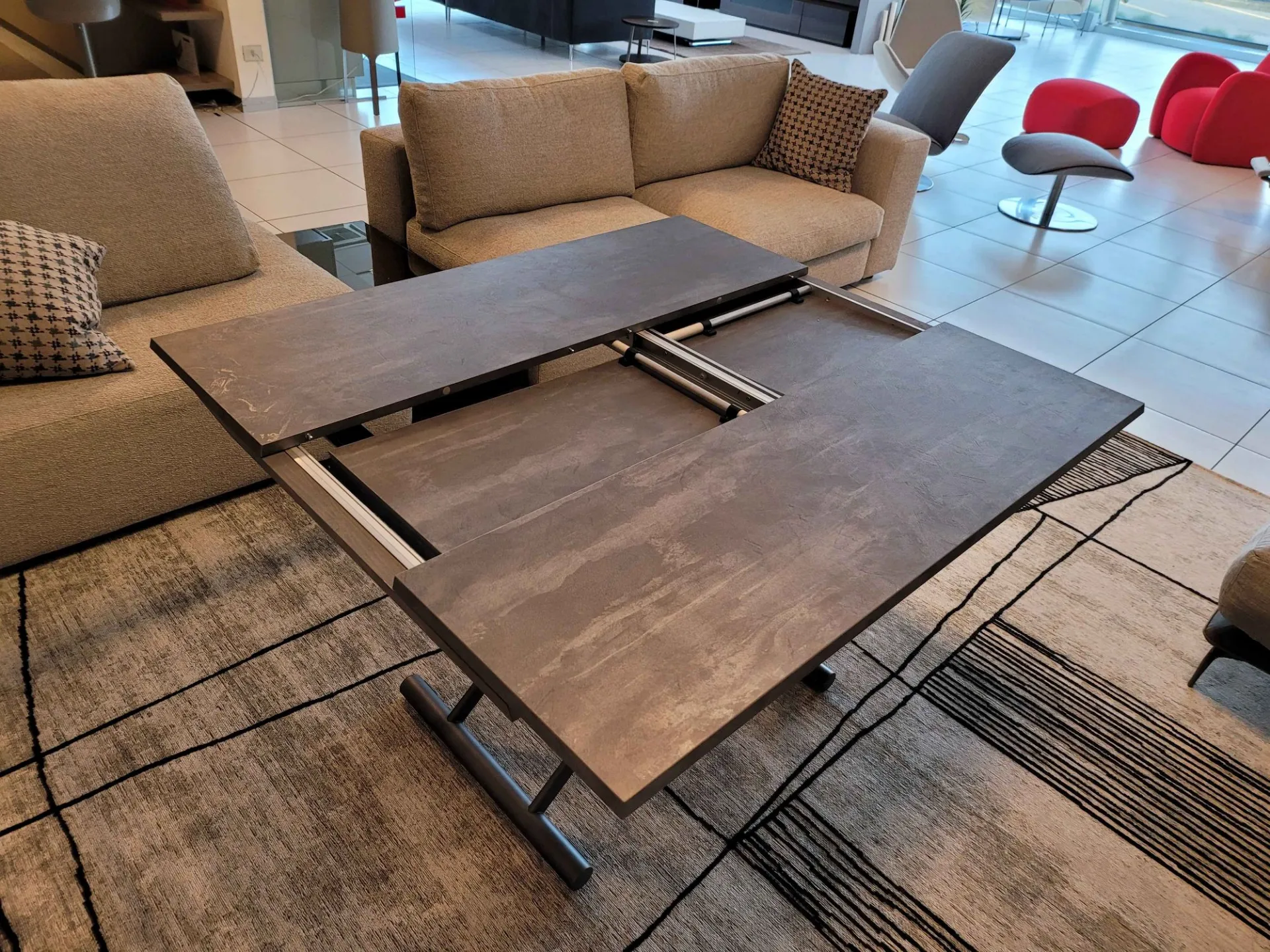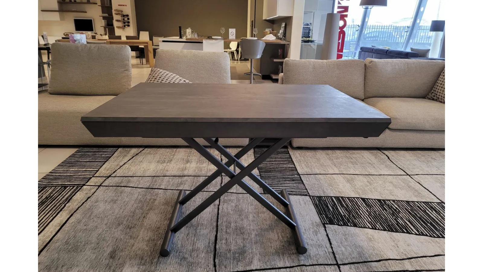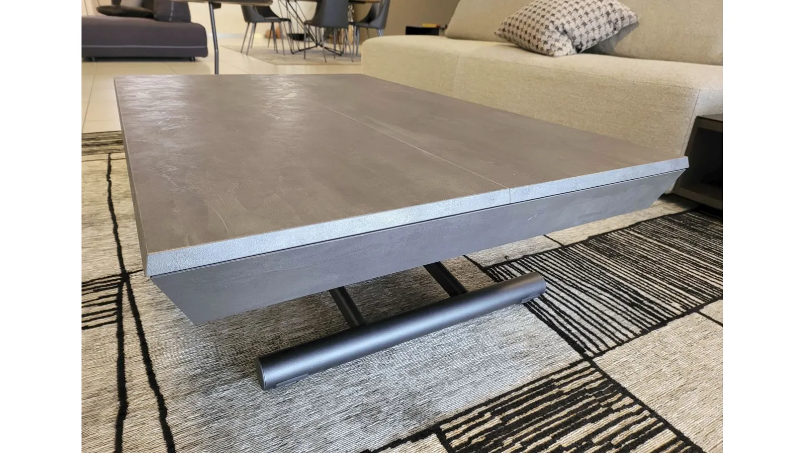 Beautiful transformable coffee table mod.MORE& MORE with unique features! E’ in fact liftable, extendable and expandable thanks to the internal extensions. Equipped with wheels and lift with gas piston. Adjustable in all heights to the millimeter, so l’ height not è fixed and può be adjusted as desired. Top and extensions (19mm) in eco wood structure in painted metal. Extending mechanism in aluminum of the highest qualityà ;! Its measure when closed è cm L.125xP.80xH.35, when open it measures cm L.110xP.125xH.93 and when completely open it measures cm L.110xP.168, obtaining così up to 10 seats! The legs are thin but at the same time sturdy and solid in anthracite painted metal. The è plan; in brushed eco-wood with Stone finish