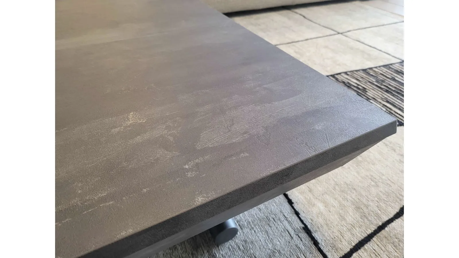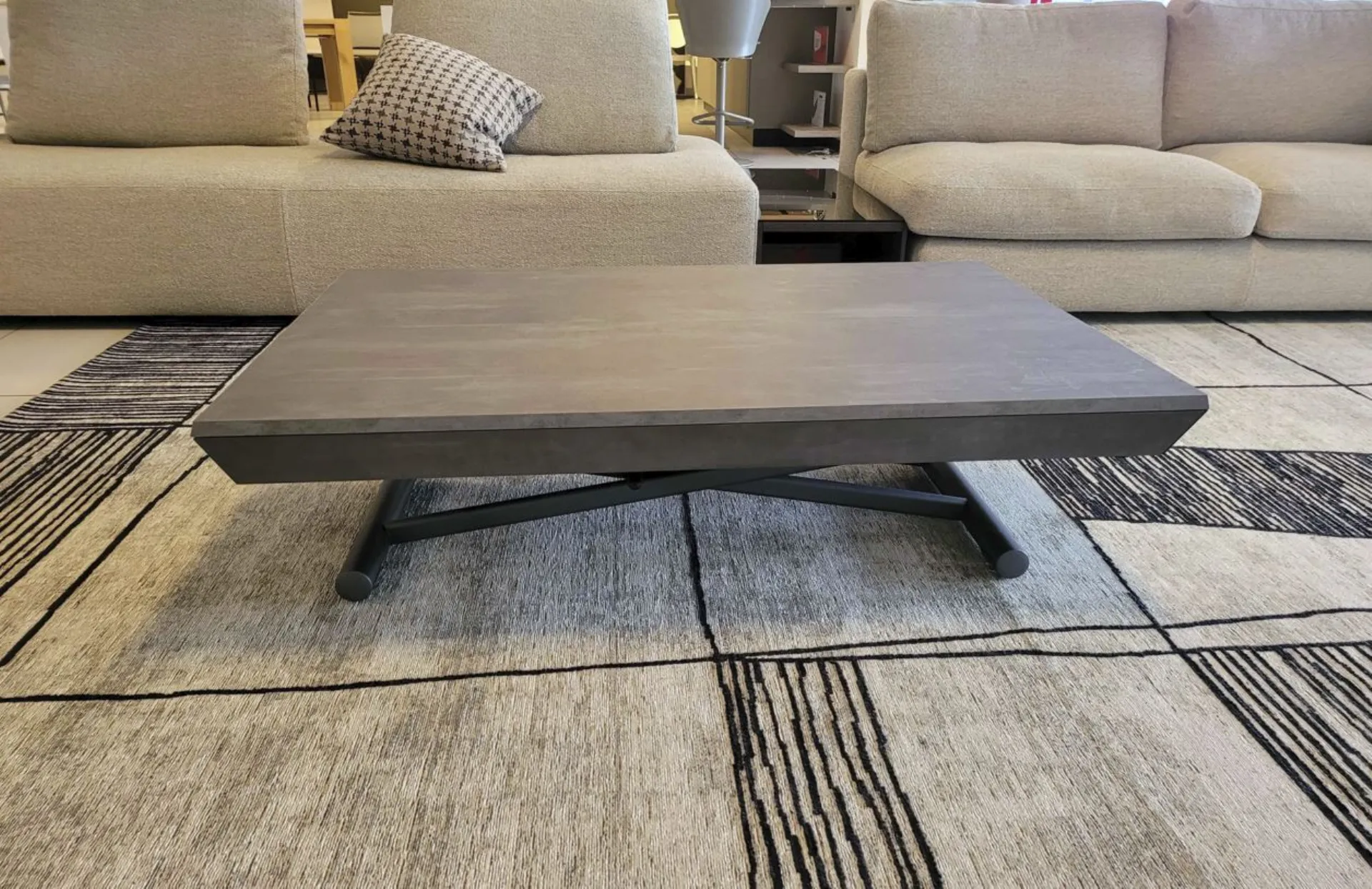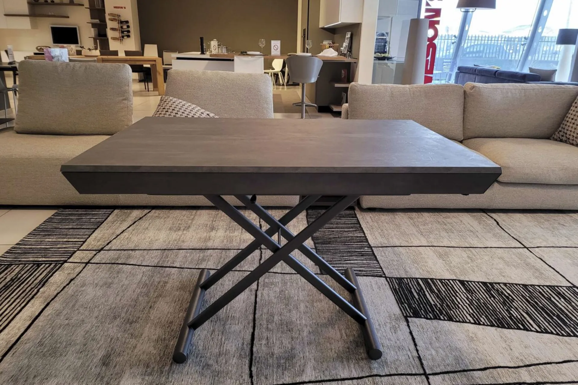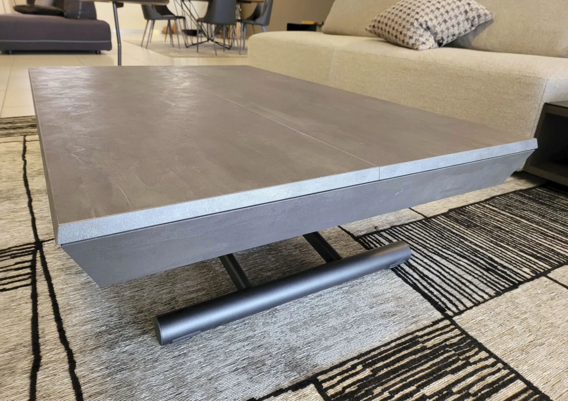 Beautiful transformable coffee table mod.MORE& MORE with unique features! E’ in fact liftable, extendable and expandable thanks to the internal extensions. Equipped with wheels and lift with gas piston. Adjustable in all heights to the millimeter, so l’ height not è fixed and può be adjusted as desired. Top and extensions (19mm) in eco wood structure in painted metal. Extending mechanism in aluminum of the highest qualityà ;! Its measure when closed è cm L.125xP.80xH.35, when open it measures cm L.110xP.125xH.93 and when completely open it measures cm L.110xP.168, obtaining così up to 10 seats! The legs are thin but at the same time sturdy and solid in anthracite painted metal. The è plan; in brushed eco-wood with Stone finish