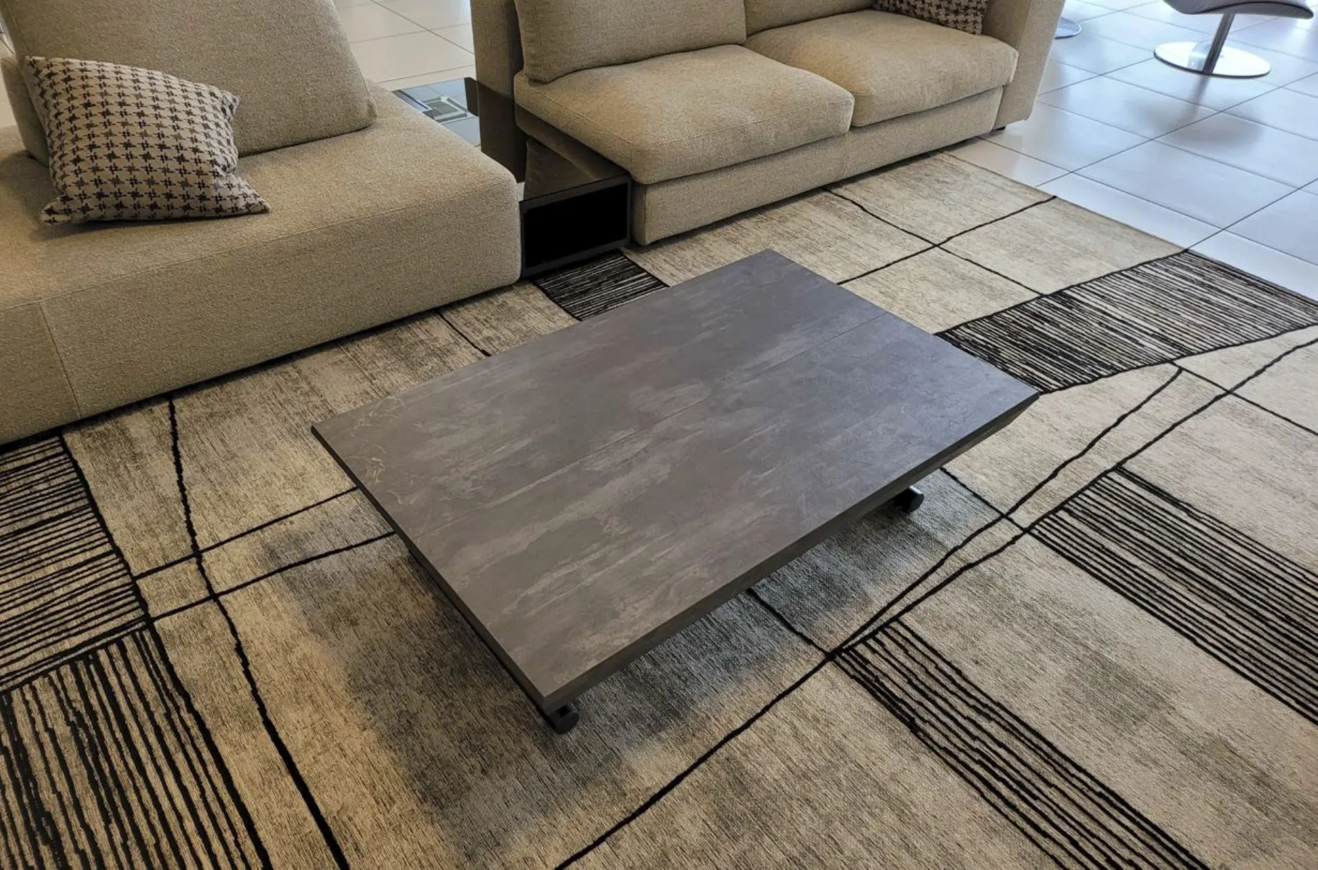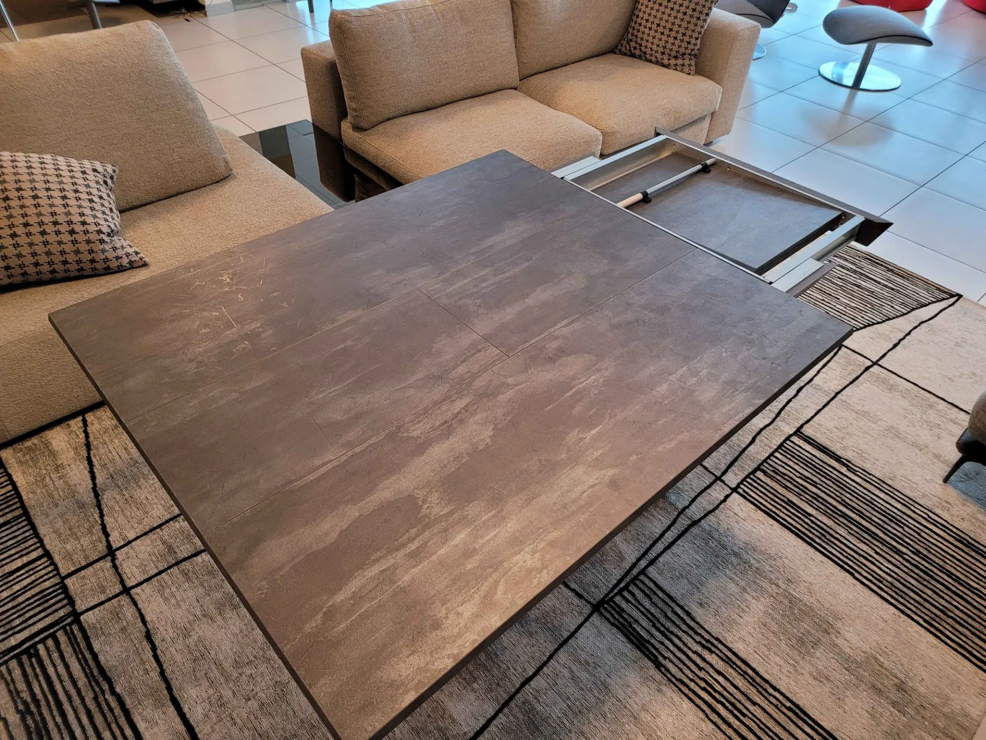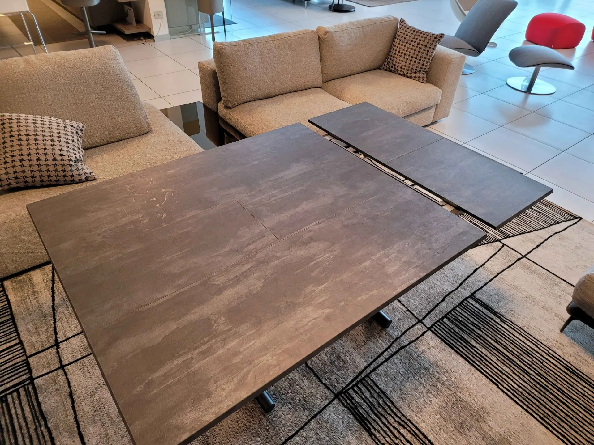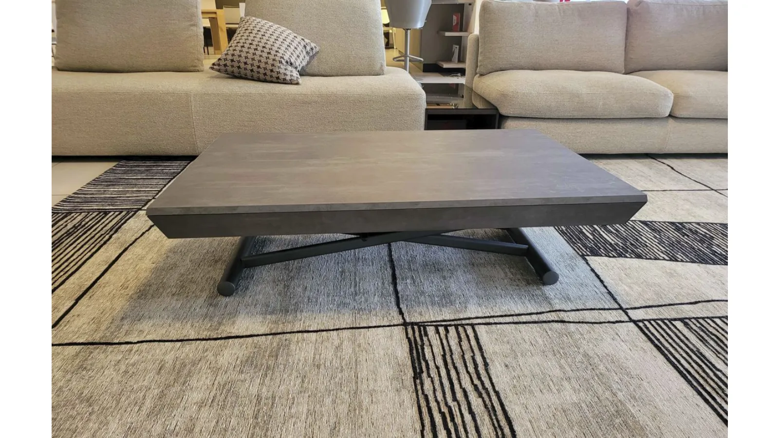 Beautiful transformable coffee table mod.MORE& MORE with unique features! E’ in fact liftable, extendable and expandable thanks to the internal extensions. Equipped with wheels and lift with gas piston. Adjustable in all heights to the millimeter, so l’ height not è fixed and può be adjusted as desired. Top and extensions (19mm) in eco wood structure in painted metal. Extending mechanism in aluminum of the highest qualityà ;! Its measure when closed è cm L.125xP.80xH.35, when open it measures cm L.110xP.125xH.93 and when completely open it measures cm L.110xP.168, obtaining così up to 10 seats! The legs are thin but at the same time sturdy and solid in anthracite painted metal. The è plan; in brushed eco-wood with Stone finish