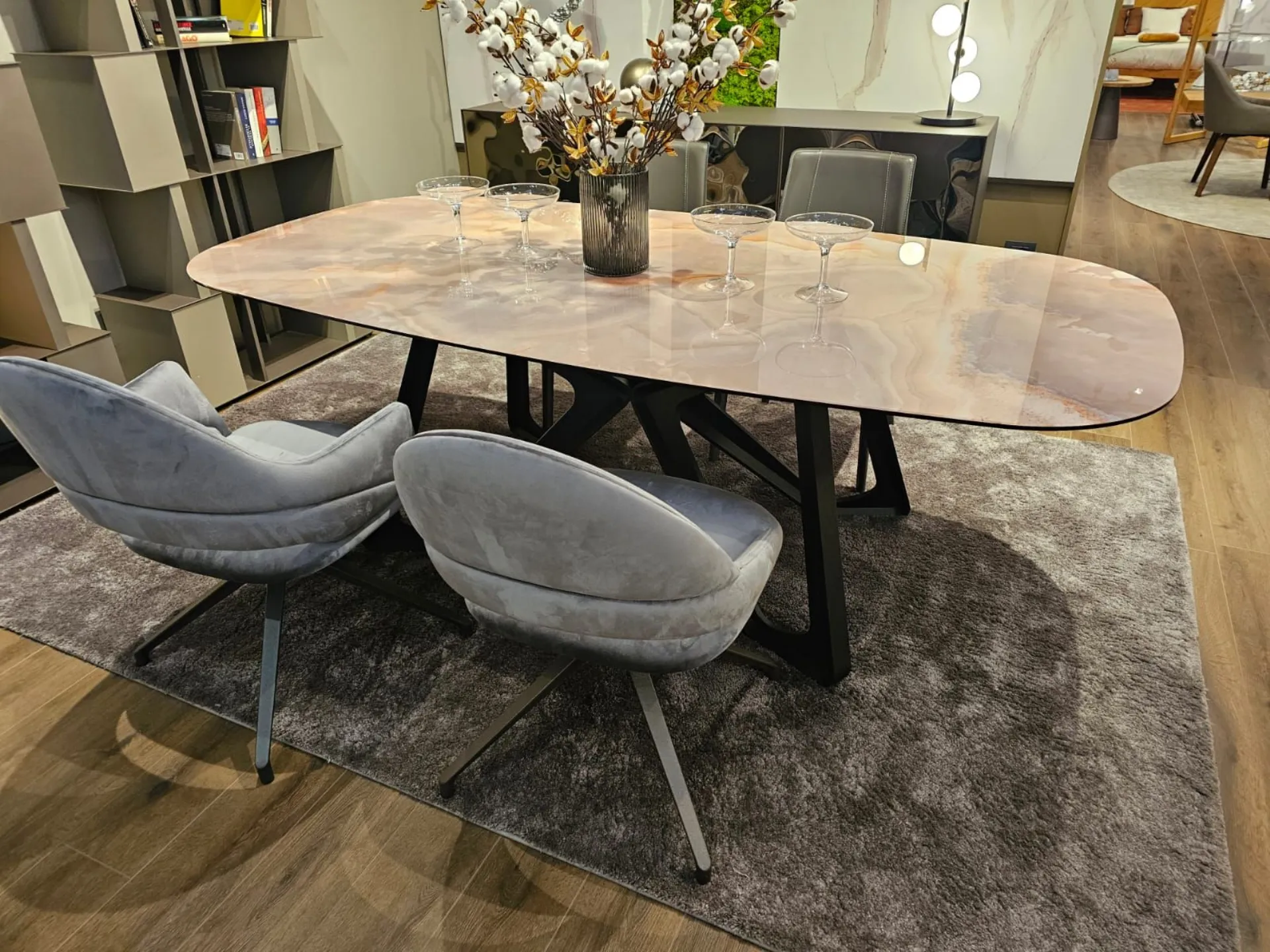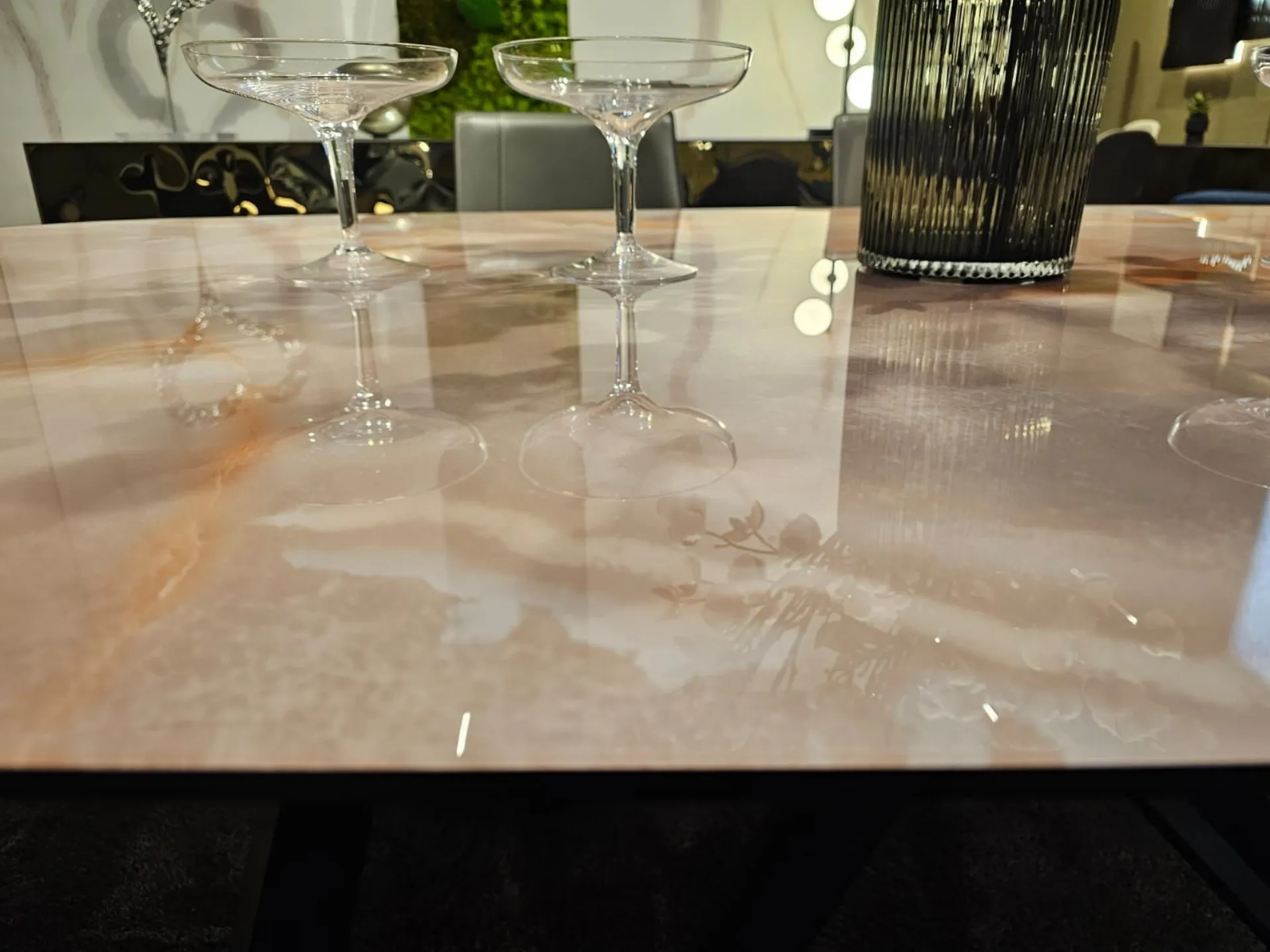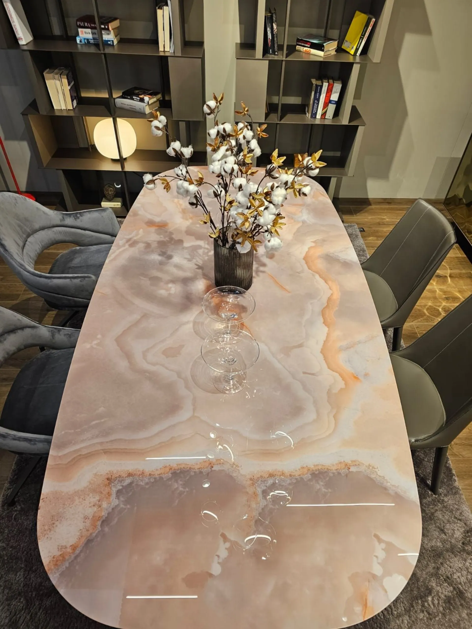 Fixed table with barrel top, measuring cm L.220xP.110xH.73.5. Top in glossy onyx marble glass MG03. Base in carbon wood PW94. Product available for immediate delivery. Contact us for more information.