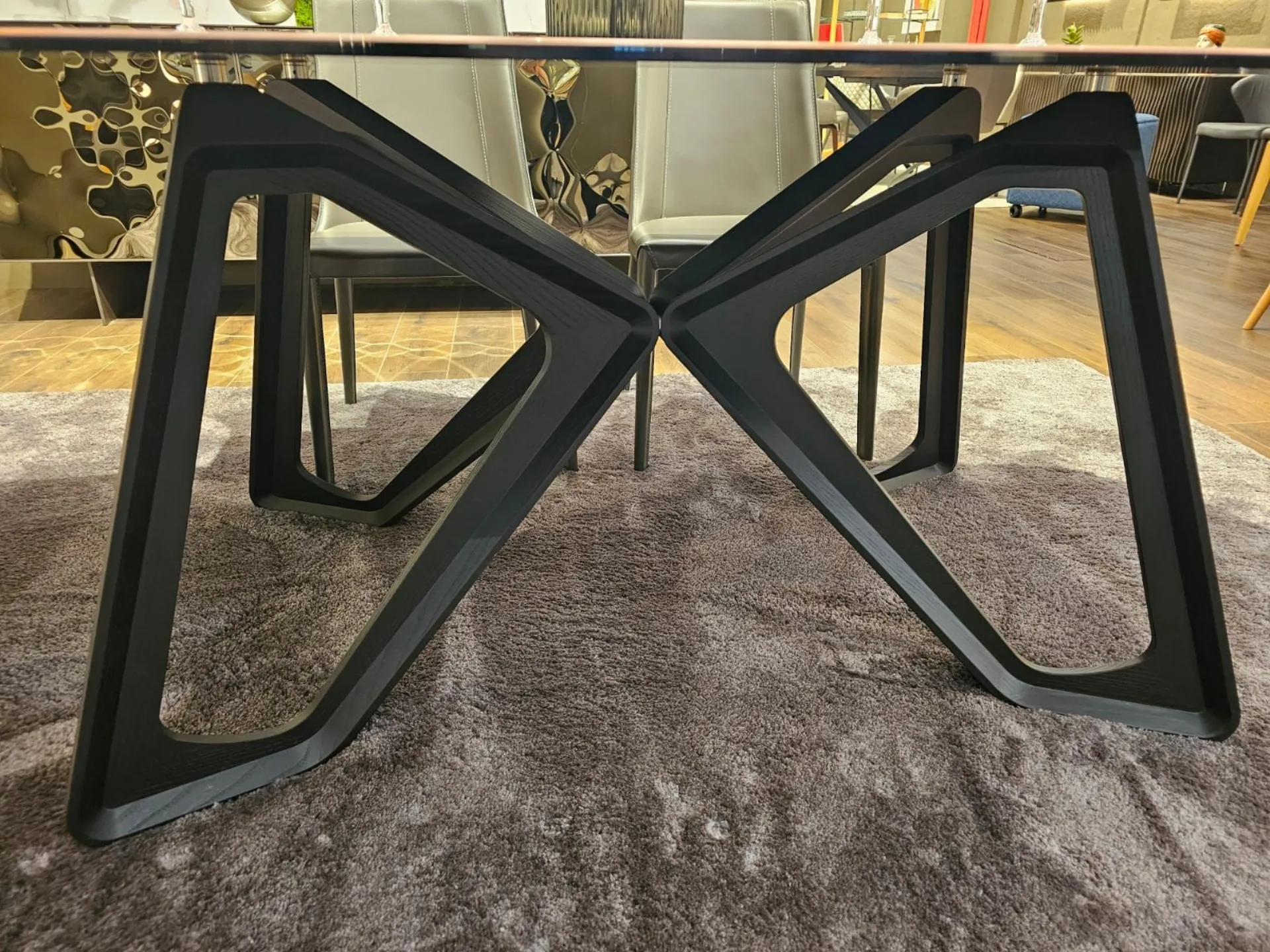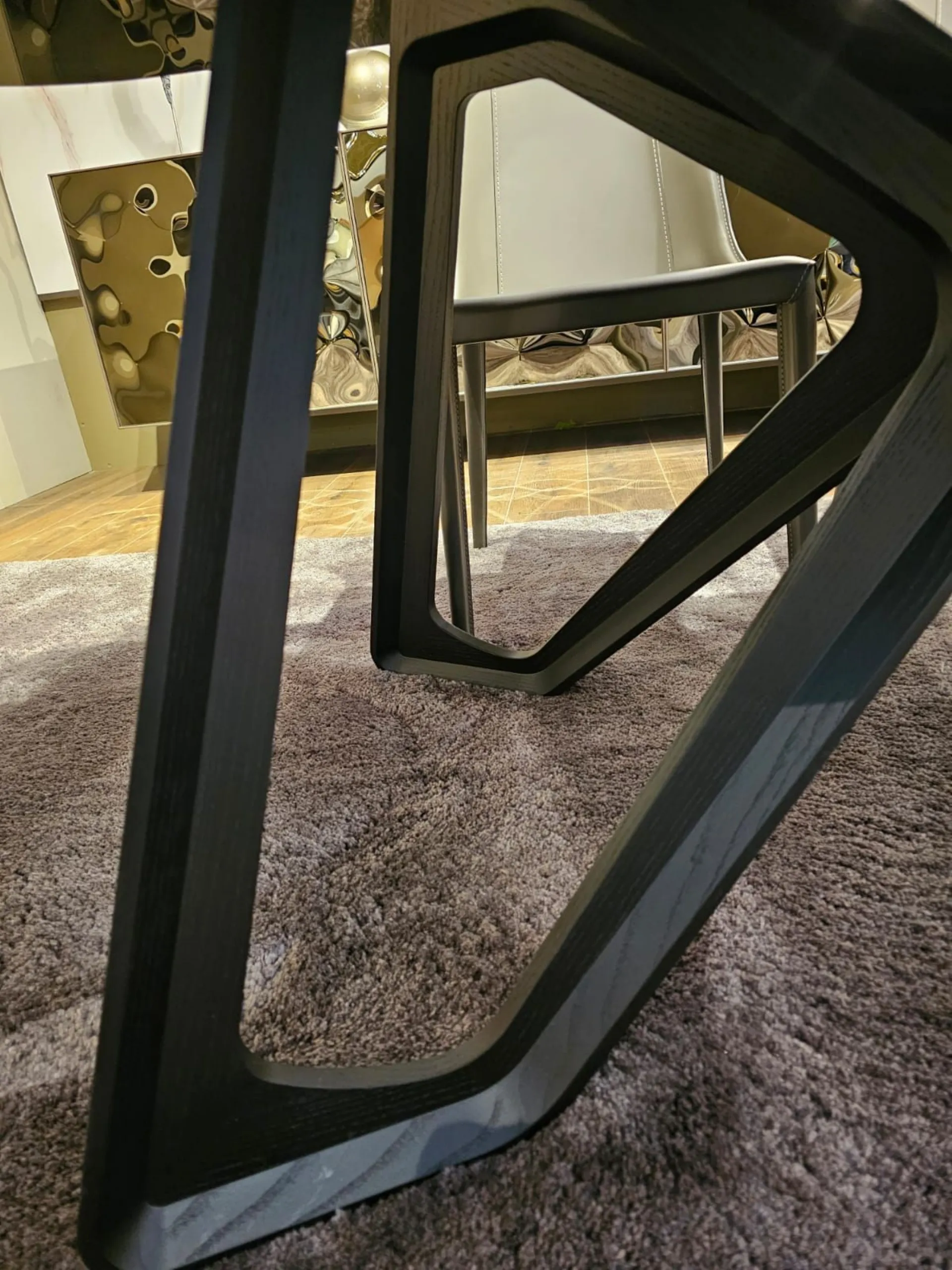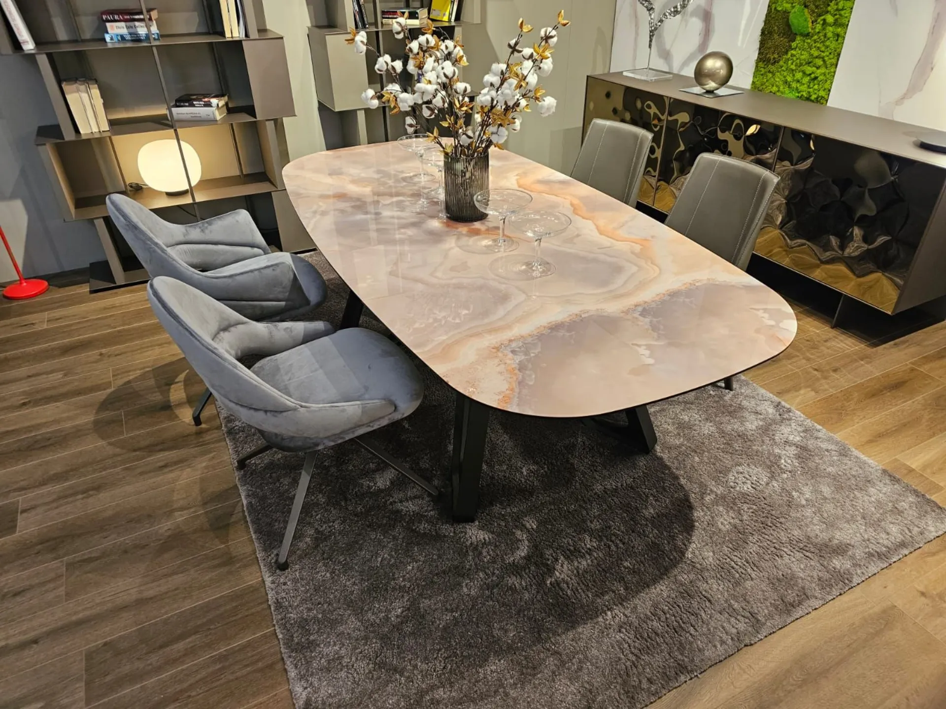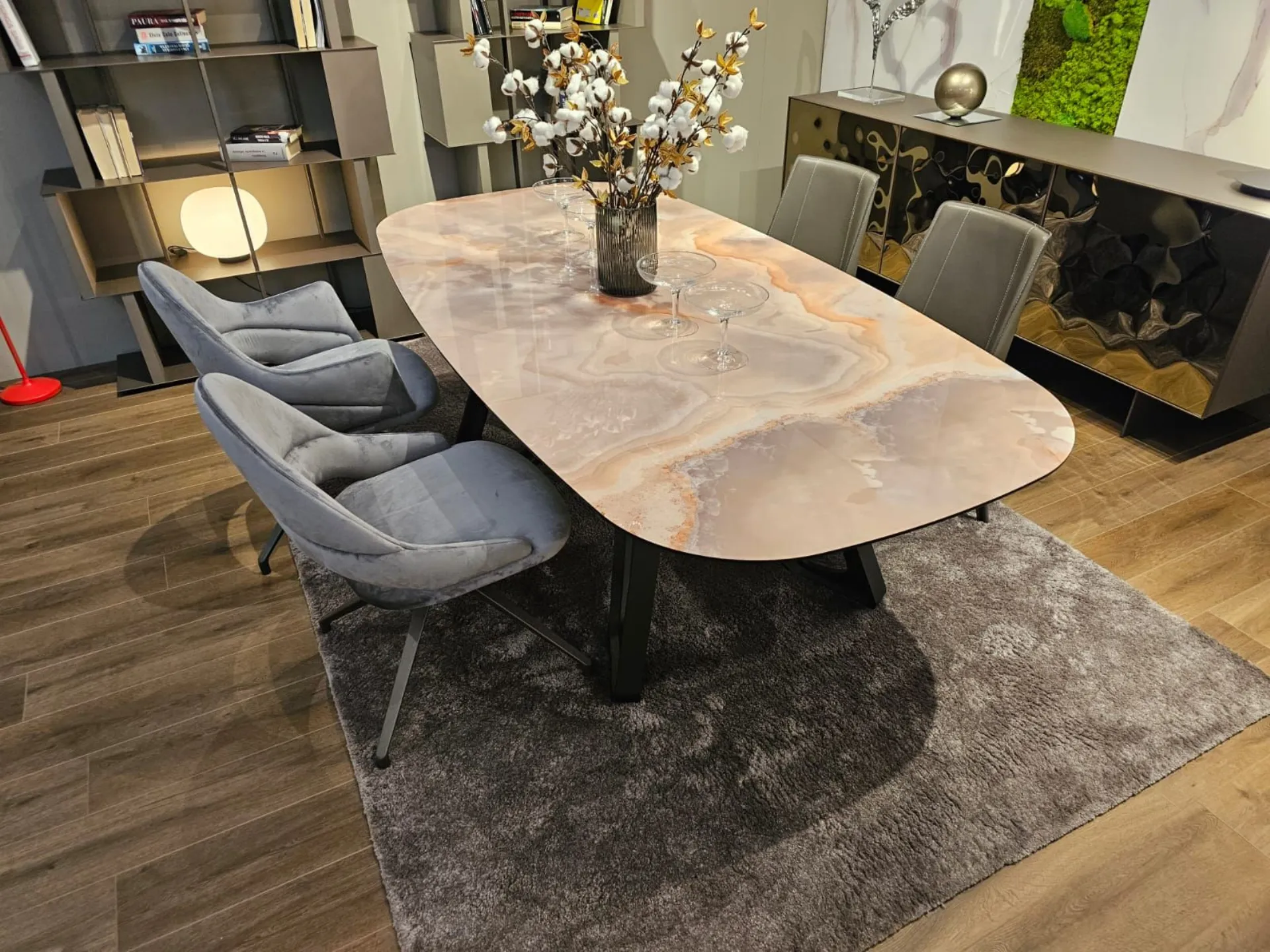 Fixed table with barrel top, measuring cm L.220xP.110xH.73.5. Top in glossy onyx marble glass MG03. Base in carbon wood PW94. Product available for immediate delivery. Contact us for more information.