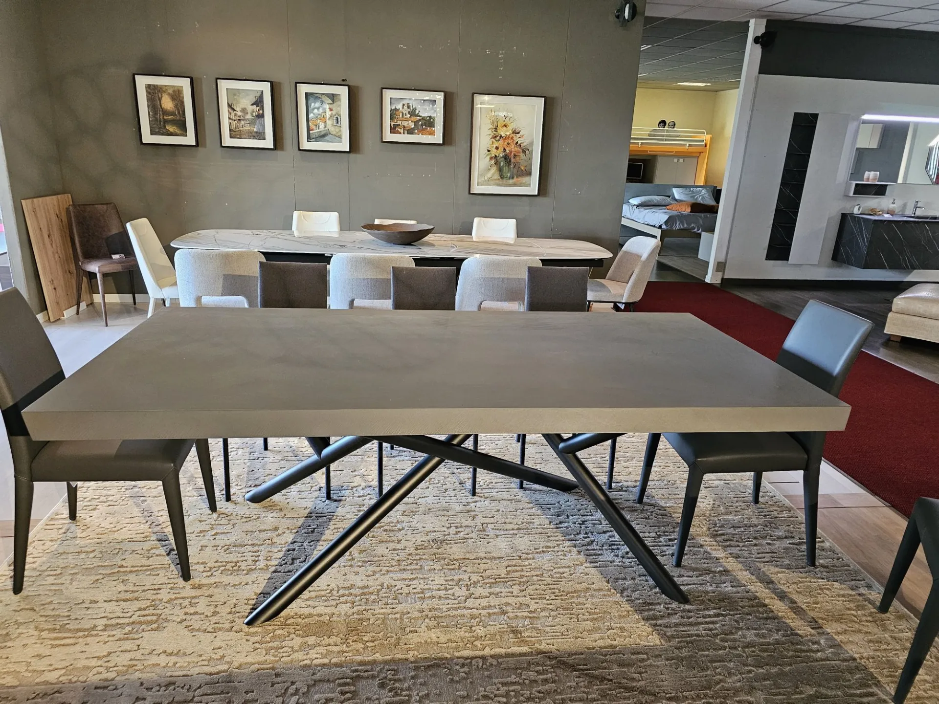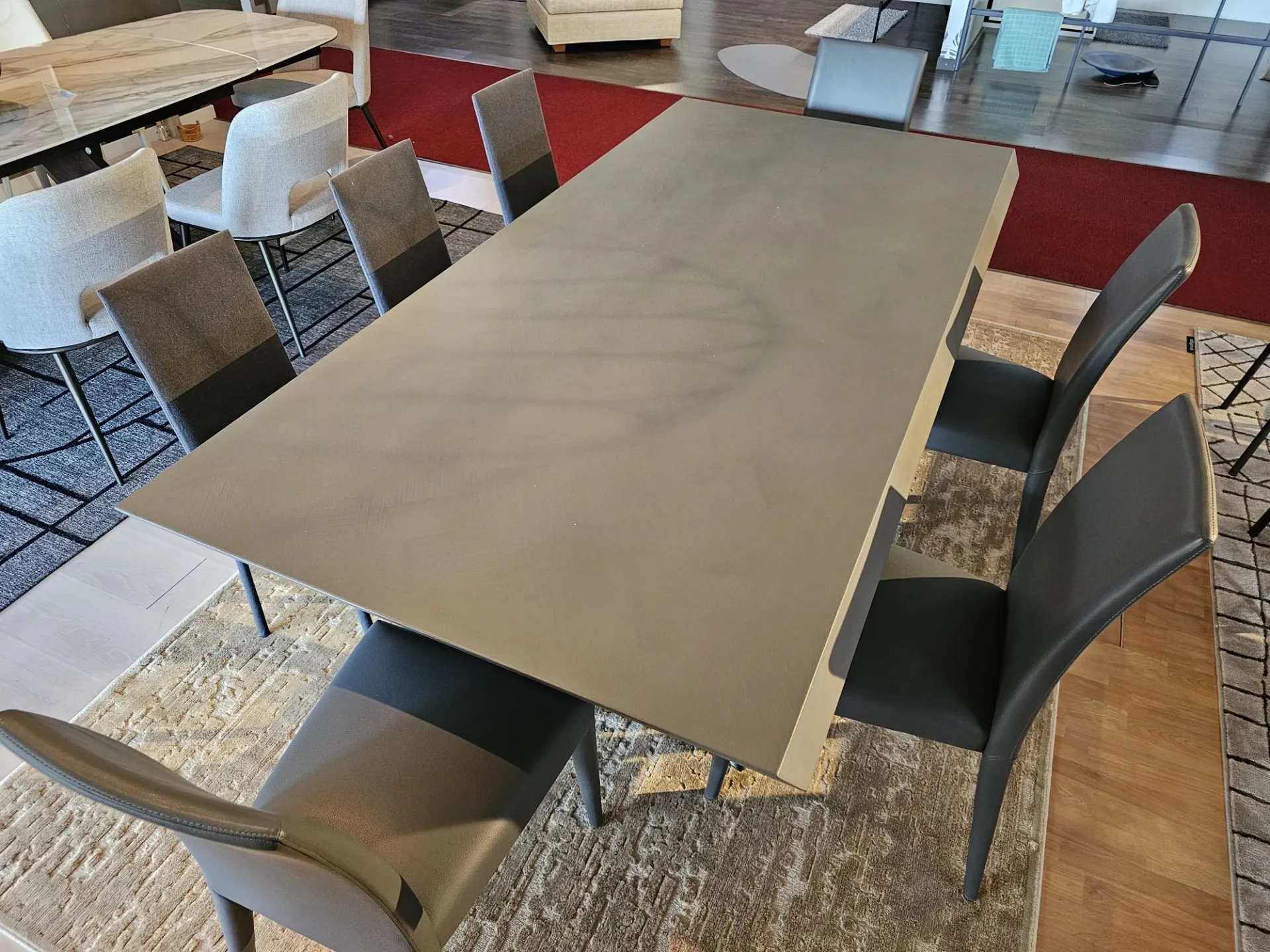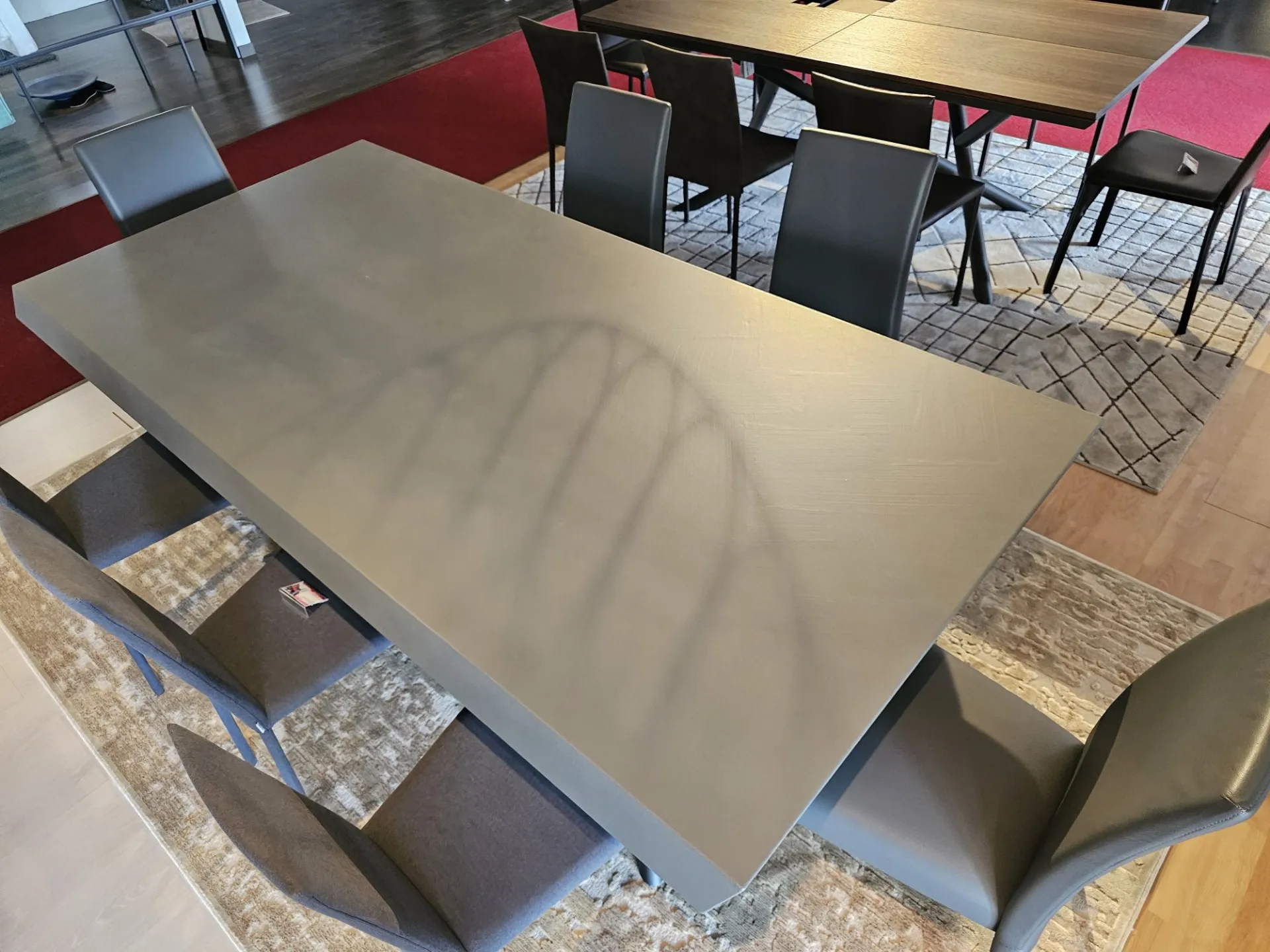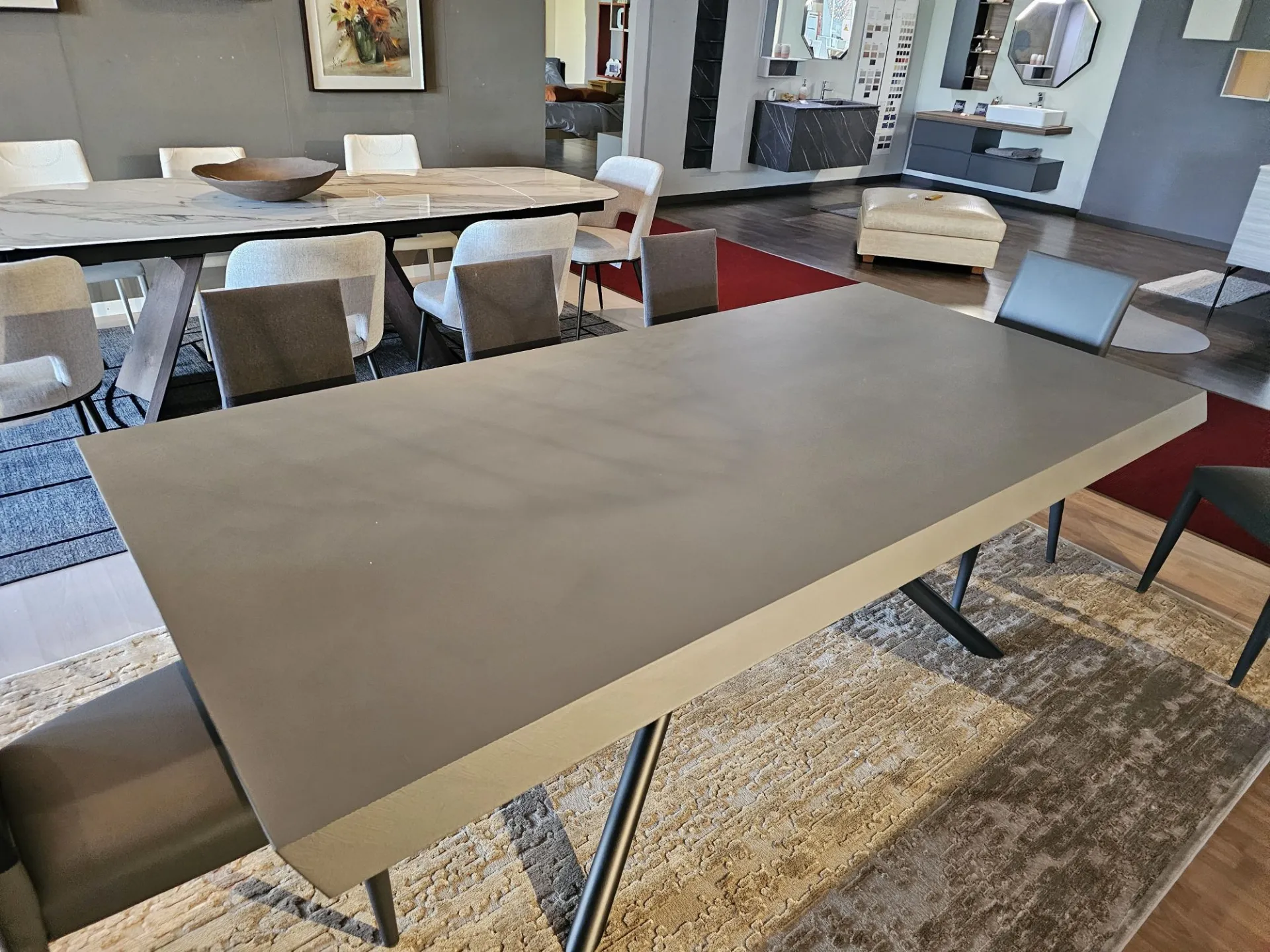 Fixed table mod.RANDOM with a thick top in Cement CM61 finish and bronze metal base MT97. The table measures cm. 220x110x77.5h. Contact us for more information.