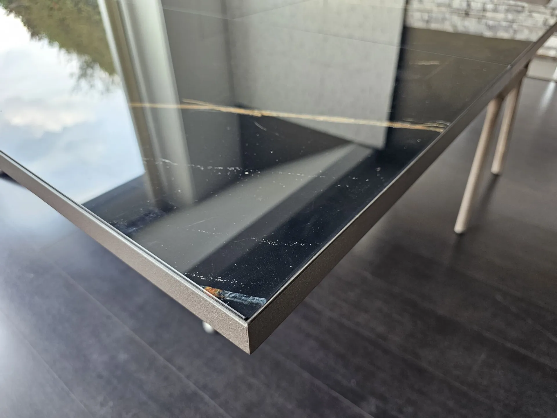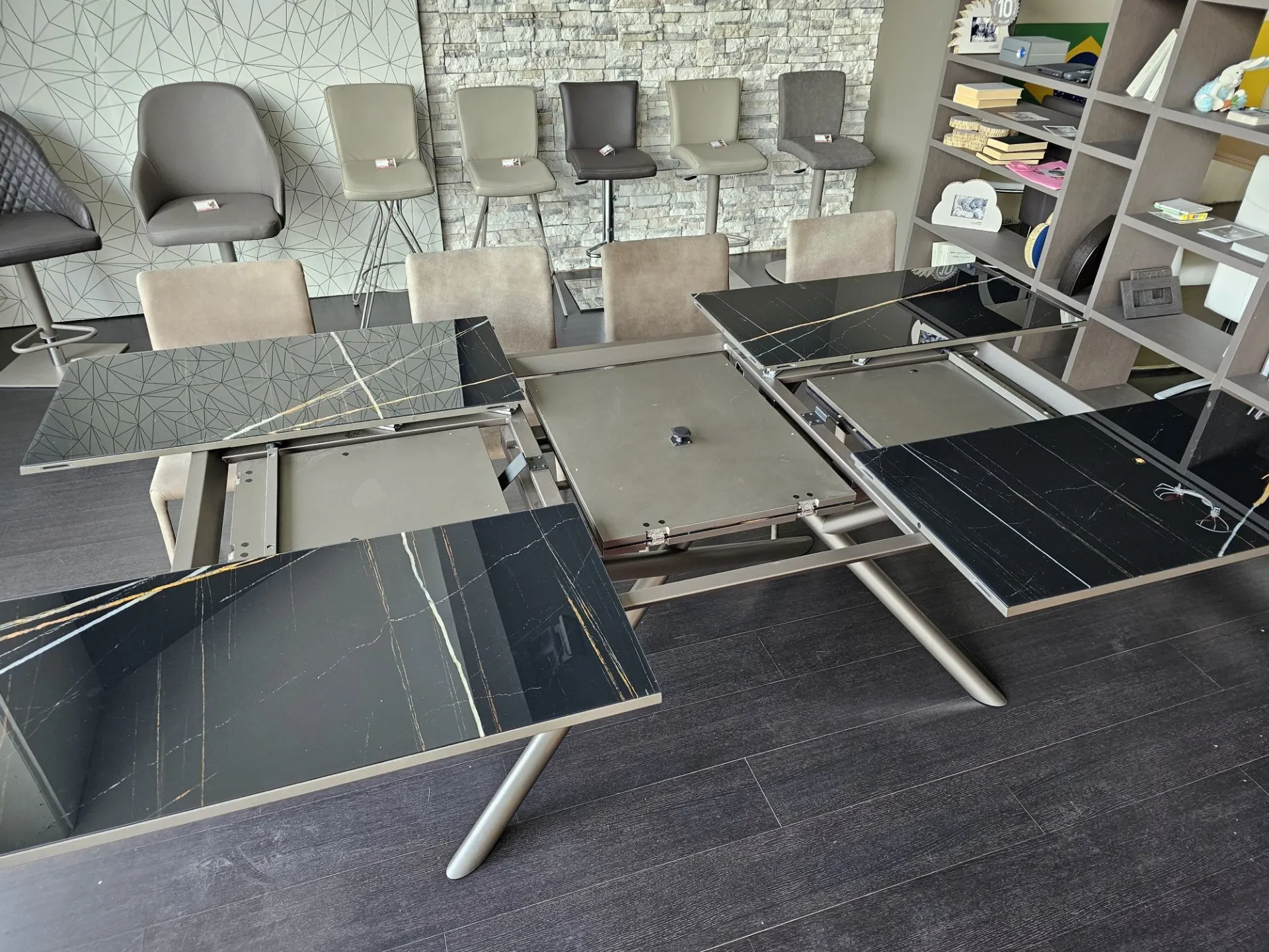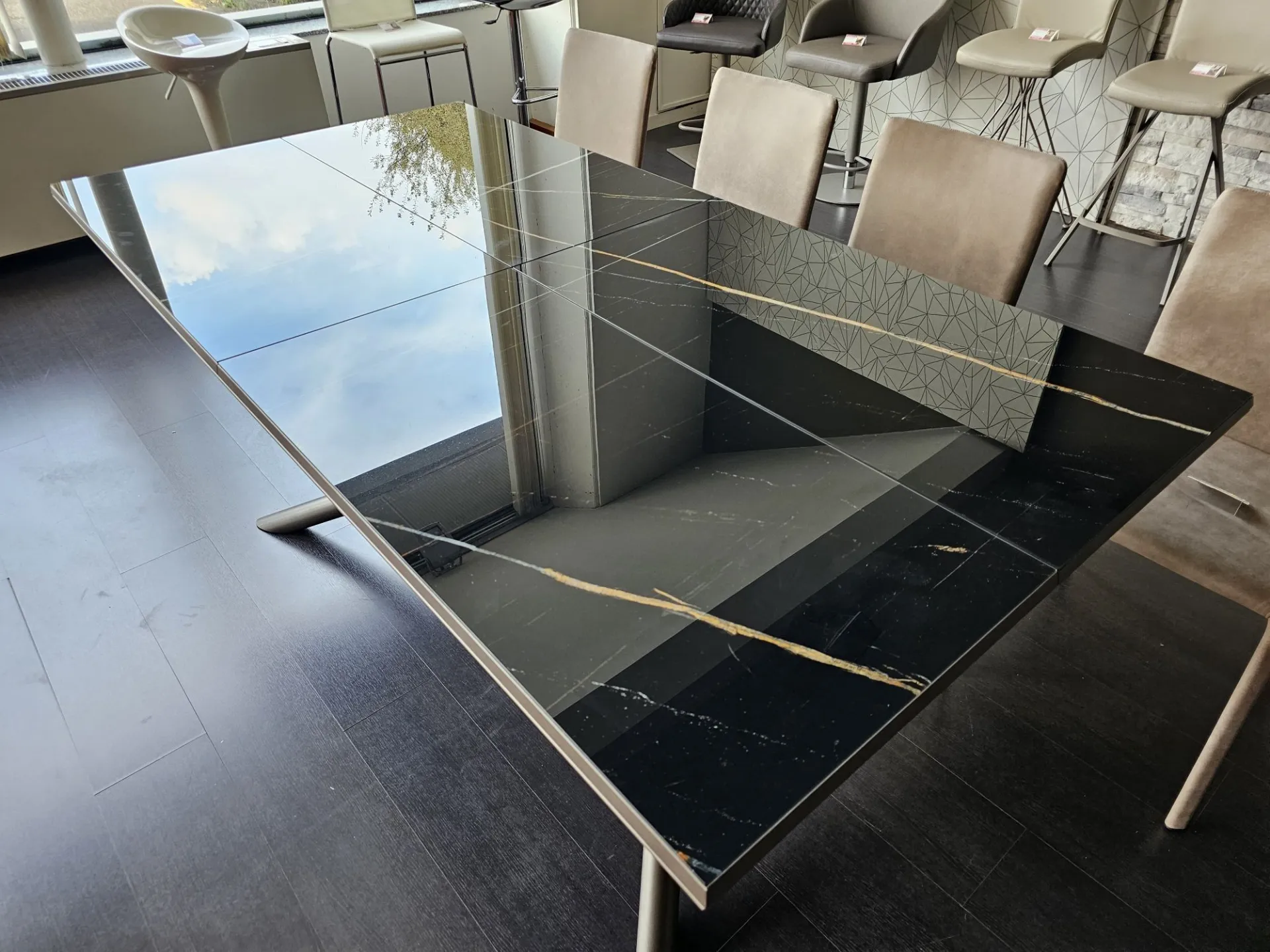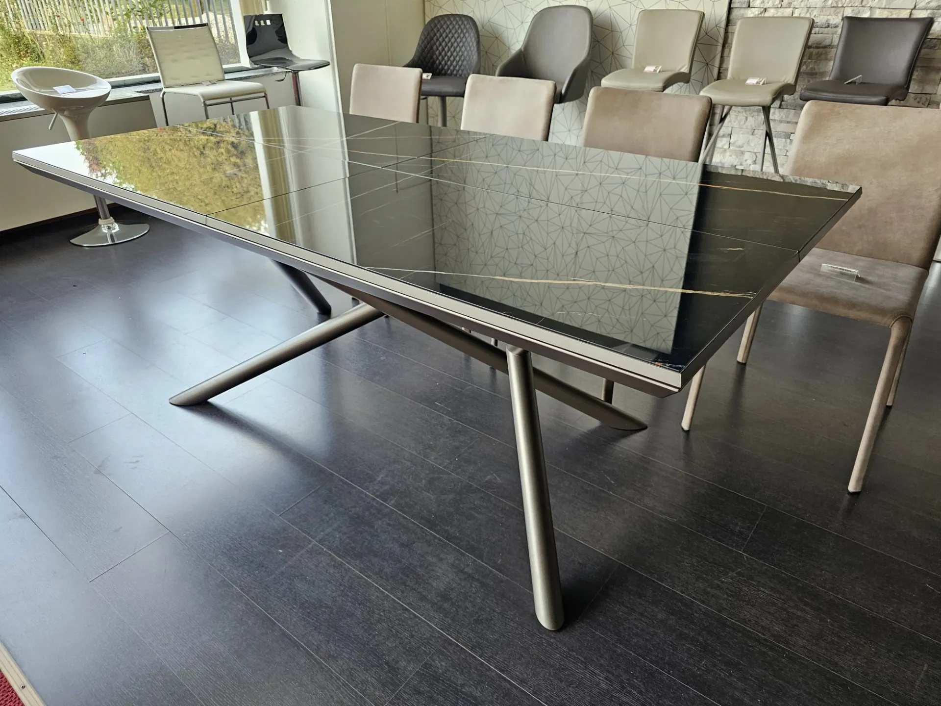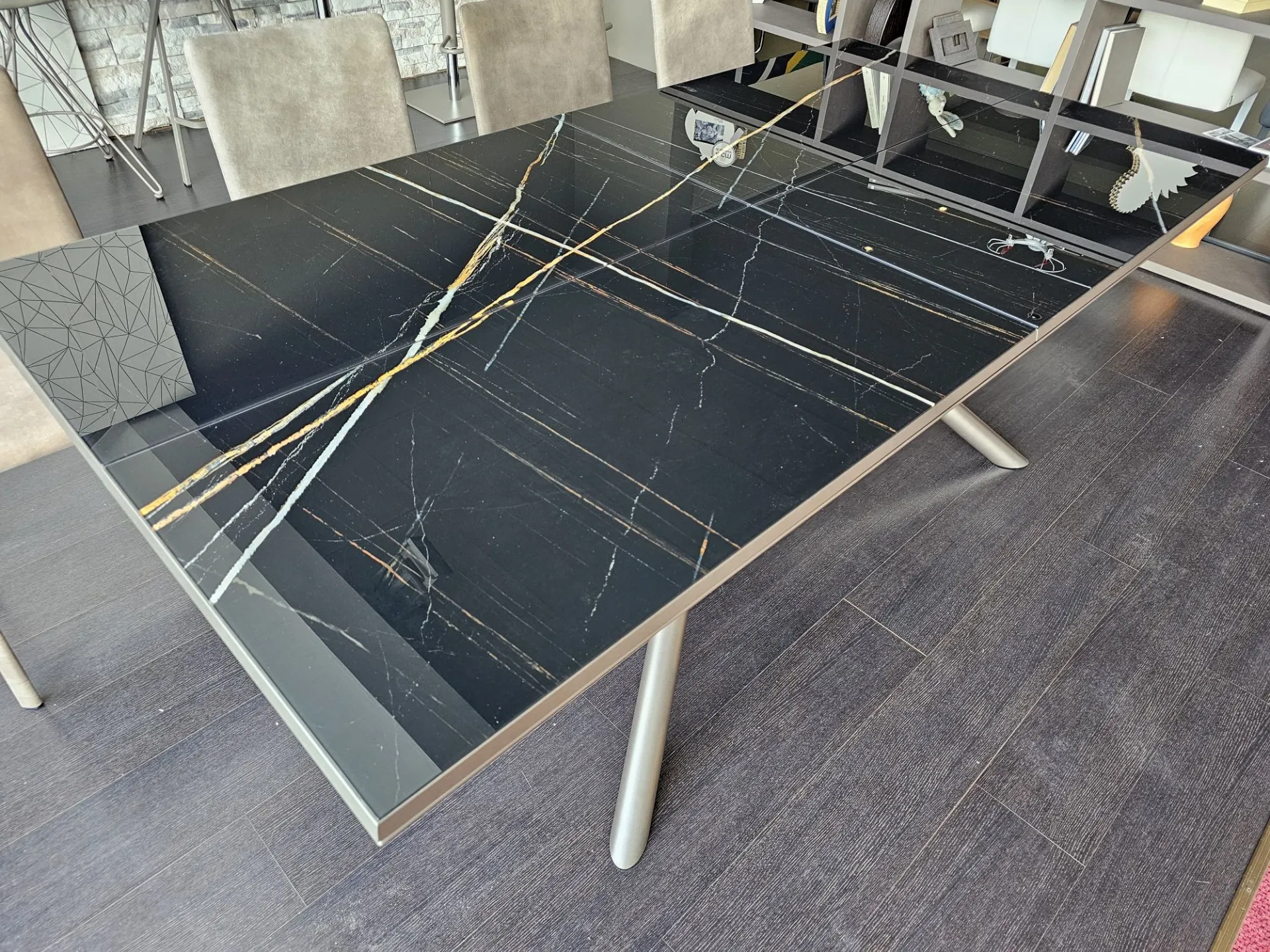 Extendable RANDOM table with Marble Glass top in glossy MG02 Sahara noir finish and matte bronze metal base MT97. The table can comfortably seat 12 people. Measures cm. 100(138)x200(254) Product on display. Contact us for more information.