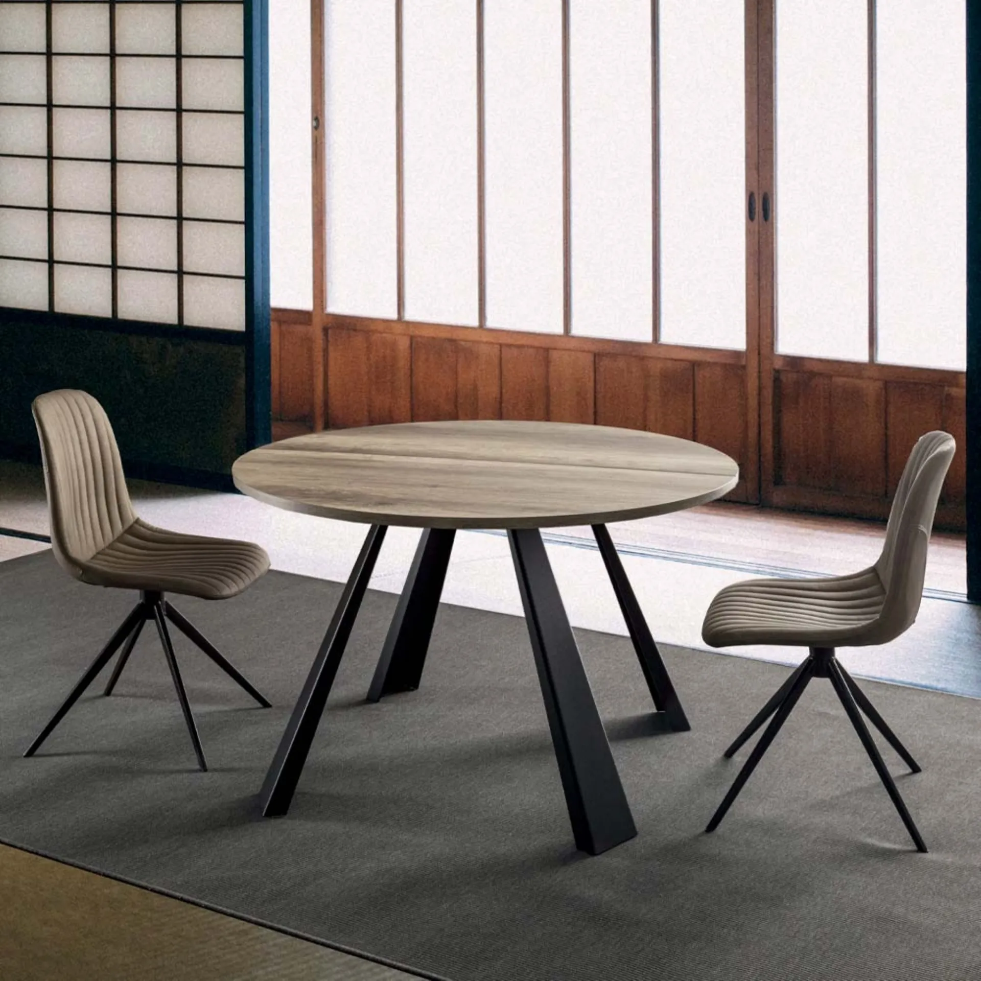 Scopri il tavolo allungabile Saturn-INO Art. 610/1 di La Seggiola, un'eccellenza del design e della produzione italiana. Questo modello, dal design rotondo e funzionale, si distingue per la sua solida struttura in metallo verniciato nero, abbinata a un elegante piano in nobilitato da 25mm. Le finiture disponibili, tra cui rovere nodato, cemento, antracite e pietra grey, offrono ampia scelta per ogni stile. La sua innovativa funzionalità si esprime attraverso due allunghe indipendenti da 50cm, che trasformano il diametro base di 120cm in un tavolo spazioso da 170cm o 220cm, con un'altezza costante di 76cm. Le allunghe sono progettate per essere riposte separatamente, ottimizzando gli spazi. Questo prodotto rappresenta una soluzione versatile per ambienti moderni, combinando estetica raffinata e praticità d'uso avanzata.