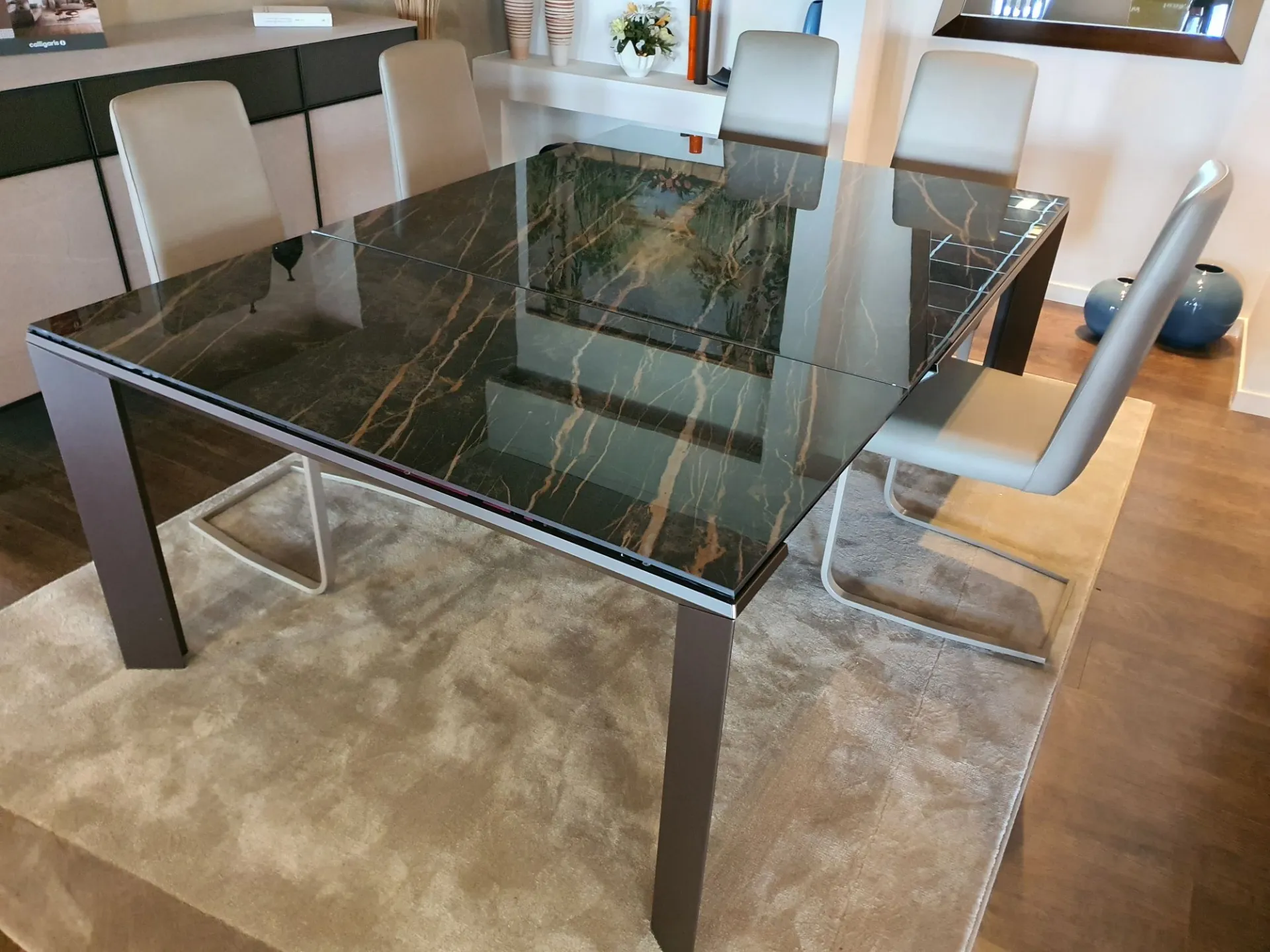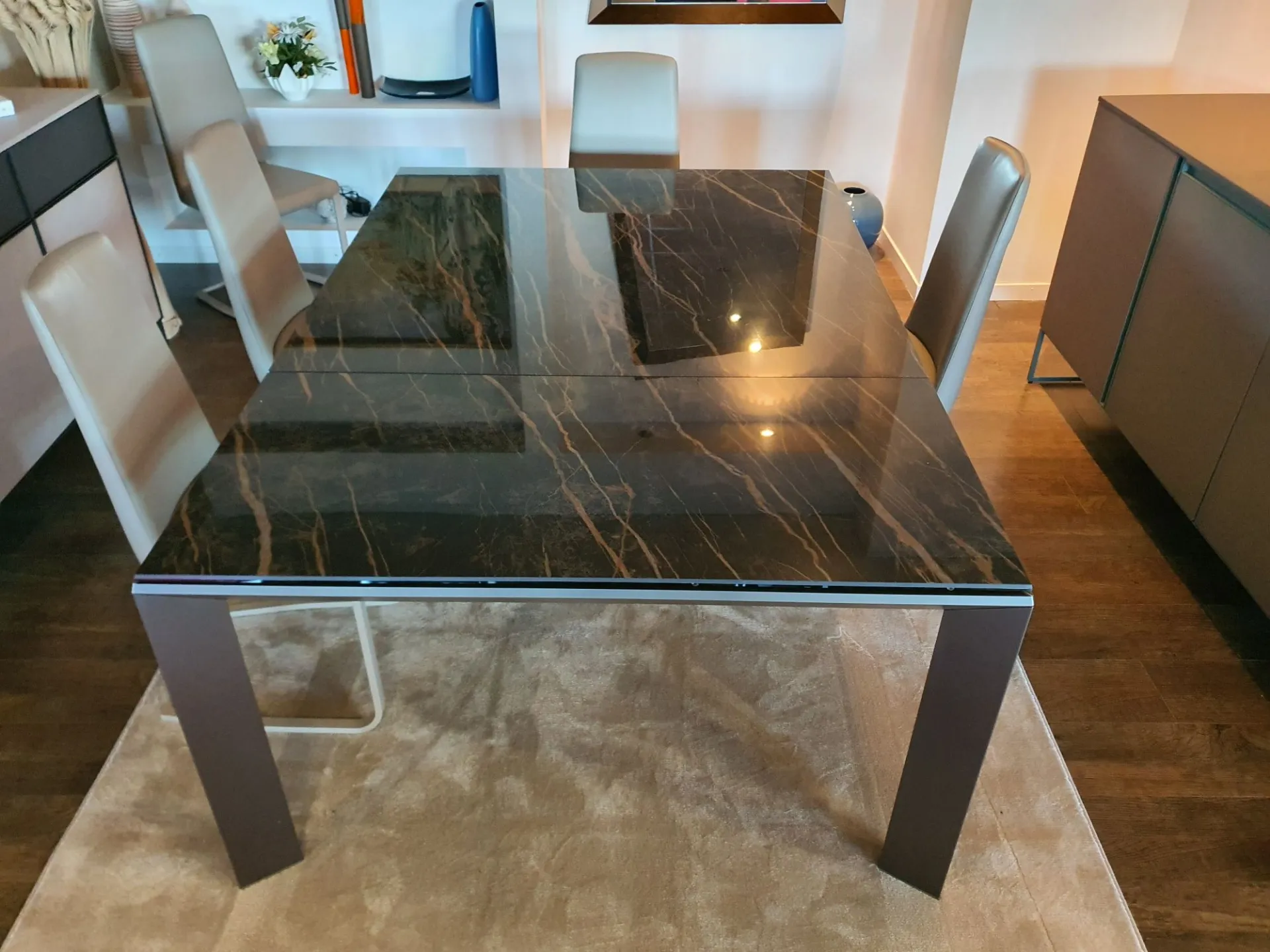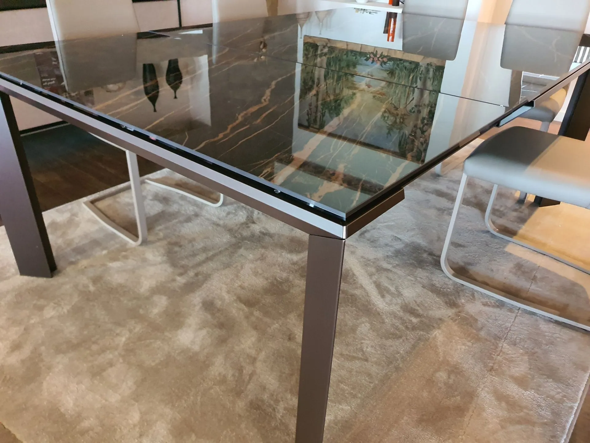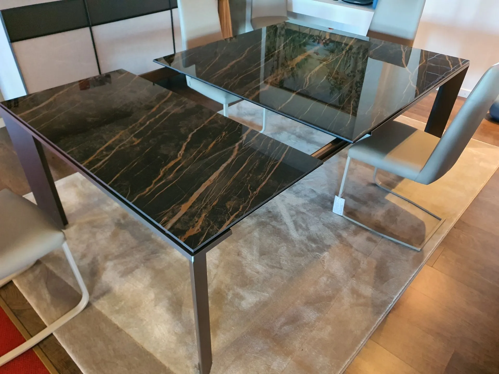 Extendable table model Metrò in extruded aluminum with glossy ceramic top in emperador and metal legs in bronze color