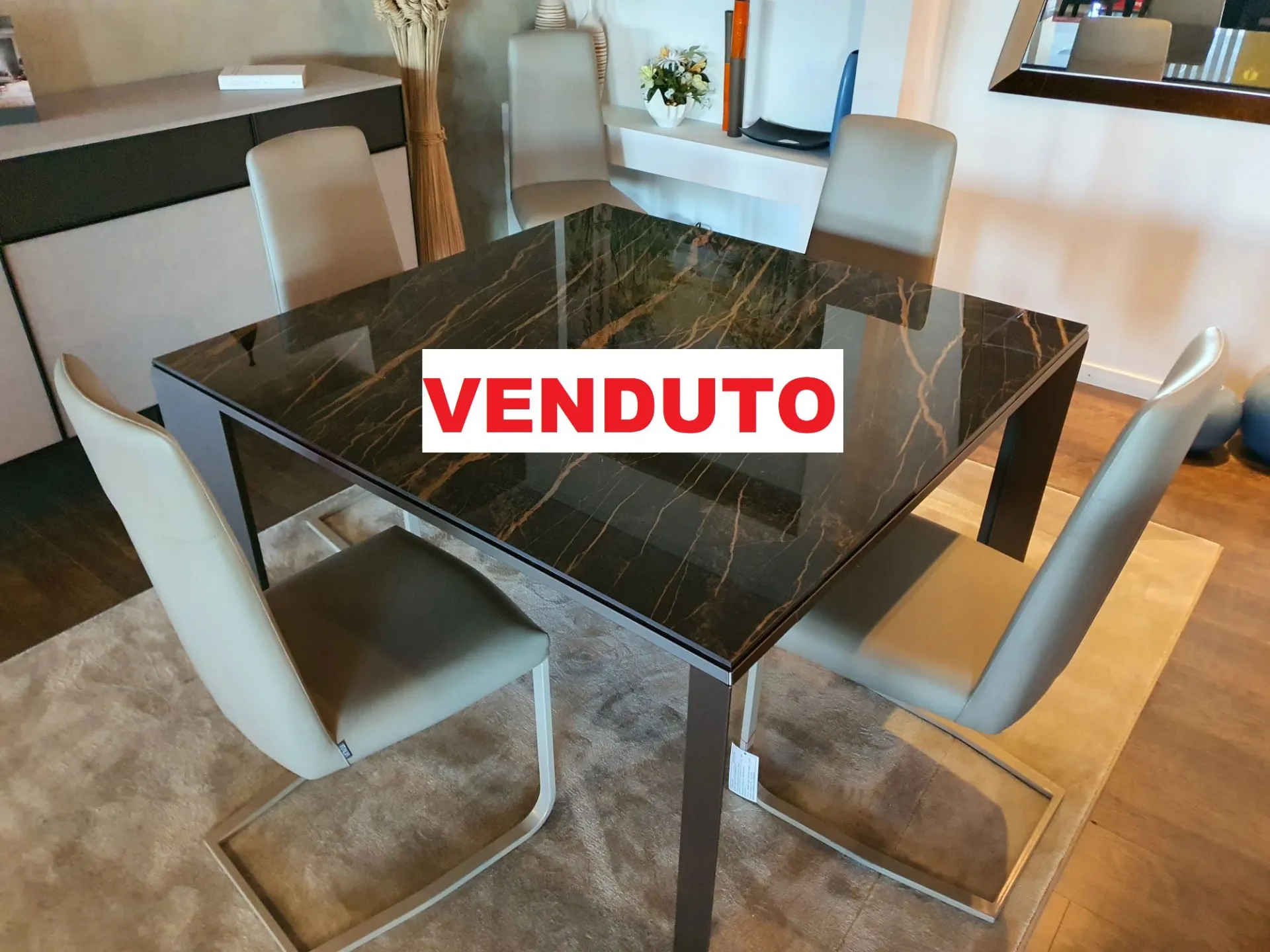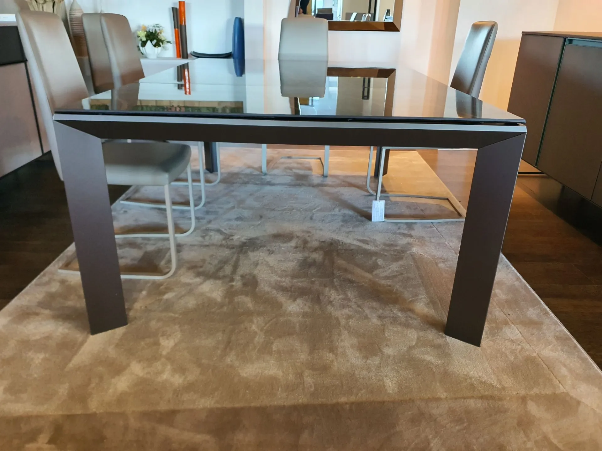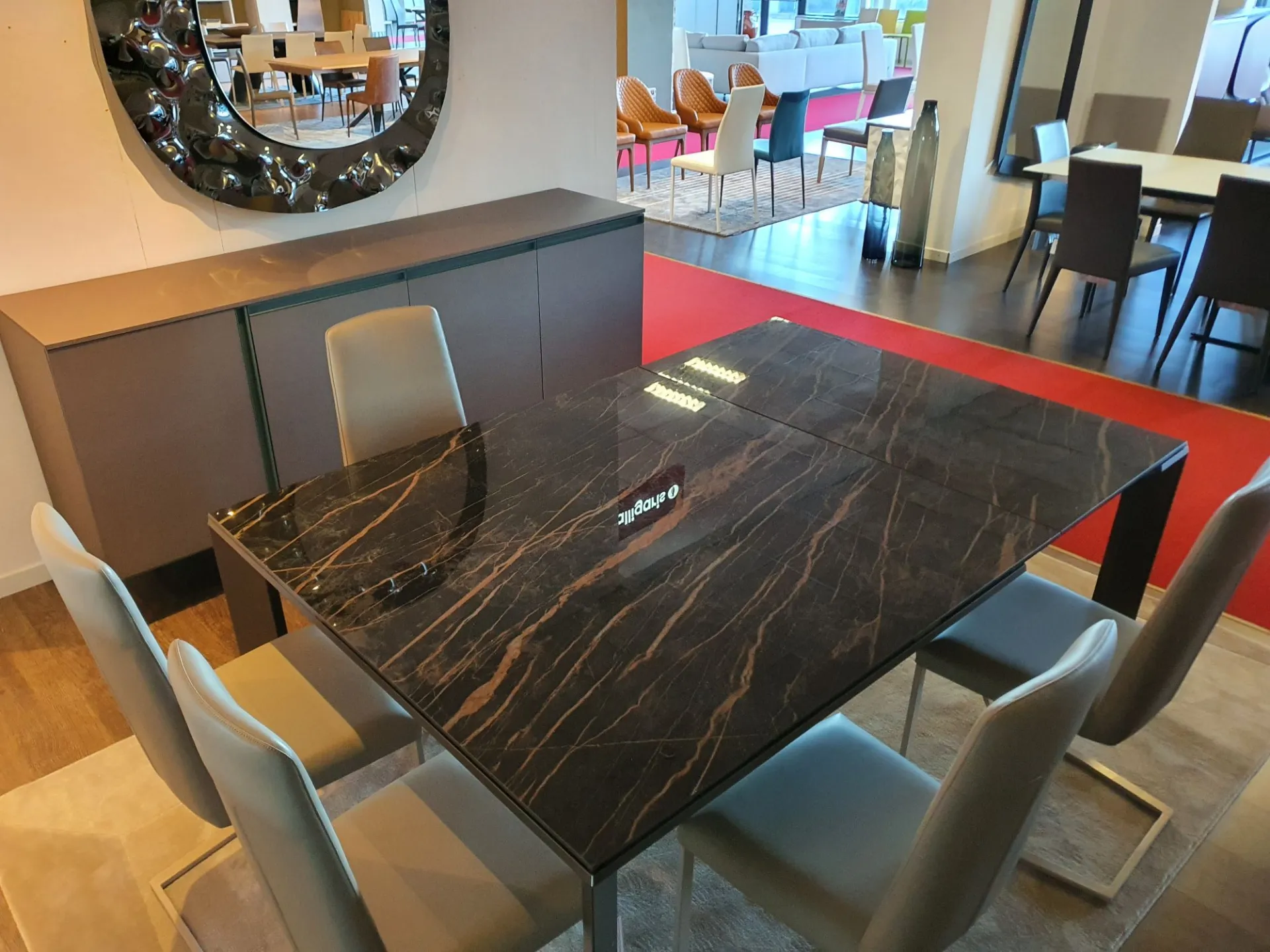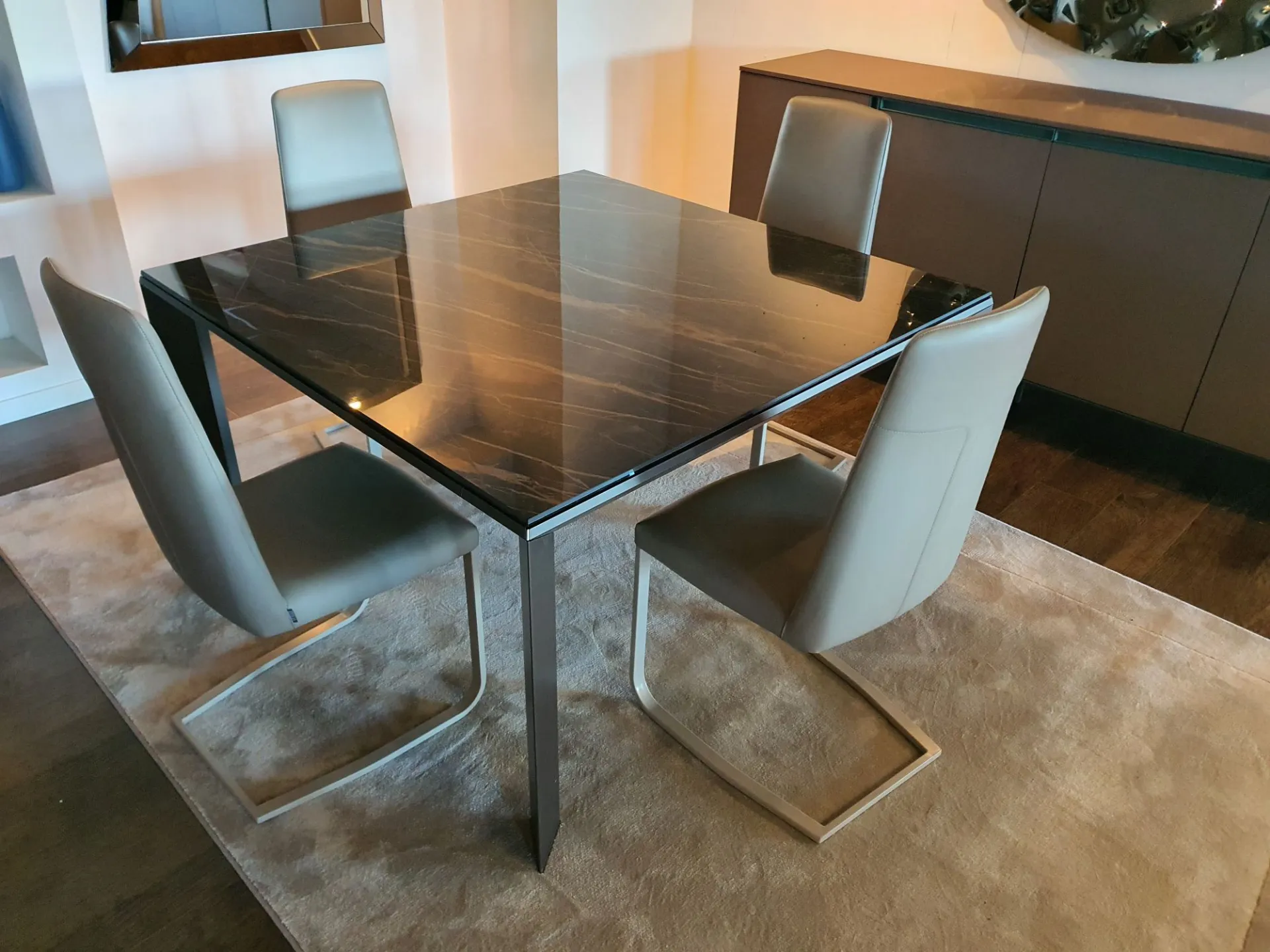 Extendable table model Metrò in extruded aluminum with glossy ceramic top in emperador and metal legs in bronze color