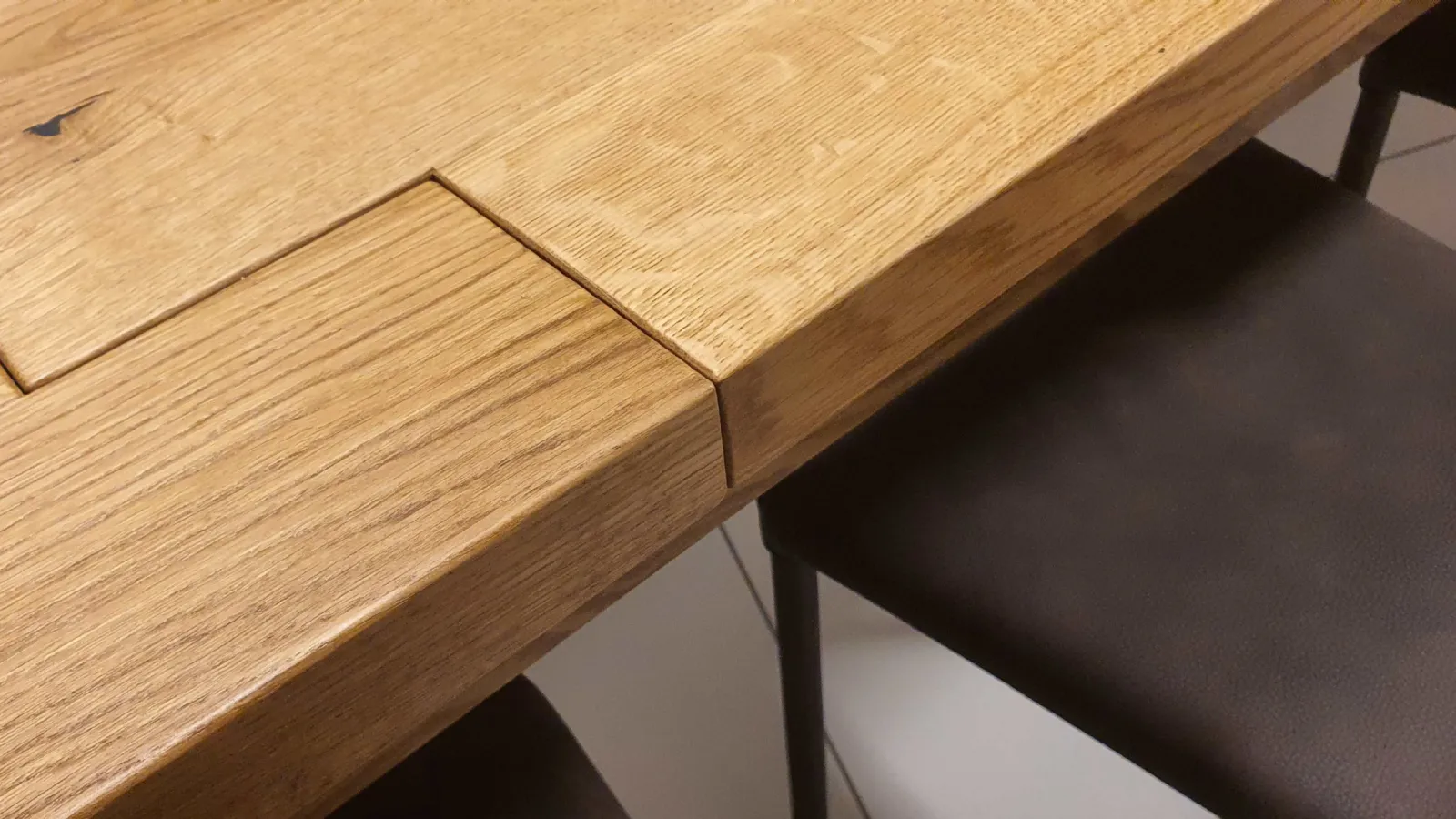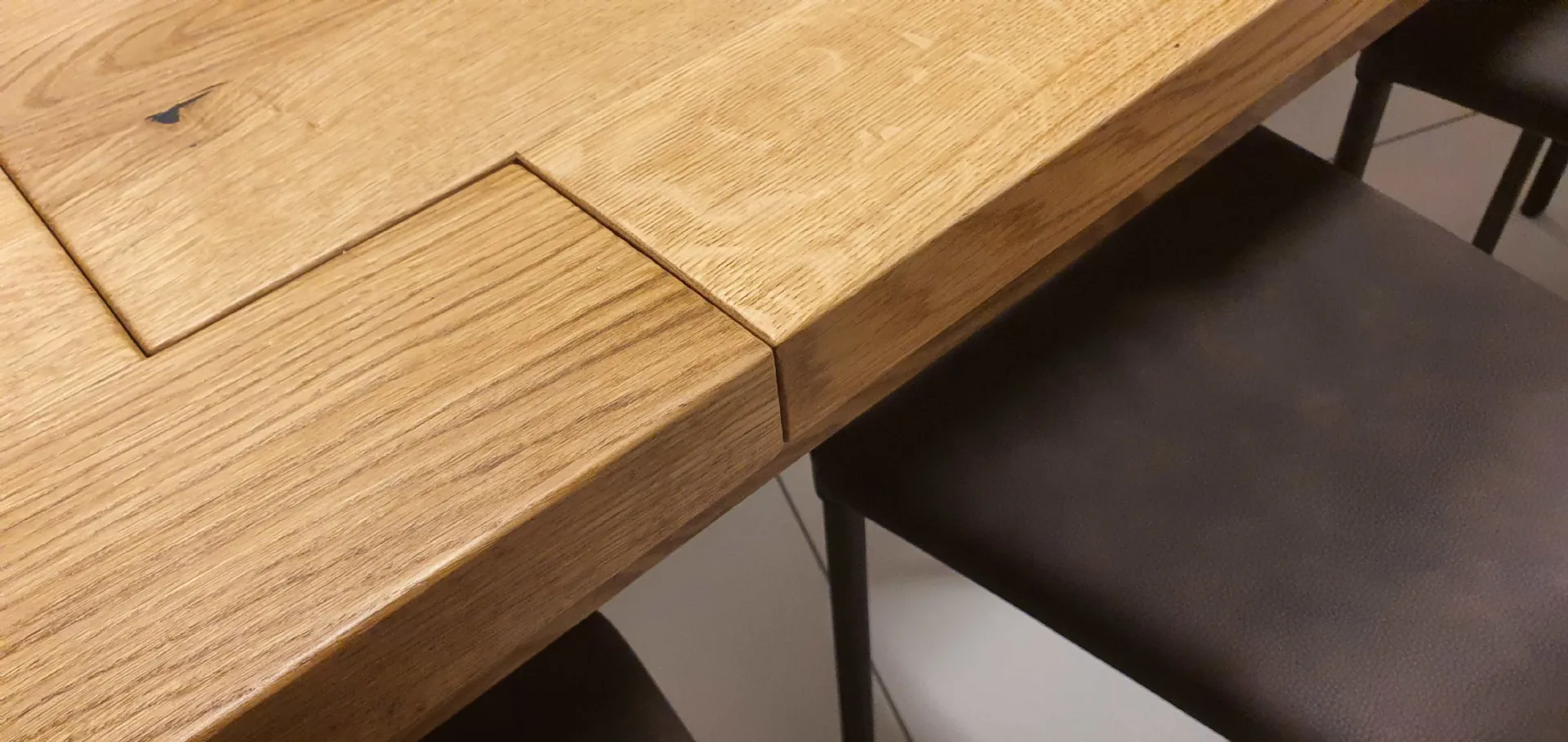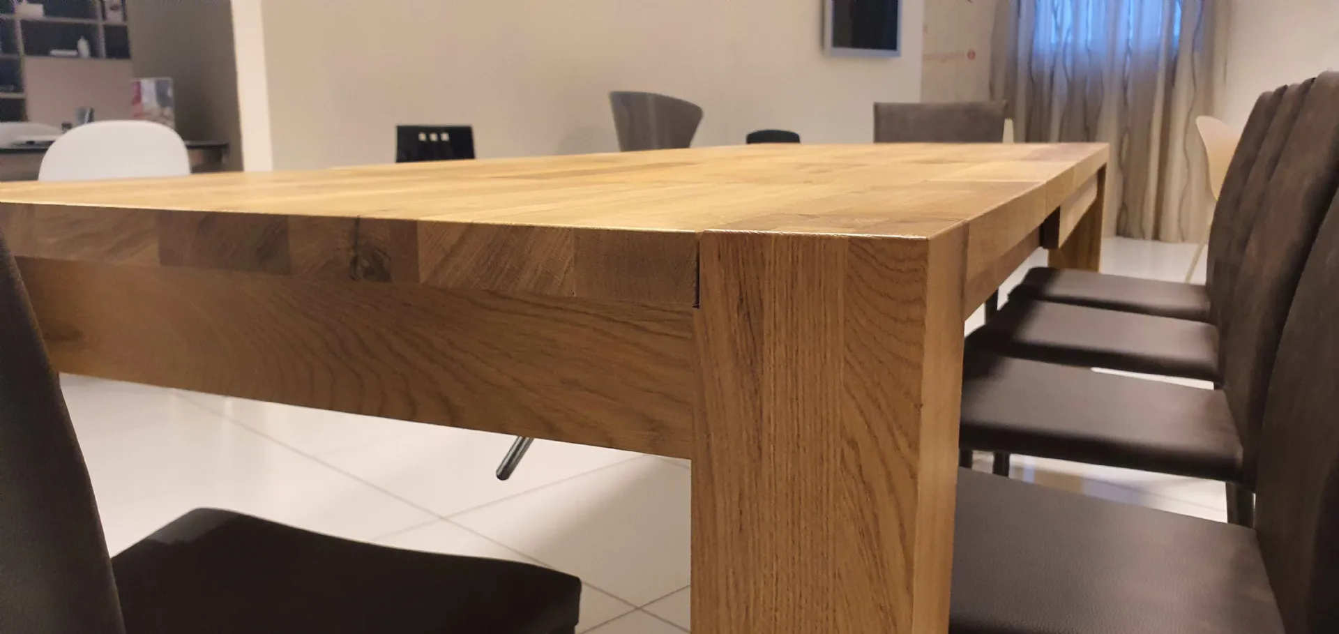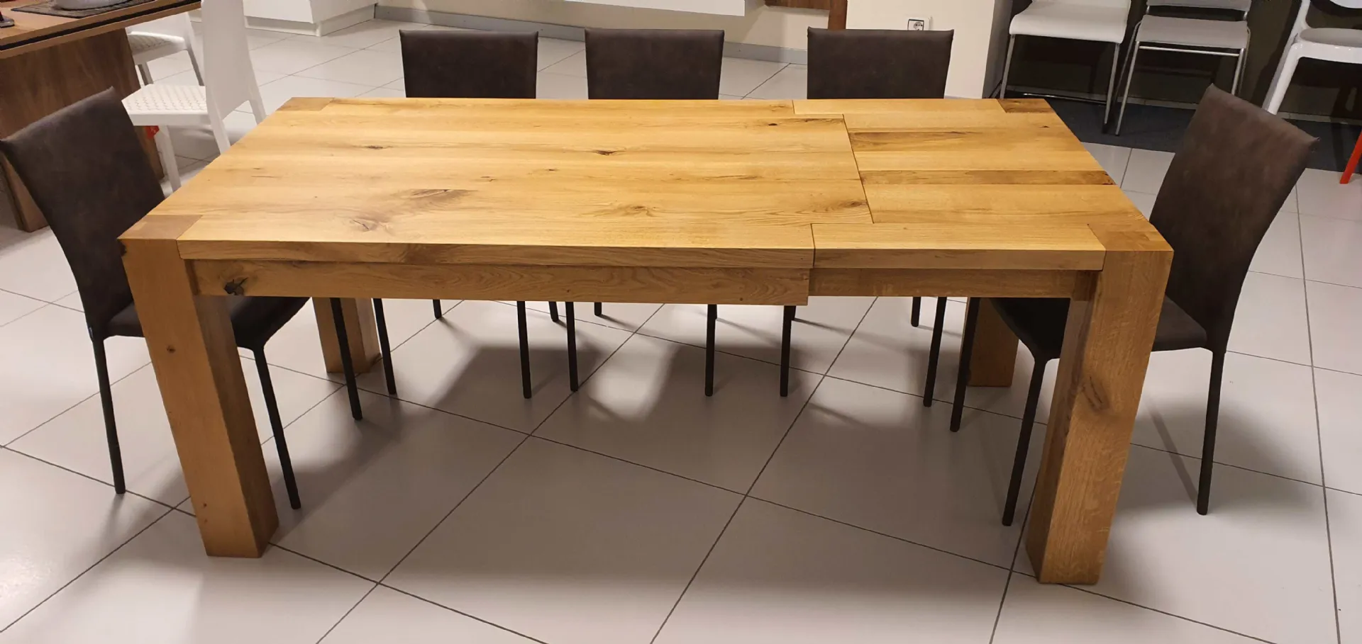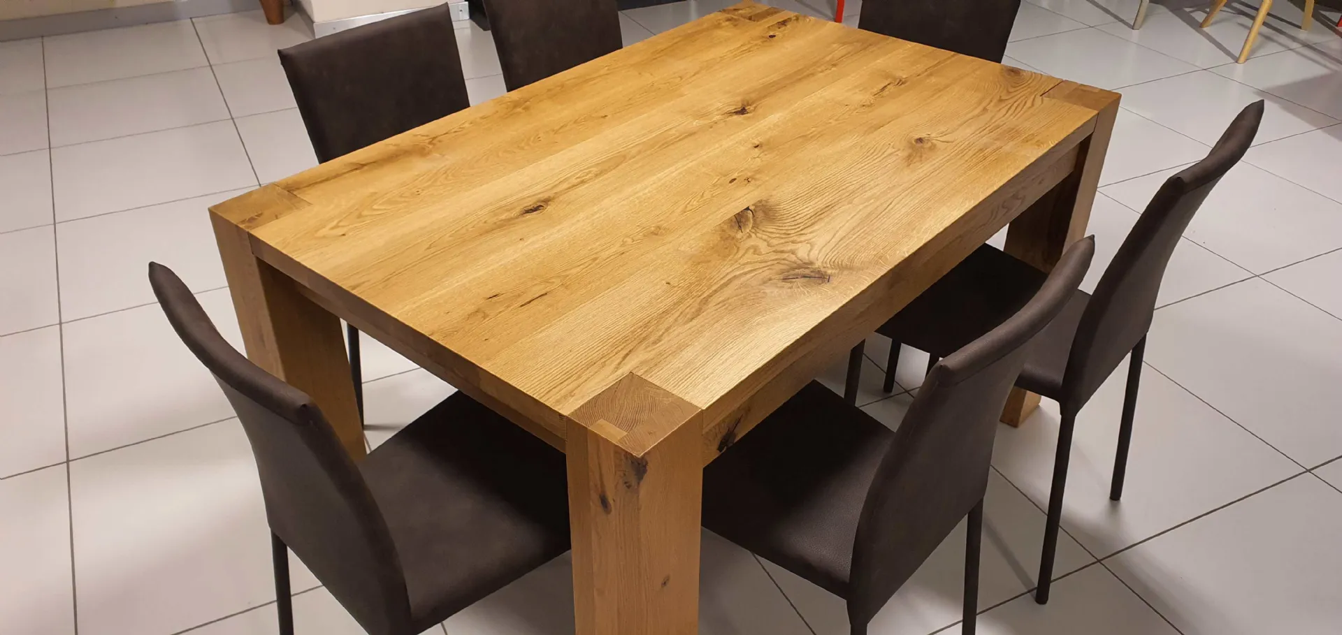 E’ a table entirely in solid Oak 100 # 37 in Oil finish that gives warmth and shine to real wood. The top has a thickness of 4 cm with the four perimeter legs that have a square section of cm. 12x12, are flush with the top and allow you to take full advantage of the available seat.