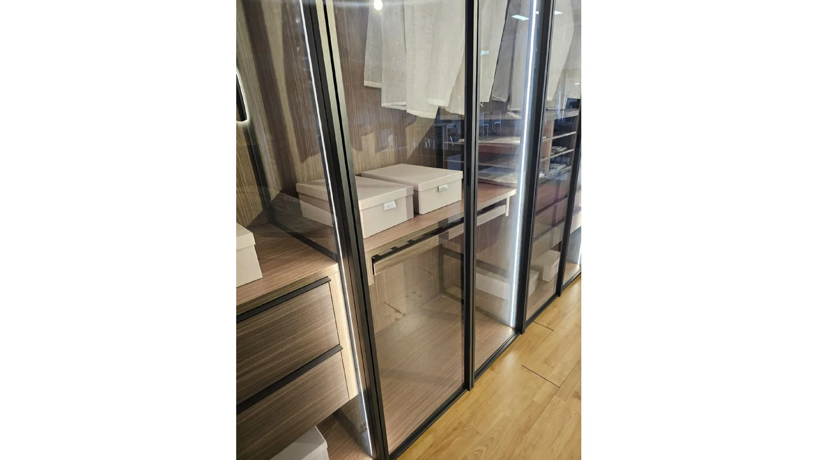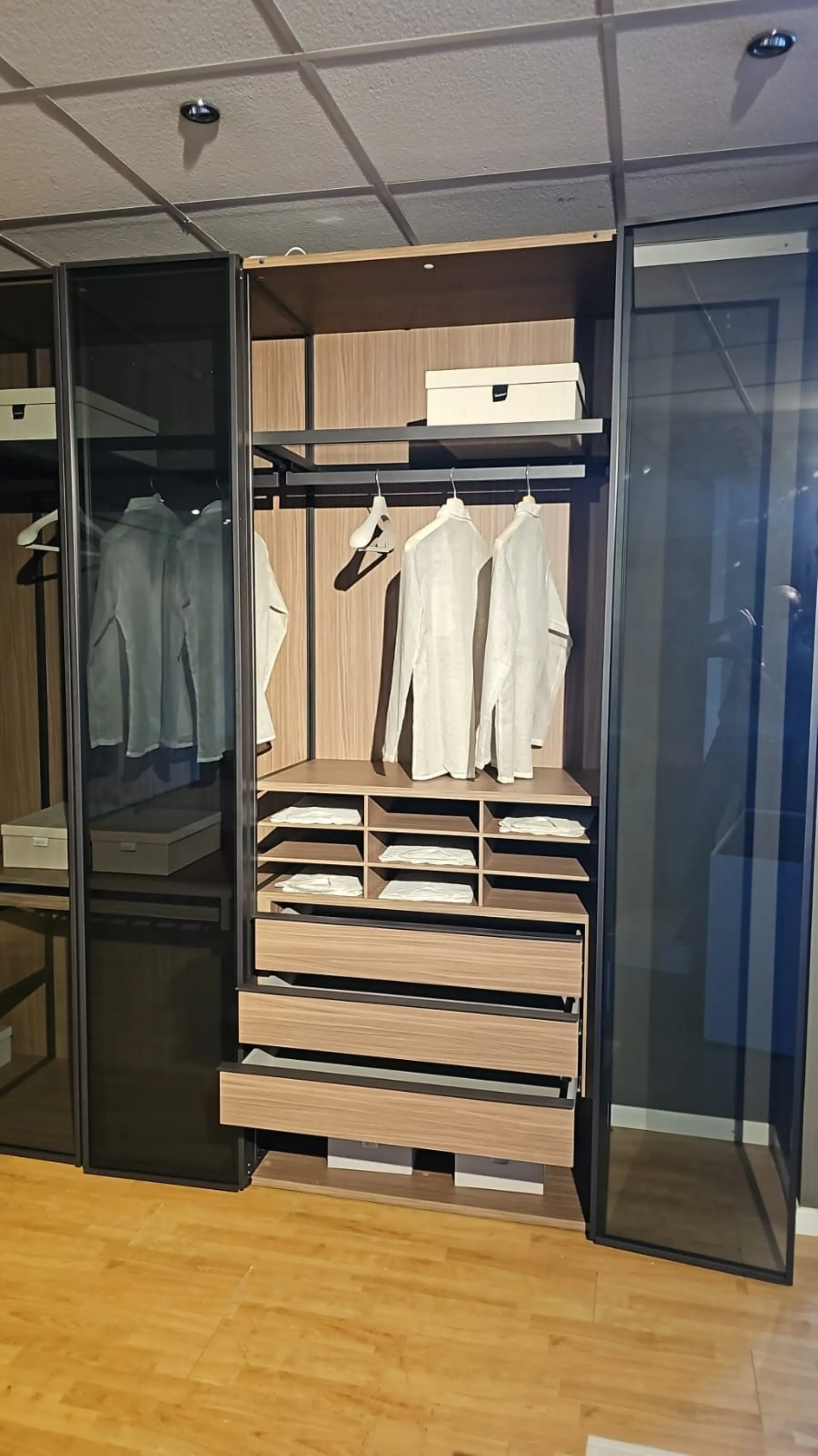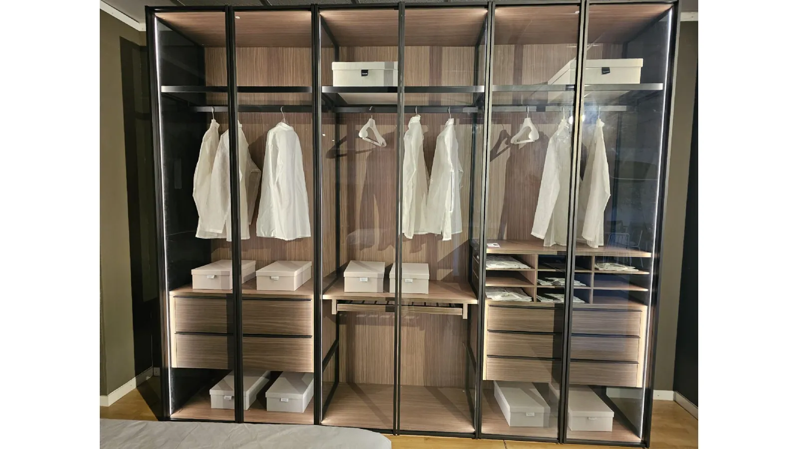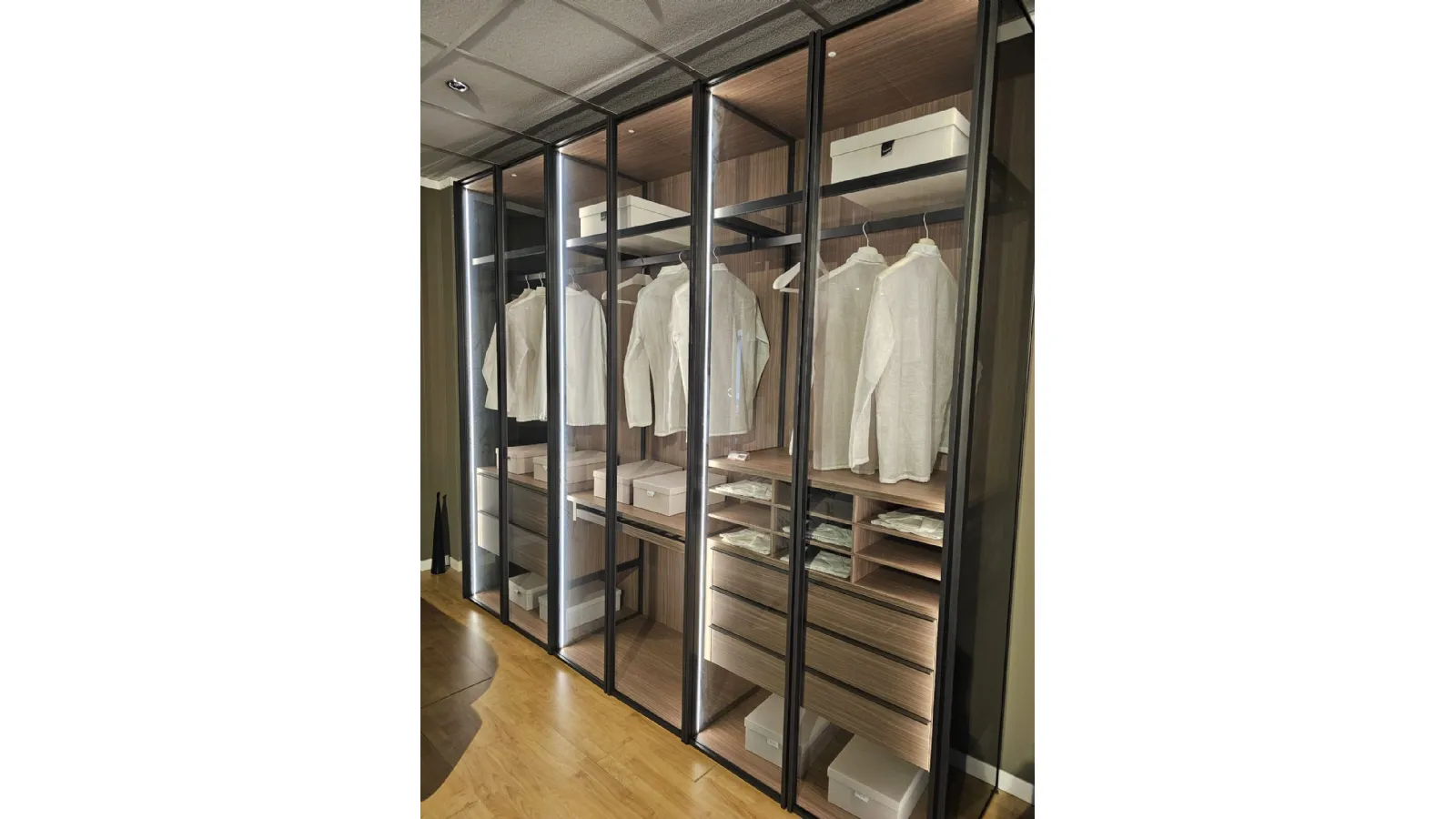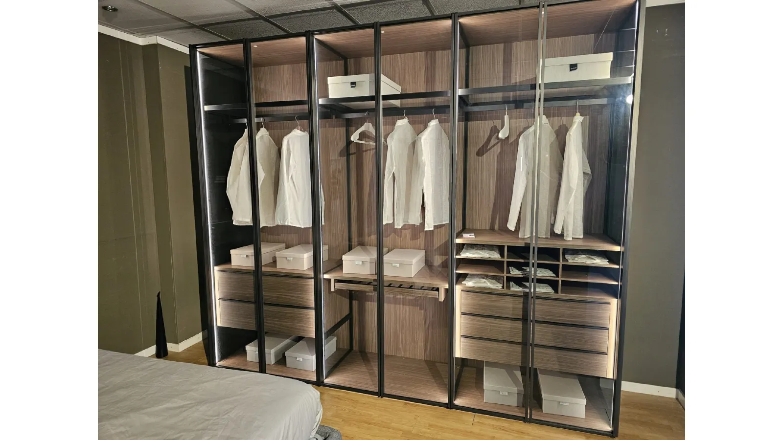 ADOK swing door wardrobe model Crystal, interiors in caramel finish, doors with profile in cast metal finish and smoked transparent glass, complete with lights with sensor, dimensions 304x257.5x61 cm.