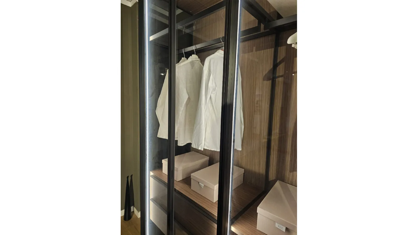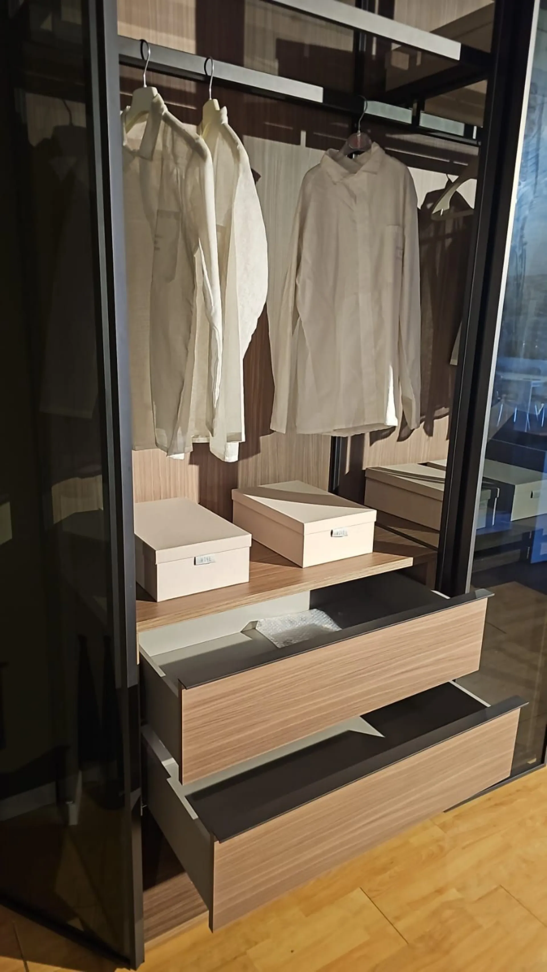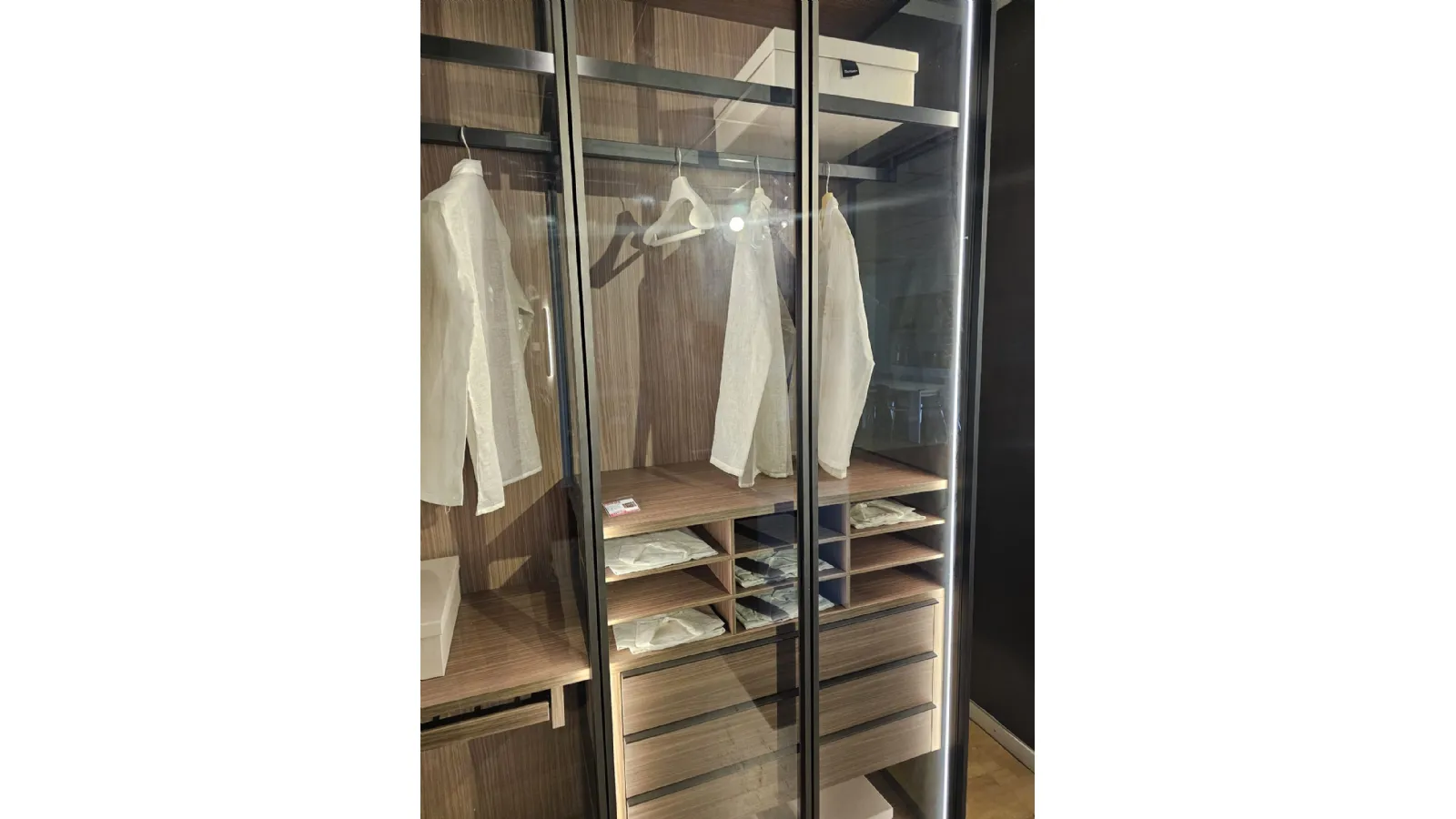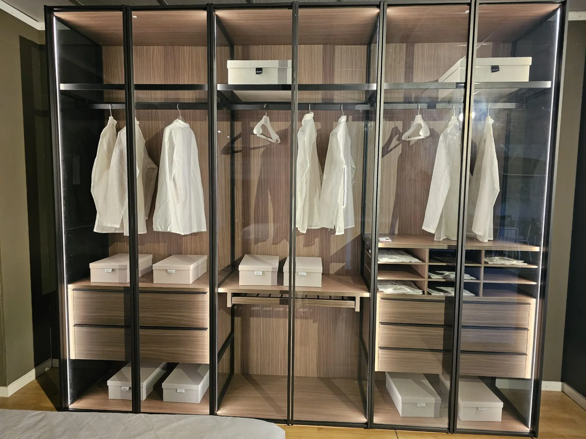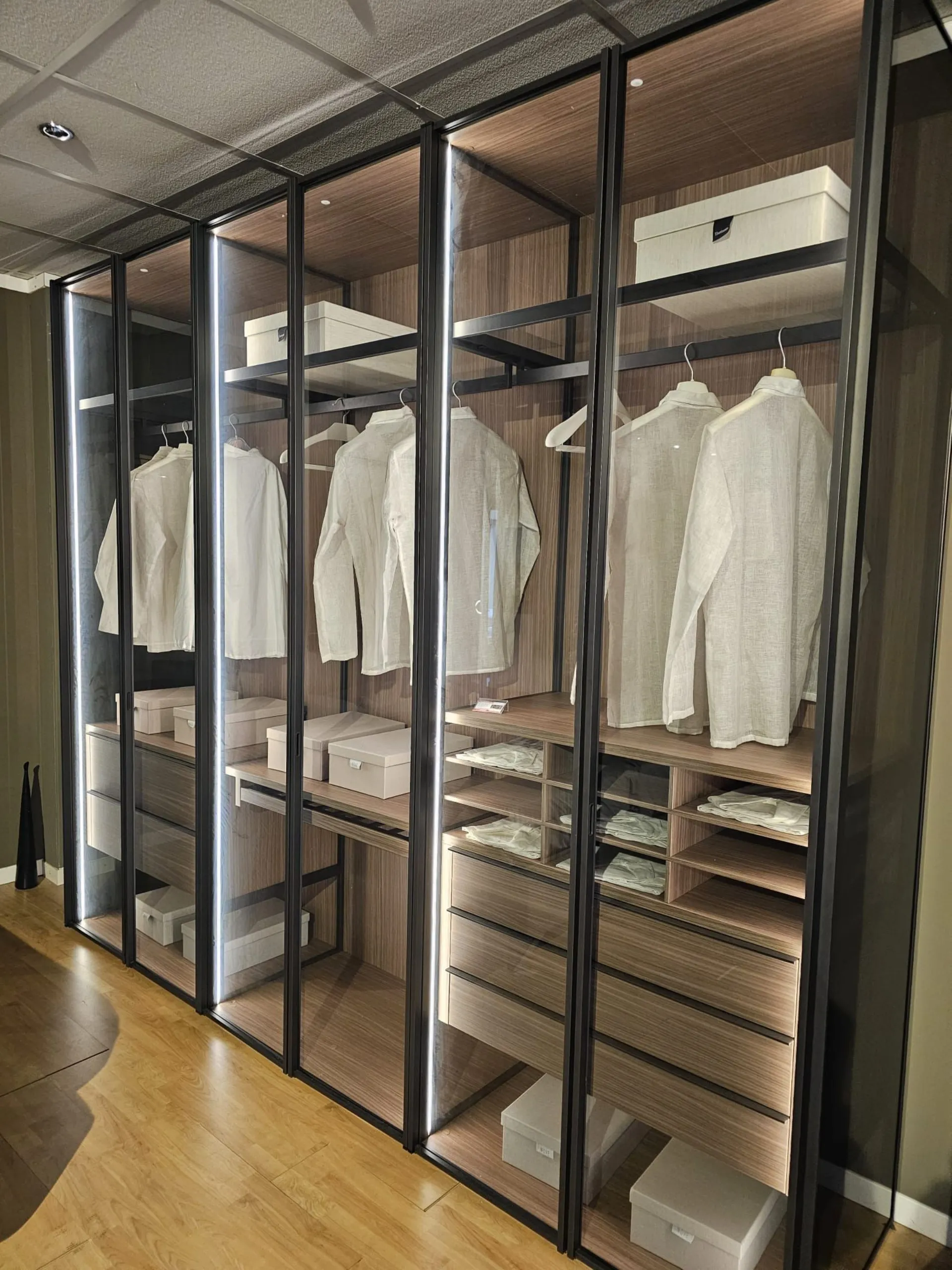 ADOK swing door wardrobe model Crystal, interiors in caramel finish, doors with profile in cast metal finish and smoked transparent glass, complete with lights with sensor, dimensions 304x257.5x61 cm.
