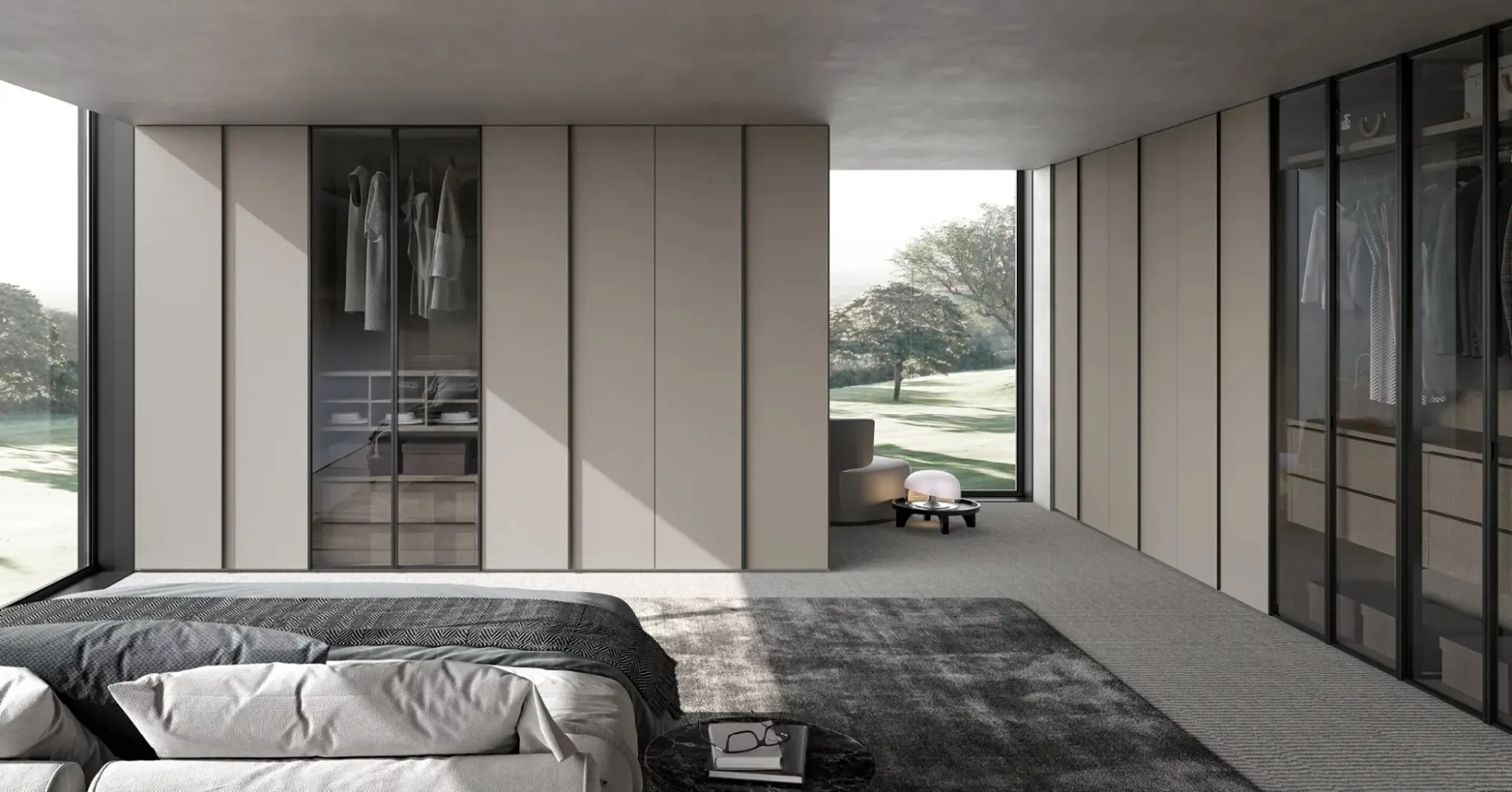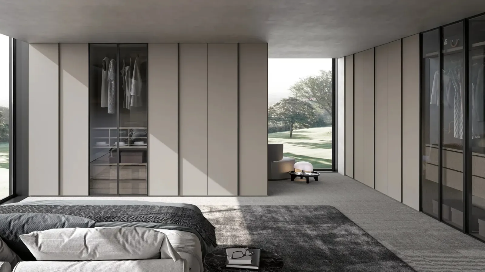 | Materiale: | Ante Crystal: vetro fumé, telaio in alluminio finitura Ghisa Metal, Ante Ruler: legno laccato finitura Titanio, Fianchi: finitura Canvas, Interno armadio: finitura Canvas, Maniglie: finitura Ghisa Metal |
