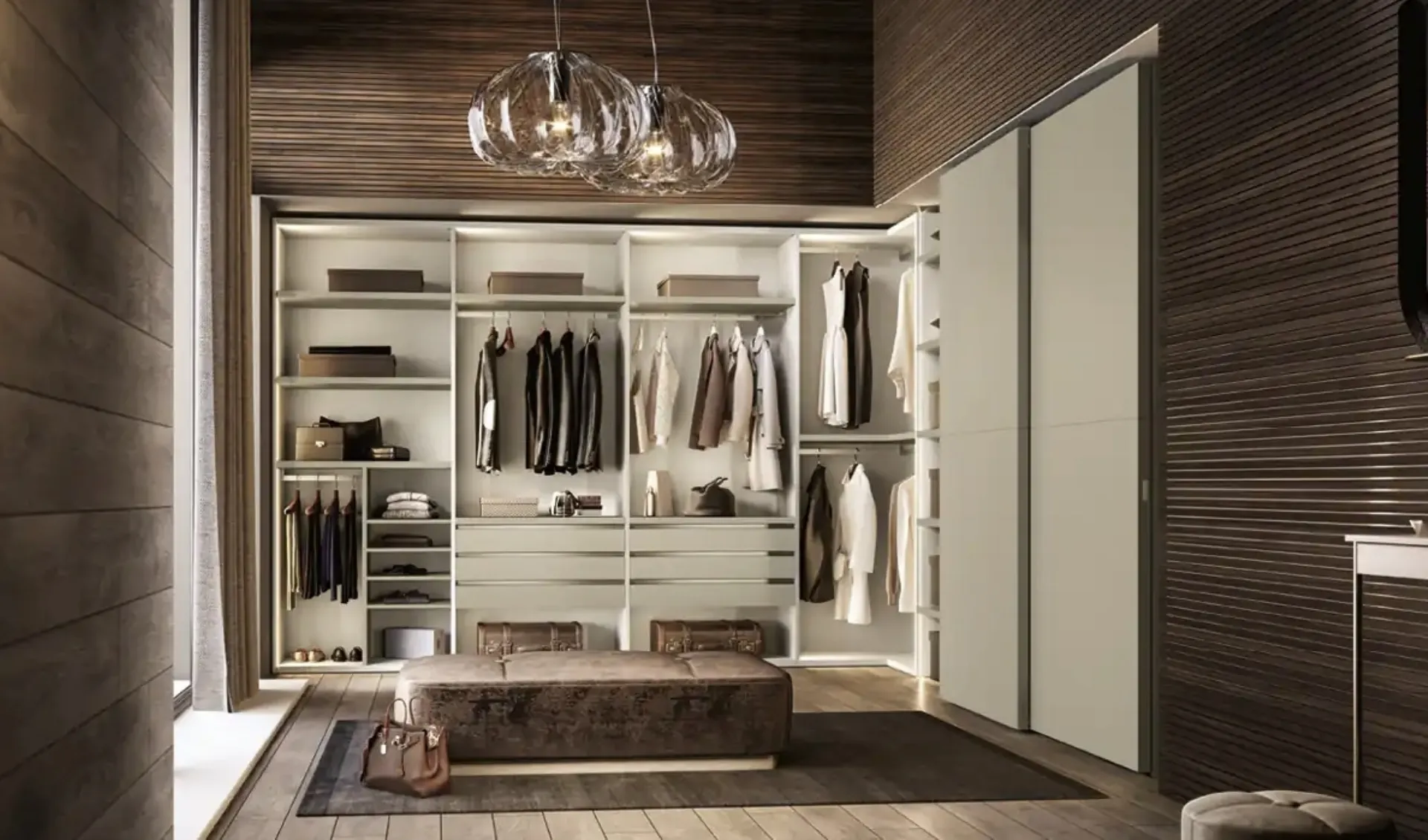 The Moretti Compact Giorno Notte walk-in wardrobes with sliding doors await you: discover the Tauru