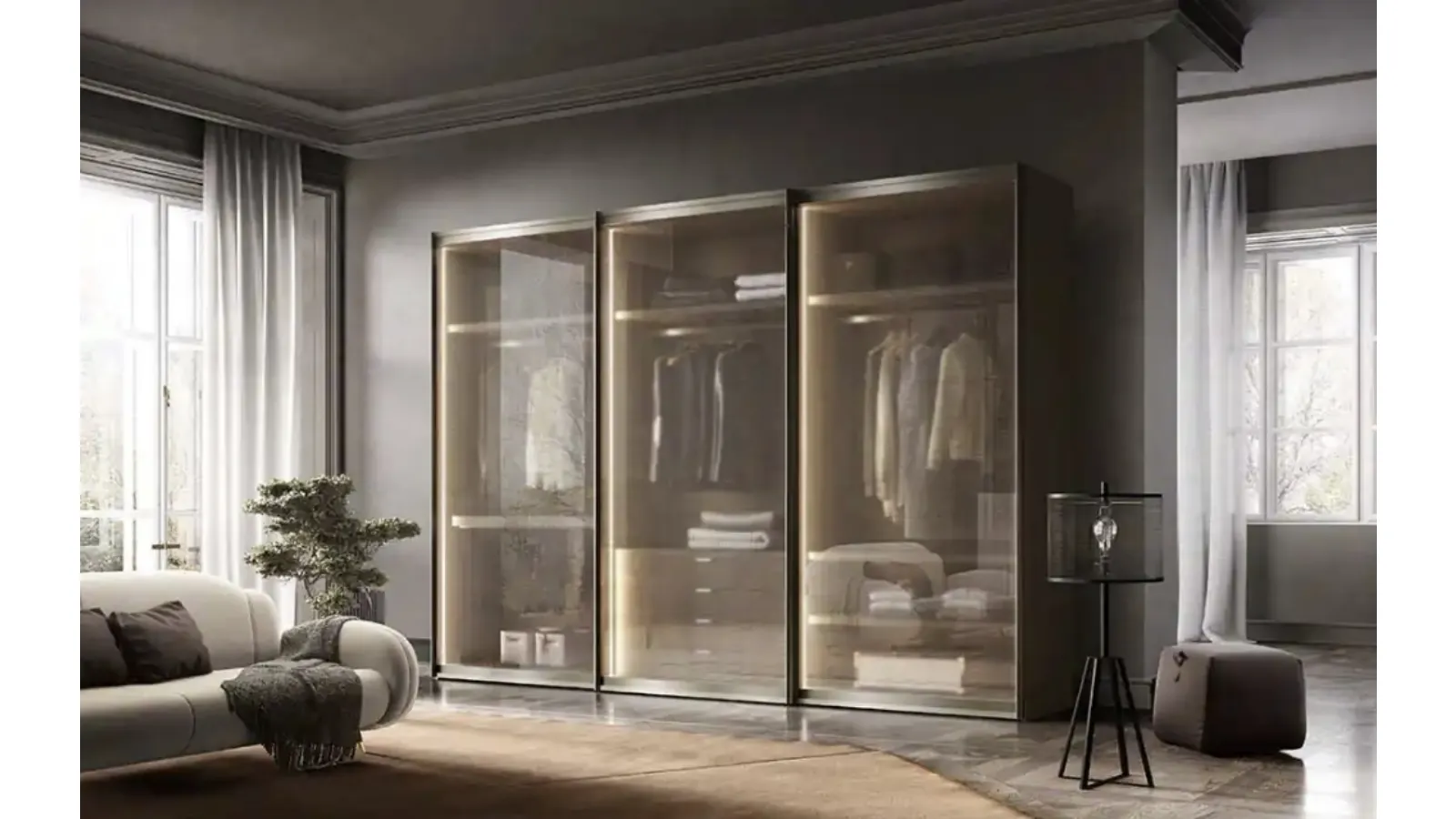 To design a beautiful and high-quality room to the best, prefer the most original solutions from the best brands, beds, wardrobes, and dressers of great design. Sliding door wardrobes are essential elements in the bedroom, to furnish it to the best, practical and complete. Contact us and get information about our Home Furnishing collection: you can complete the sleeping area by taking advantage of a diverse variety of designer storage units, such as the glass wardrobe in the photo. Foehn S186 Sliding Door Wardrobe by Moretti Compact Day Night: fill out the form to receive information of every kind and advice for designing the room you have always desired.