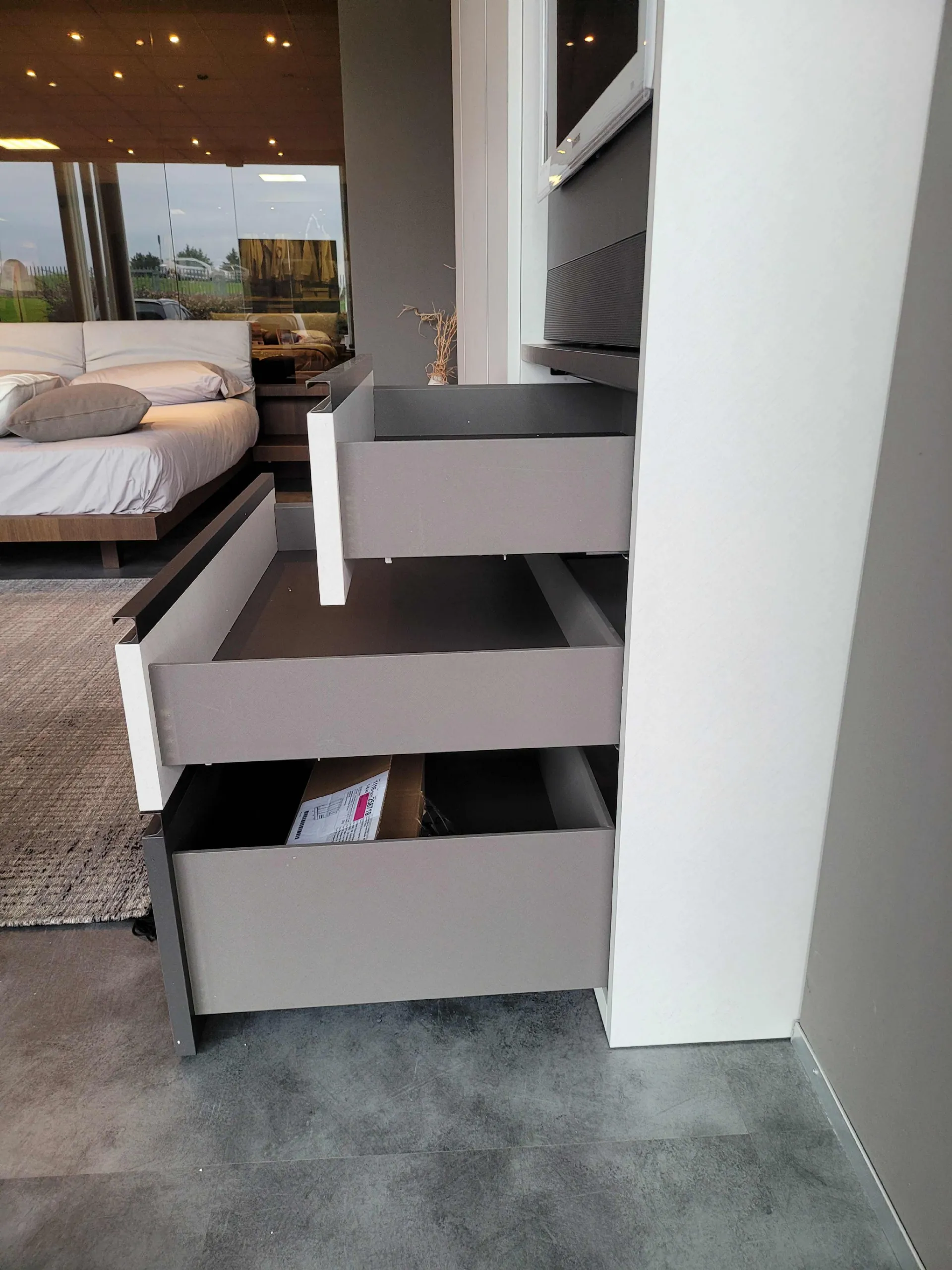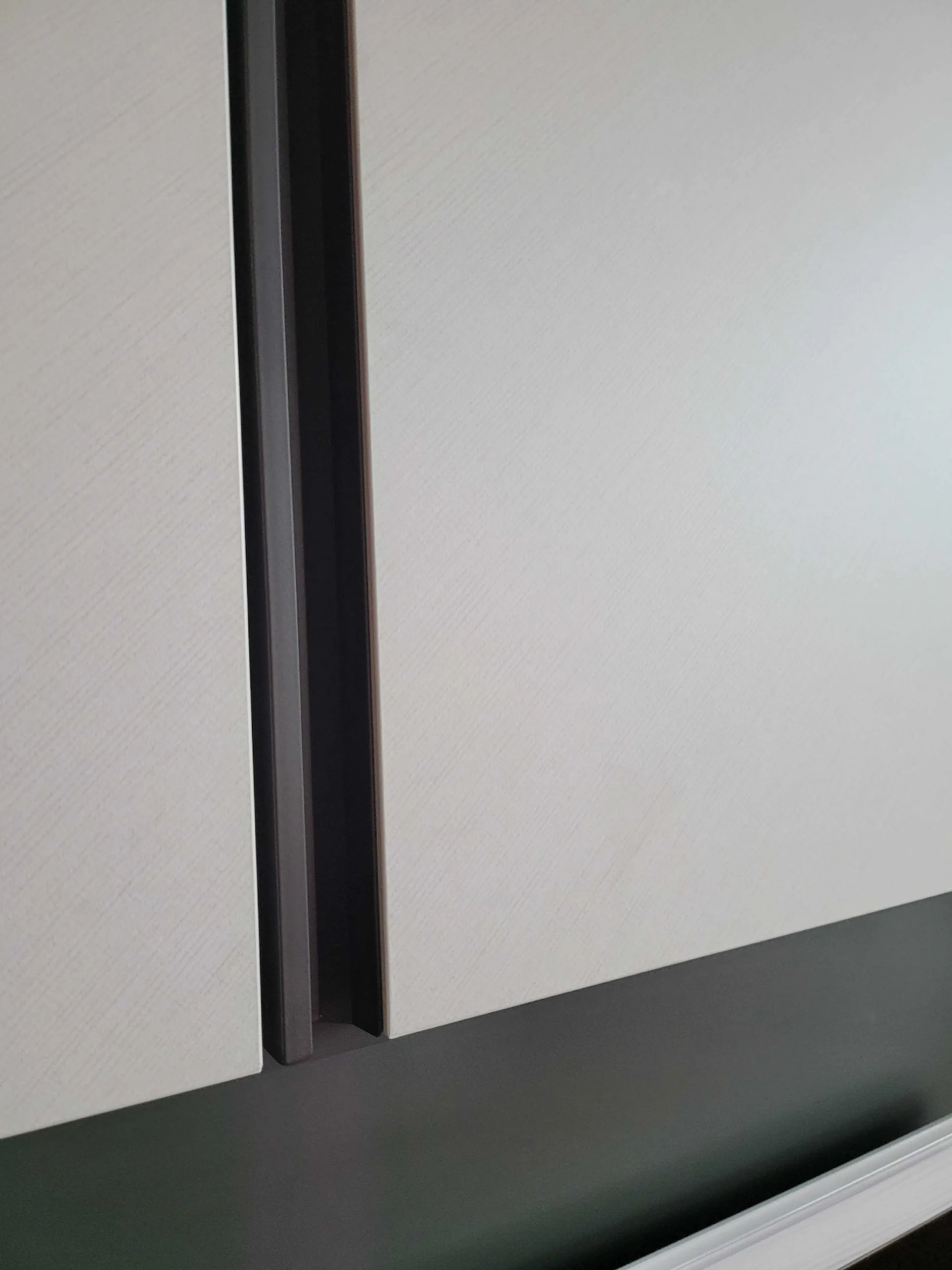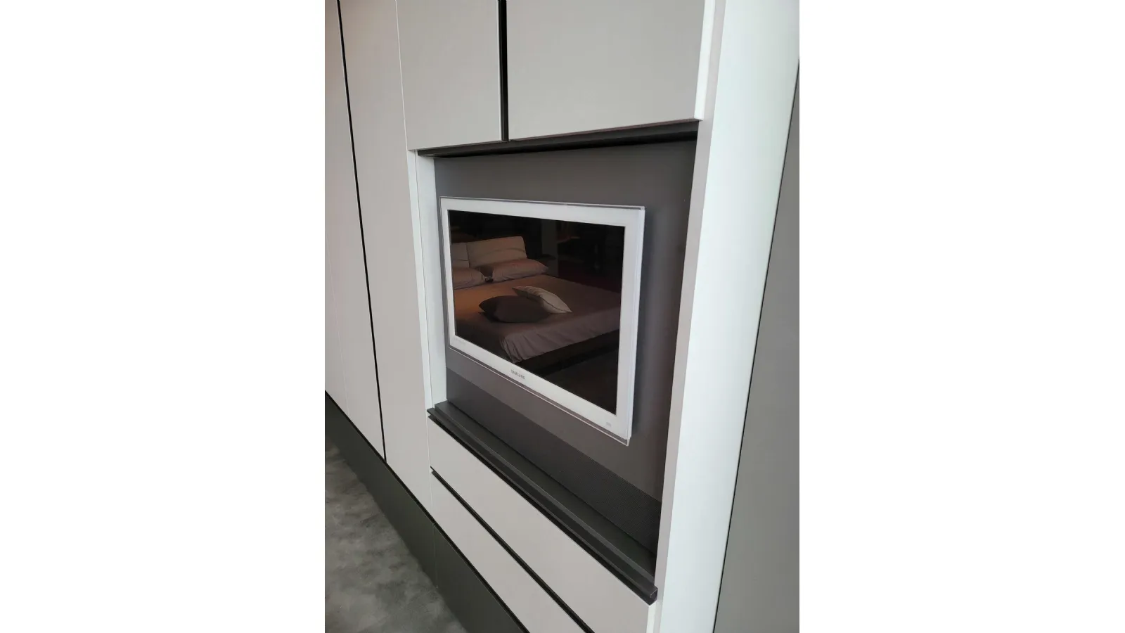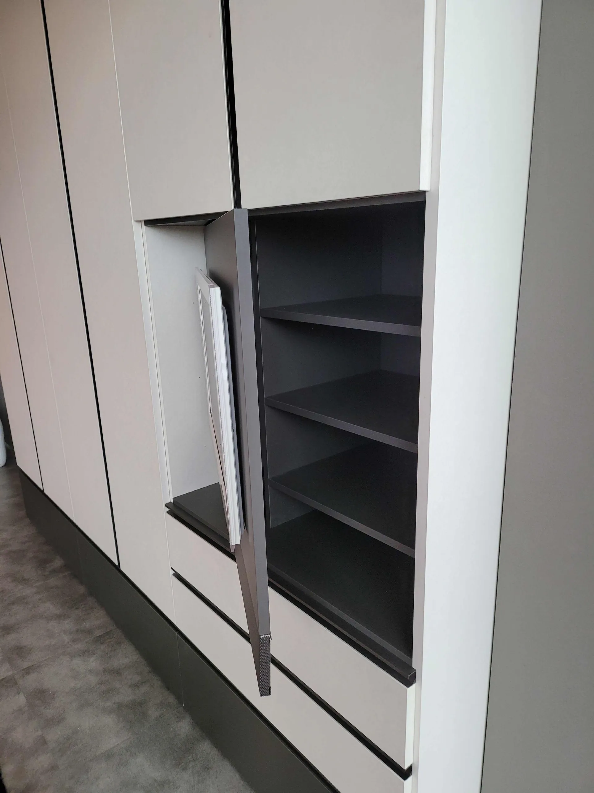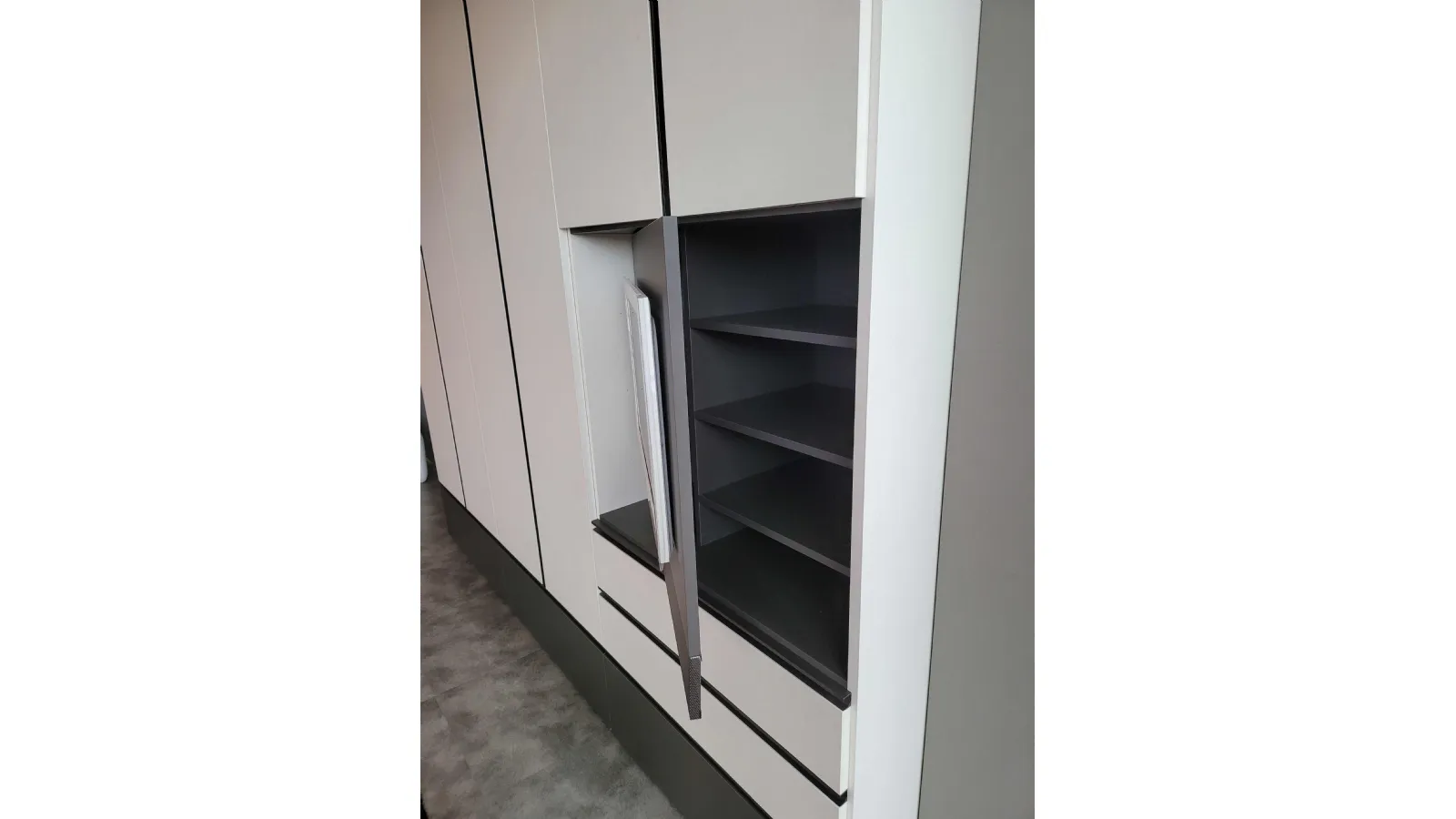 The external finish è in textured Canvas while the external drawers and the groove handle are in matt Anthracite textured finish