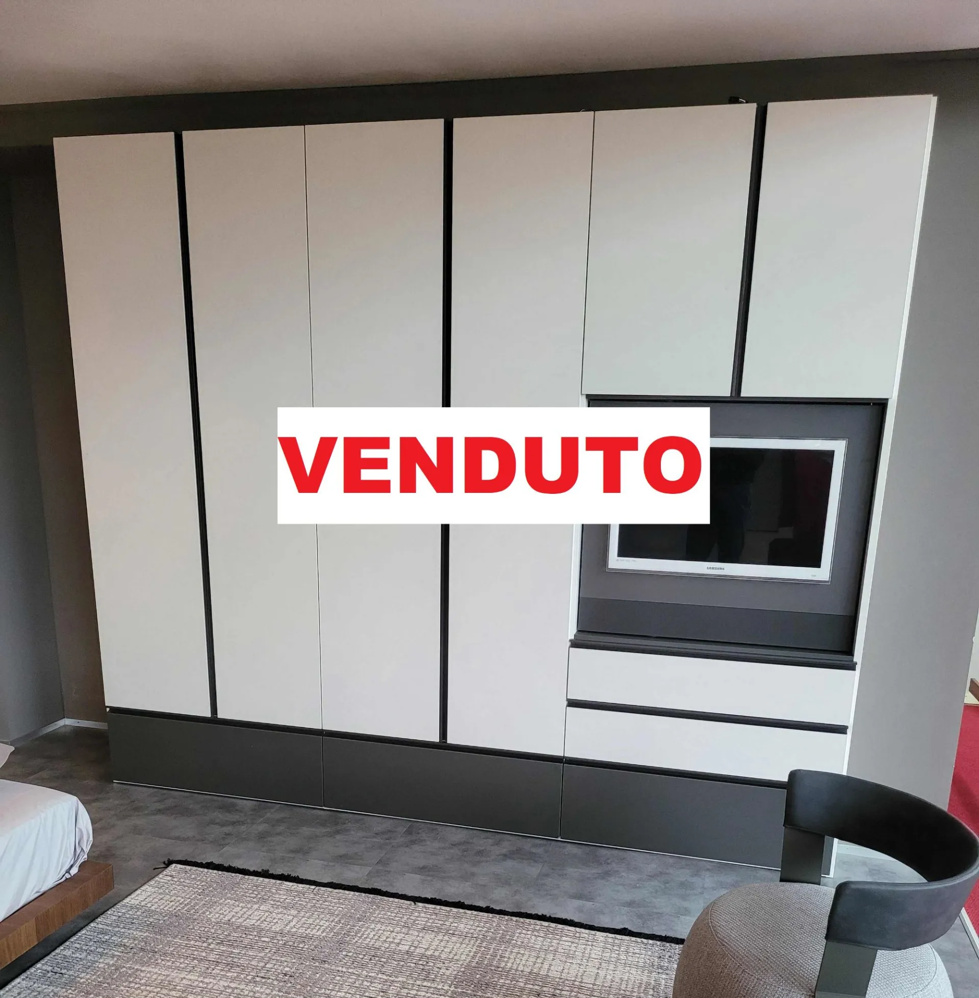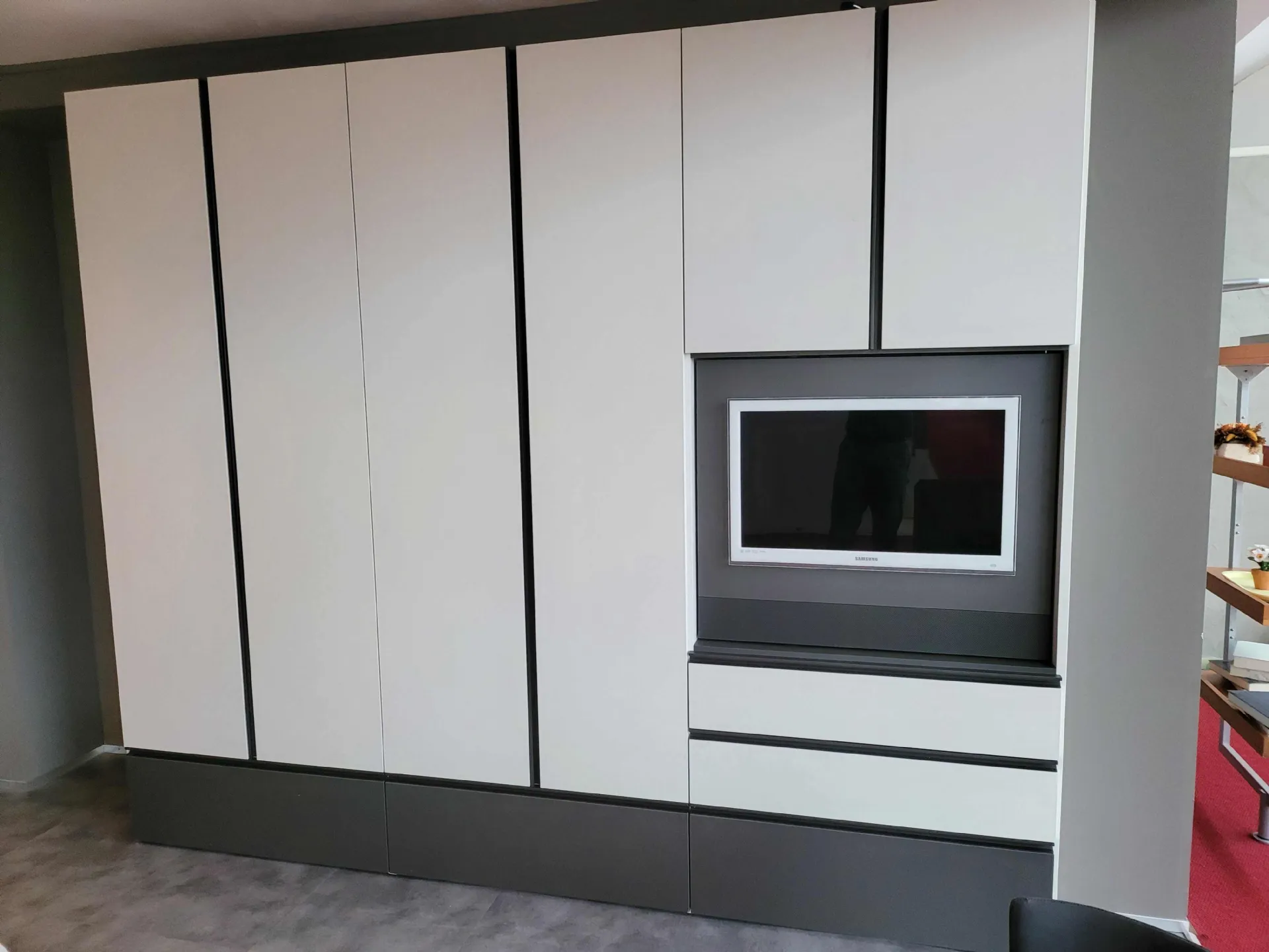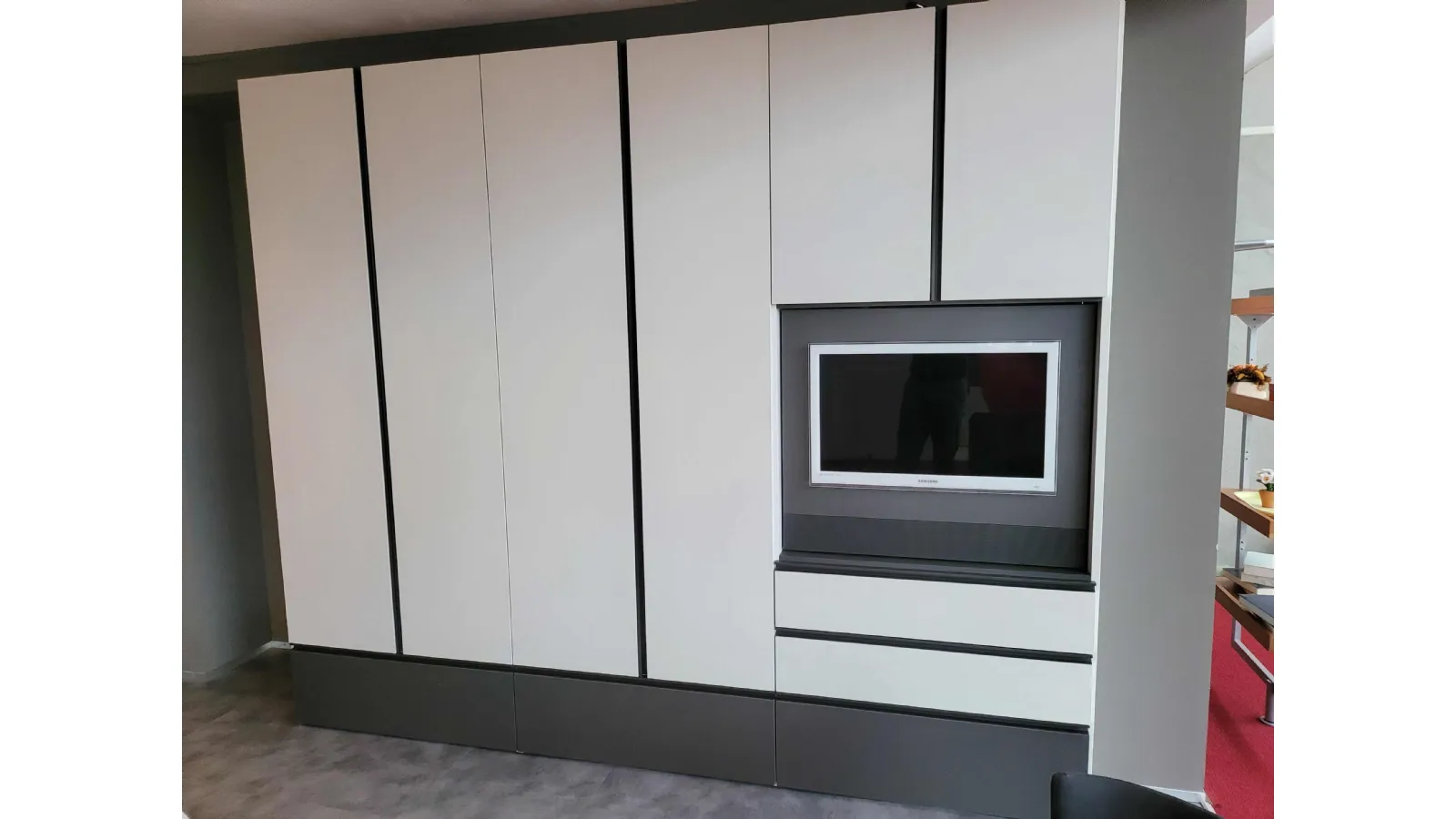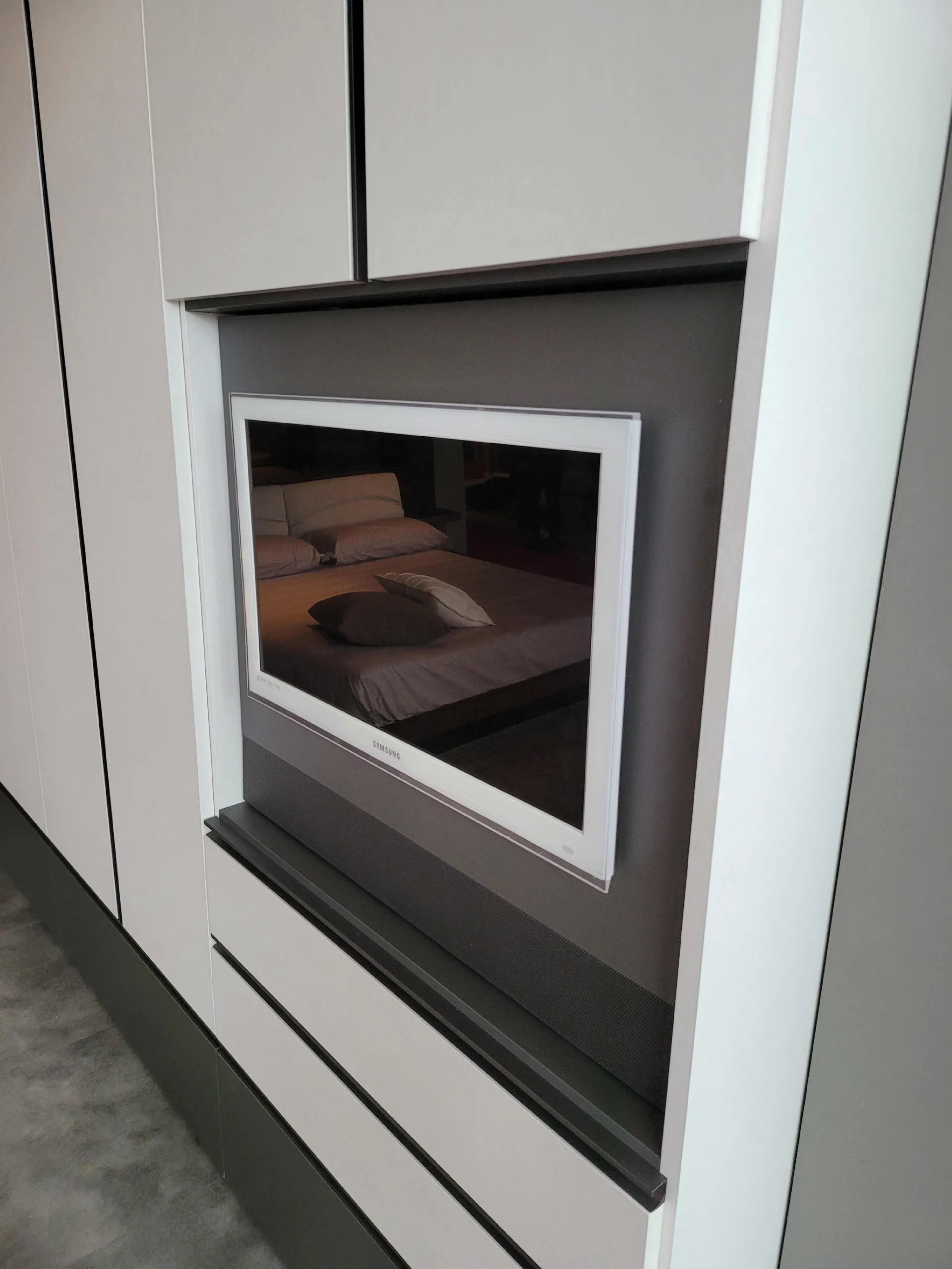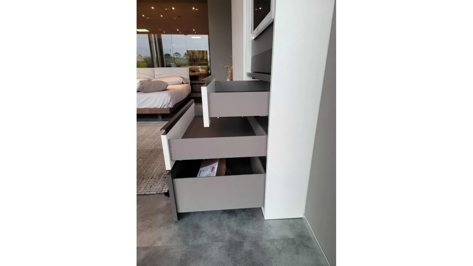 The external finish è in textured Canvas while the external drawers and the groove handle are in matt Anthracite textured finish
