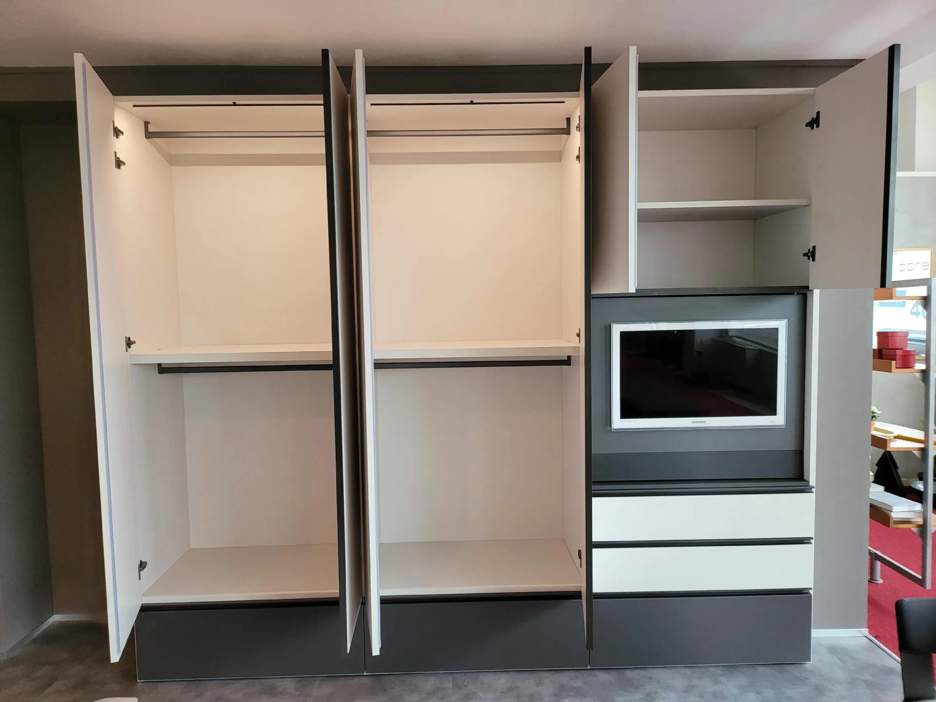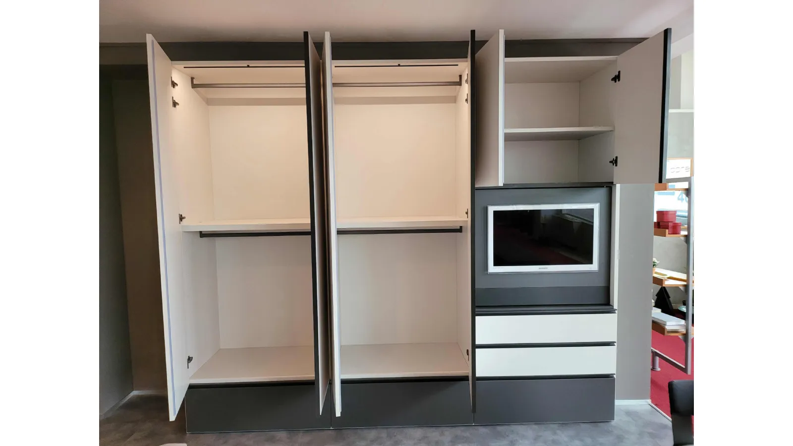 MODULA hinged wardrobe characterized by the presence of the adjustable TV panel. E’ comfortable and functional for those who want to have a television in the room without necessarily having to have a comò on which to place it
