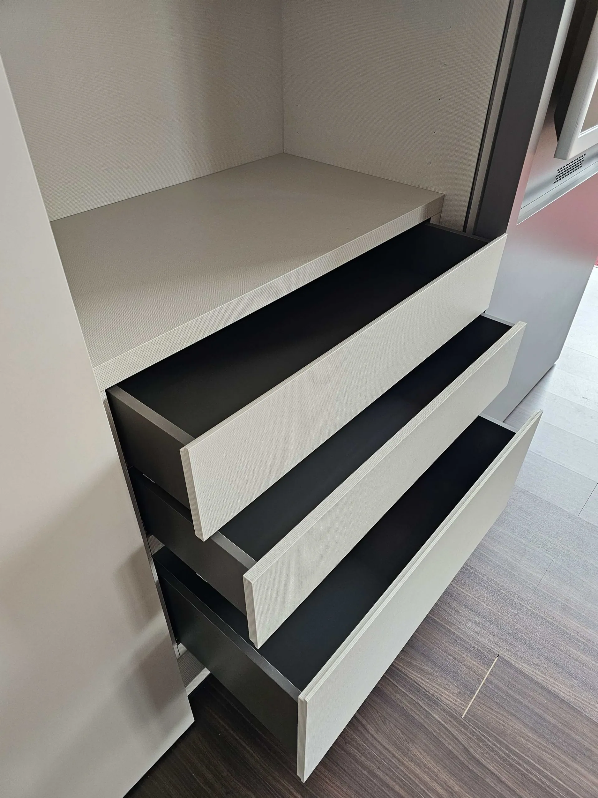 Sliding wardrobe Curtain Tape with front panels and visible parts in silk-like material, recessed handle in Matte Silk finish, interior in Bon Ton material, TV module in Ash matte lacquer finish with LED light. Total dimensions of cm. 304x66deep.x258h. Internal equipment: n.3 internal wood shelves, n.6 hanging rods and internal drawer unit with 2 drawers + 1 basket. Product available for immediate delivery. Contact us for more information.