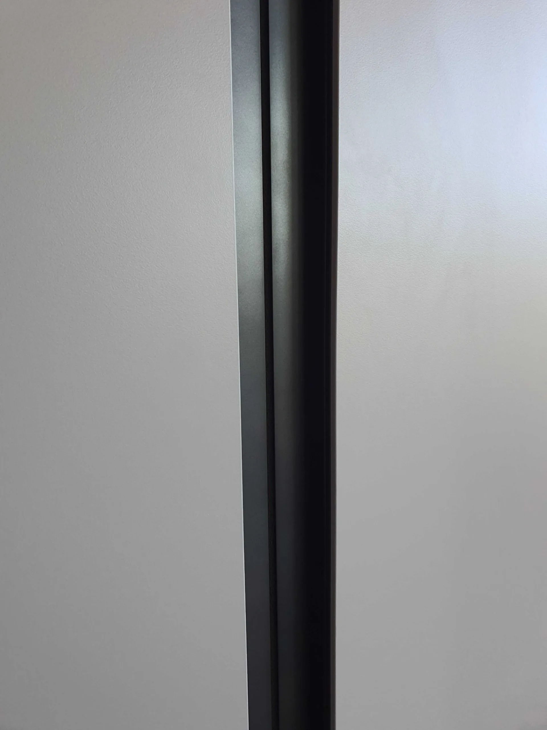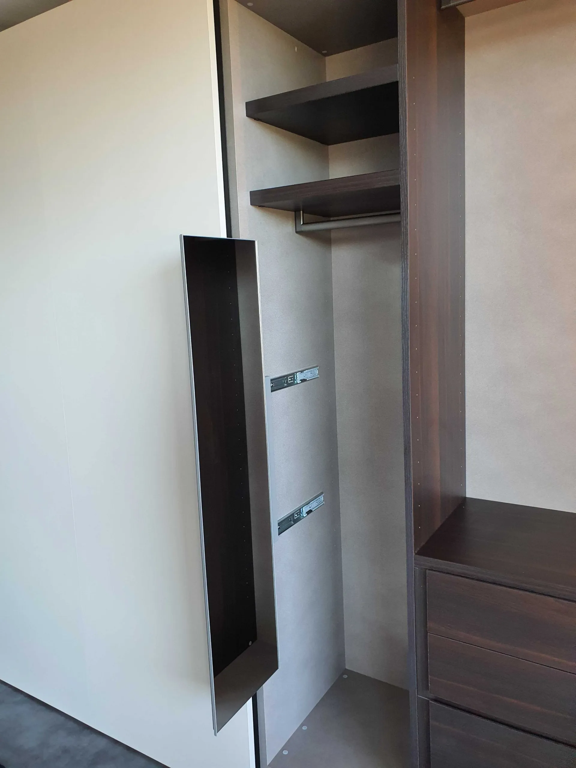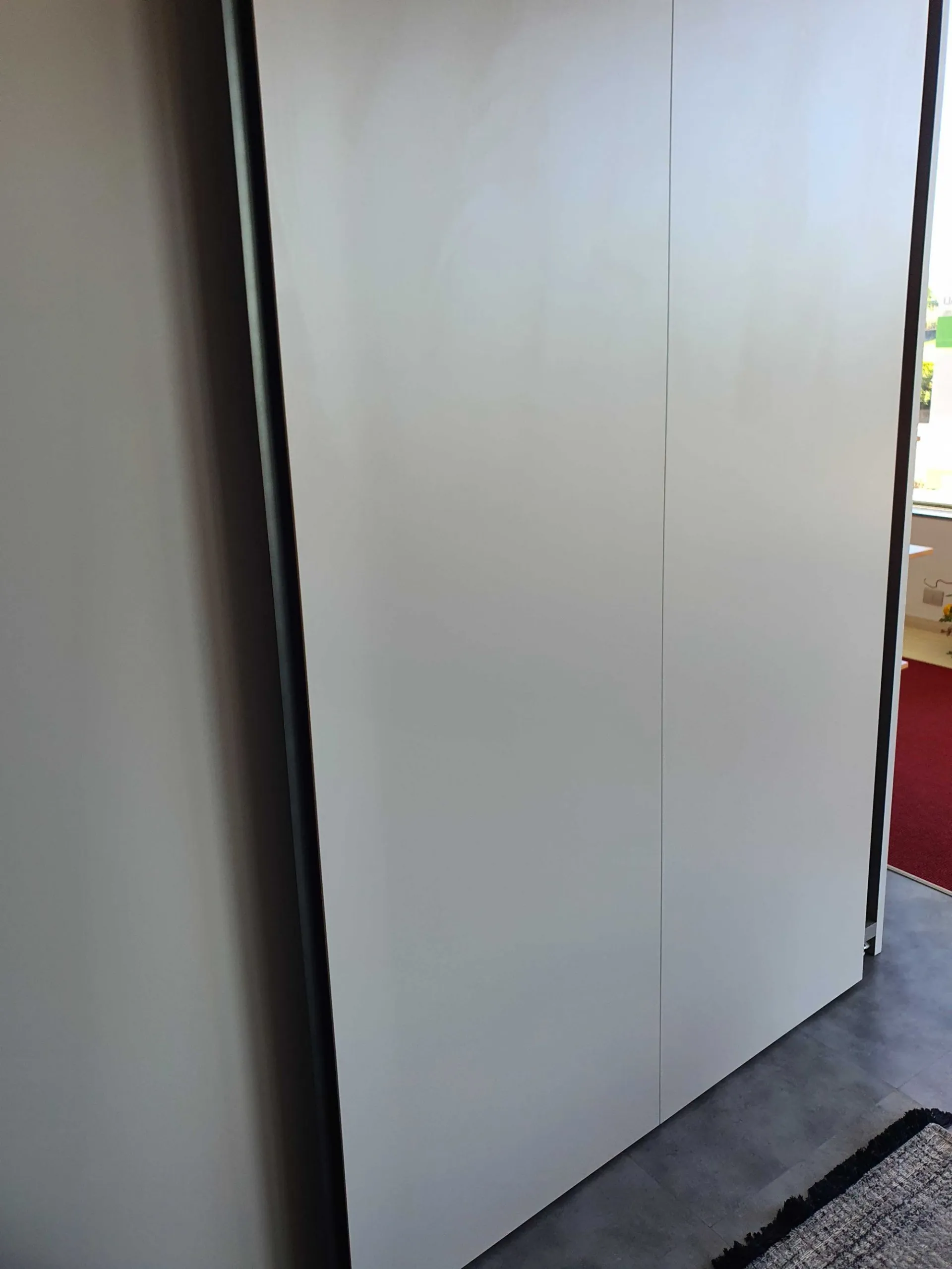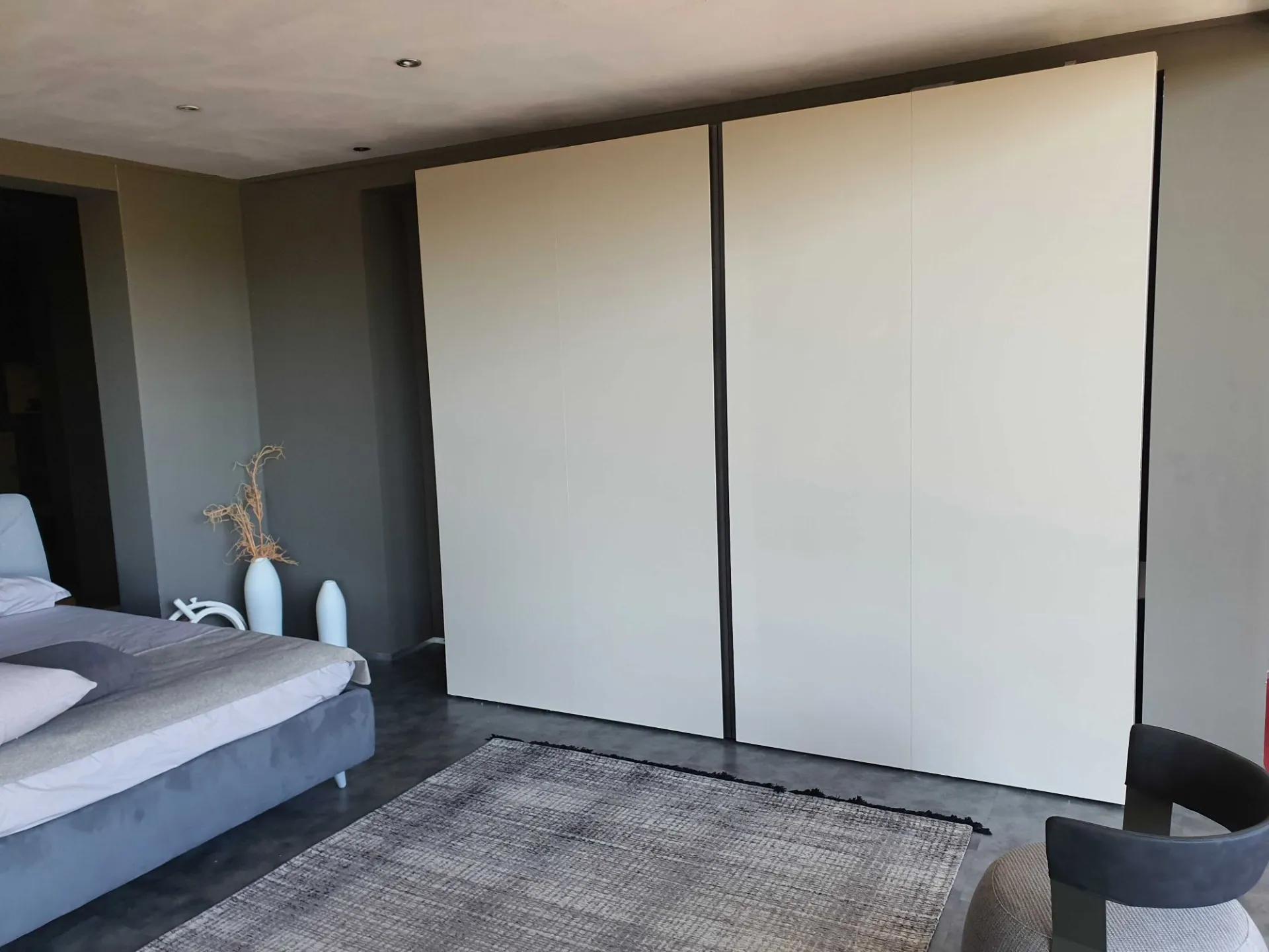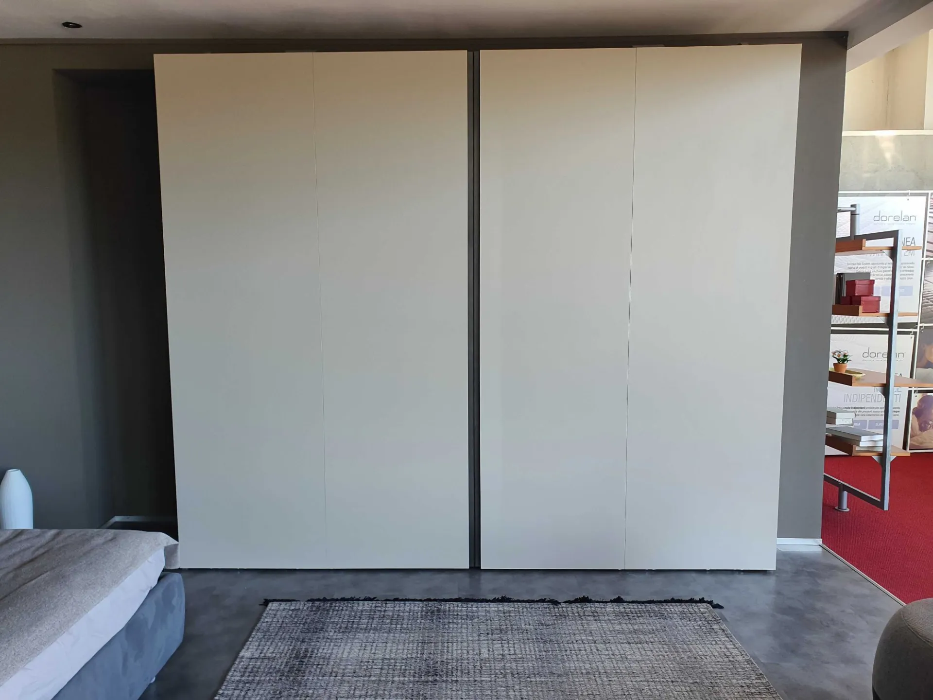 Sipario Nastro coplanar sliding wardrobe with fronts and visible parts in materic silk, groove handle in titanium finish.